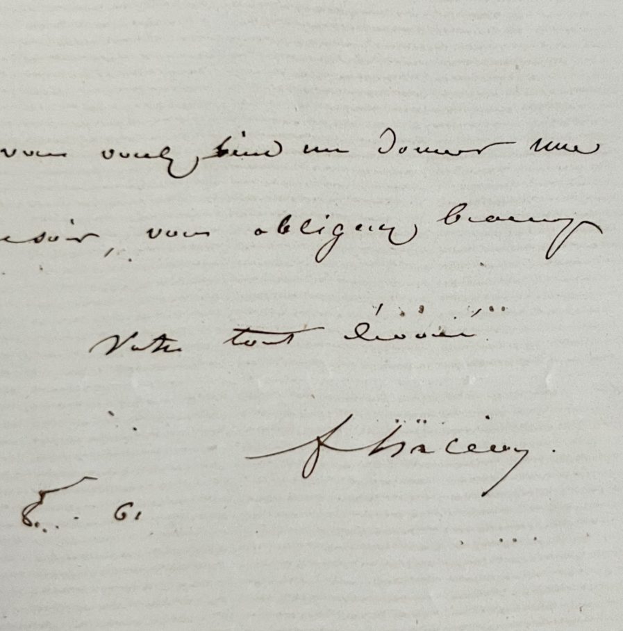 Fromental Halévy demande à Alphonse Royer, directeur de l'Opéra de Paris, "une stalle pour ce soir" [siège numéroté, dont le fond peut se lever et se baisser, qui est séparé des sièges contigus par des accoudoirs]. Il ajoute "vous m'obligeriez beaucoup".