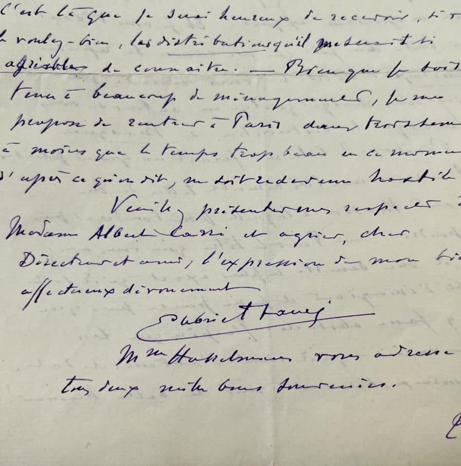 "Je suis ravi de la bonne nouvelle que m'a apporté votre télégramme, mais, je vous le répète, je suis navré de ne pouvoir assister à la première de Masques et Bergamasques tant je suis profondément certain que vous avez fait de cette petite oeuvre un spectacle exquis ! Et je vous disais aussi toute la joie que me cause la reprise de Pénélope. Si cela ne vous ennuie pas, voudriez-vous charger quelqu'un autour de vous, de m'envoyer la distribution de Masques et de Pénélope ? Cela me ferait un grand plaisir. J'ai reçu une très aimable lettre de Fernand Masson à laquelle je ne tarderai pas à répondre. Pour le titre que vous avez choisi, il me semble le plus exact qu'il soit possible d'imaginer et je ne pense pas que Fauchois y fasse obstacle. J'espère que les succès variés qu'il vient d'obtenir et dont je suis heureux l'auront mis de belle humeur ! [...]". Fauré regrette de ne plus être à Monte Carlo au moment où Albert Carré y sera : "Entre nous, la vie d'ici un peu trop mouvementée pour un convalescent et aussi - l'avouerai-je - le sentiment qu'il faut se restreindre, m'a décidé à quitter ce décor de Monte-Carlo. Demain soir, je serai installé à Tamaris-sur-mer [Var] au Grand Hôtel, le seul d'ailleurs, de l'endroit [...]". Il espère de nouveau que ce sera, là, à Tamaris, qu'il recevra des nouvelles de la distribution de ses oeuvres, etc.