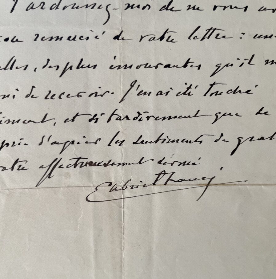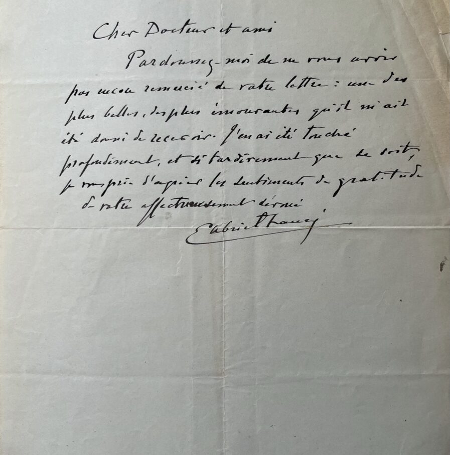 "Cher Docteur et ami. Pardonnez-moi de ne vous avoir pas encore remercié de votre lettre : une des plus belles, des plus émouvantes qu'il m’ait été donné de recevoir. J’en ai été touché profondément, et si tardivement que ce soit, je vous prie d’agréer, les sentiments de gratitude de votre affectueusement dévoué Gabriel Fauré".