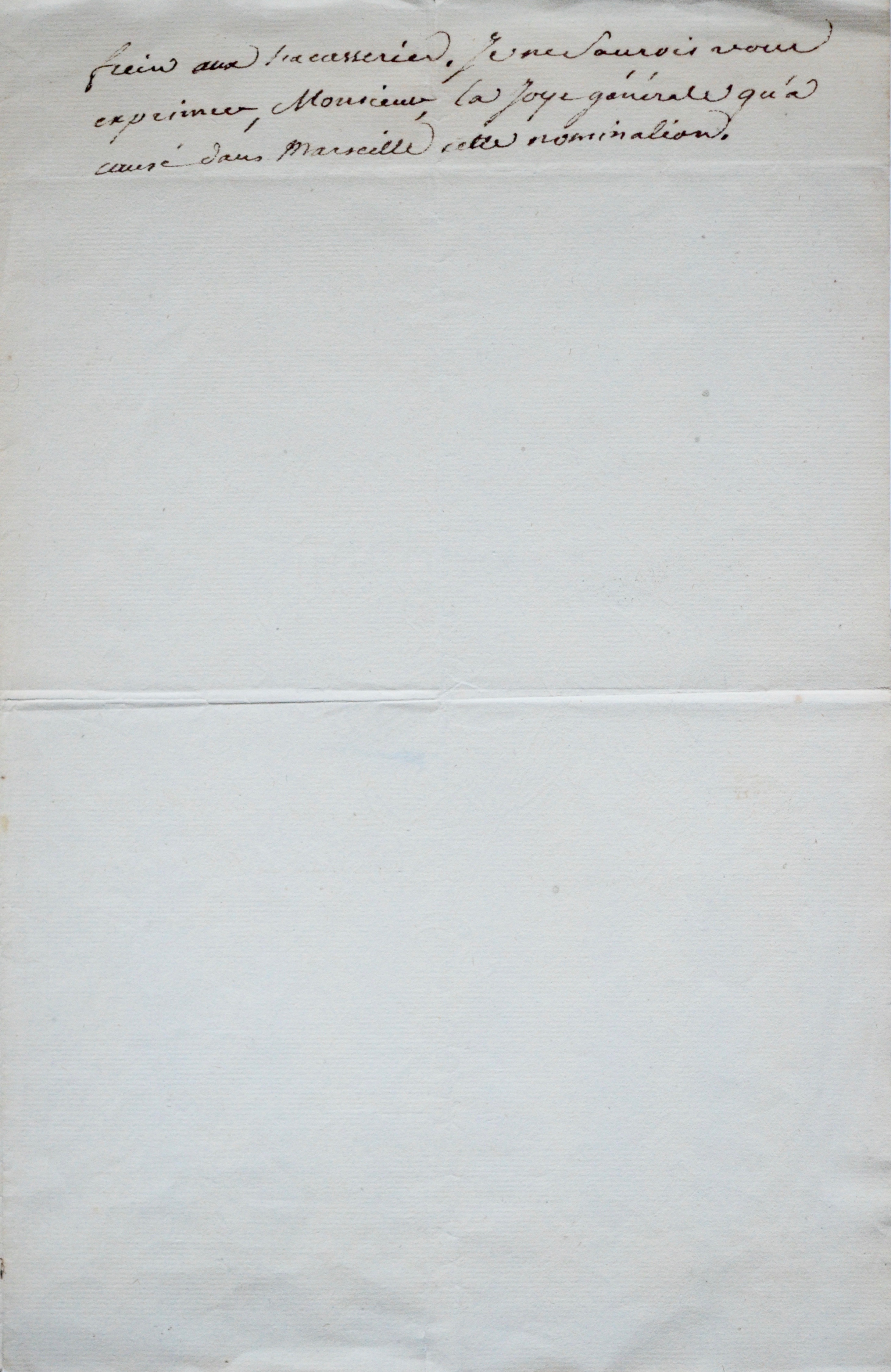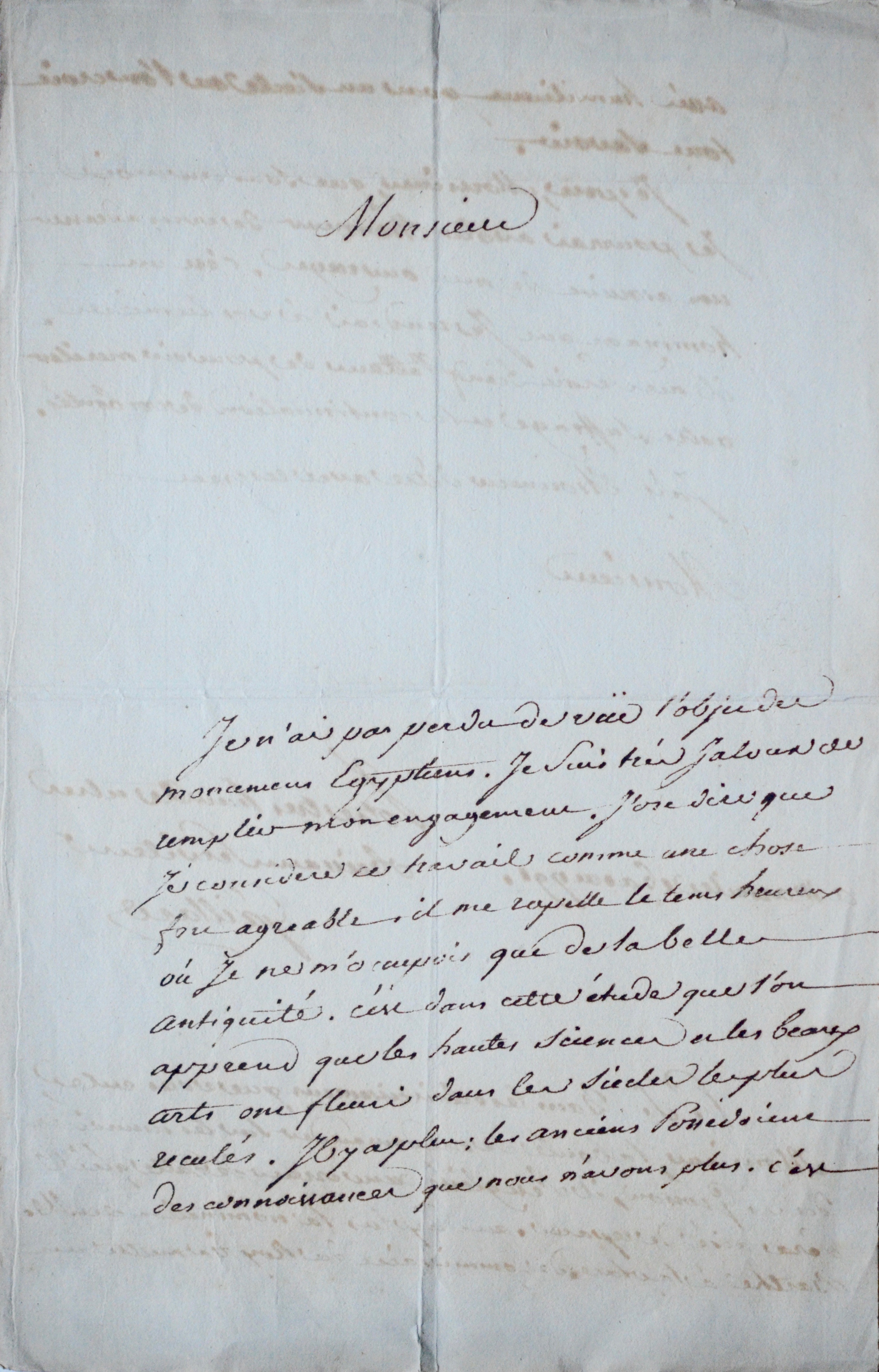"[...] Je n'ai pas perdu de vüe l'objet des monumens Egyptiens. Je suis très jaloux de remplir mon engagement. J'ose dire que je considere ce travail comme une chose fort agréable, il me rappelle le tems heureux où je ne m'occupois que de la belle antiquité. C'est dans cette étude que l'on apprend que les hautes sciences et les beaux arts ont fleuri dans les siècles les plus reculés [...]". Il propose d'envoyer ses ouvrages à son correspondant et se réjouit de la nomination de M. Barthe à la place de commissaire du Roy.