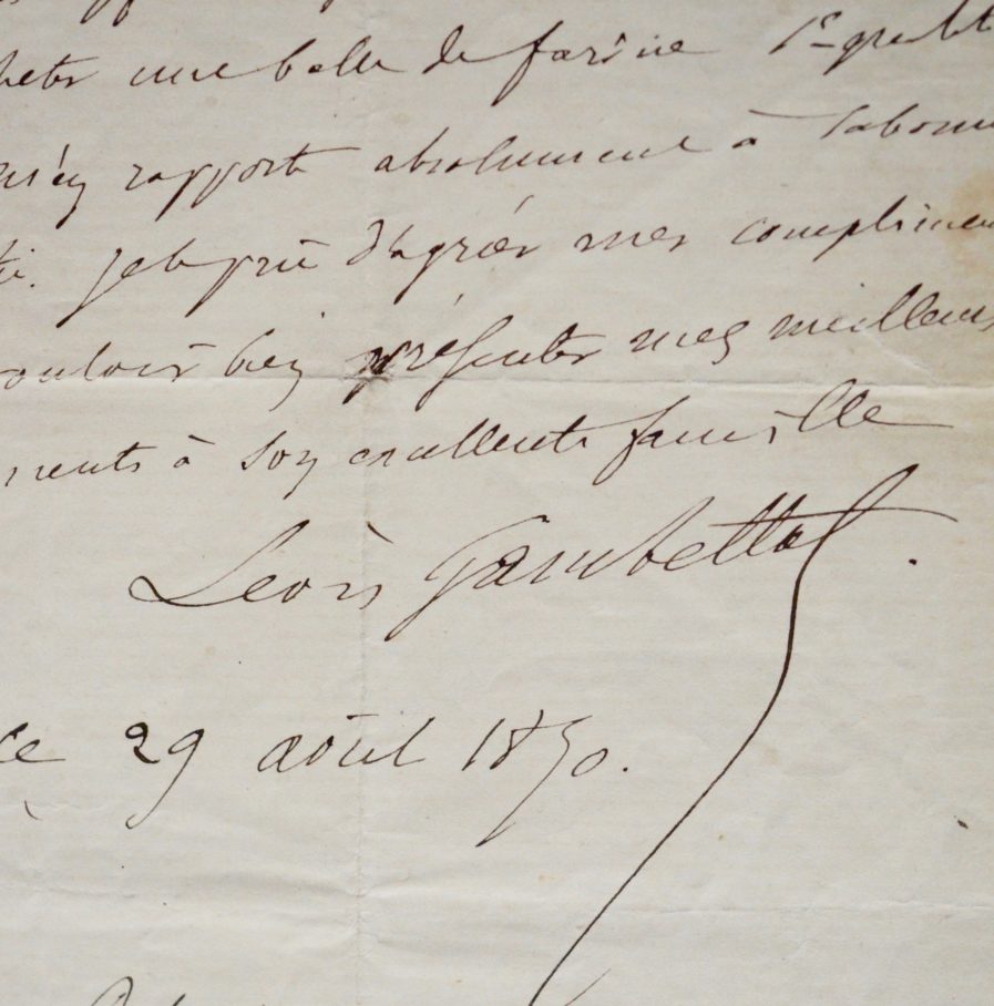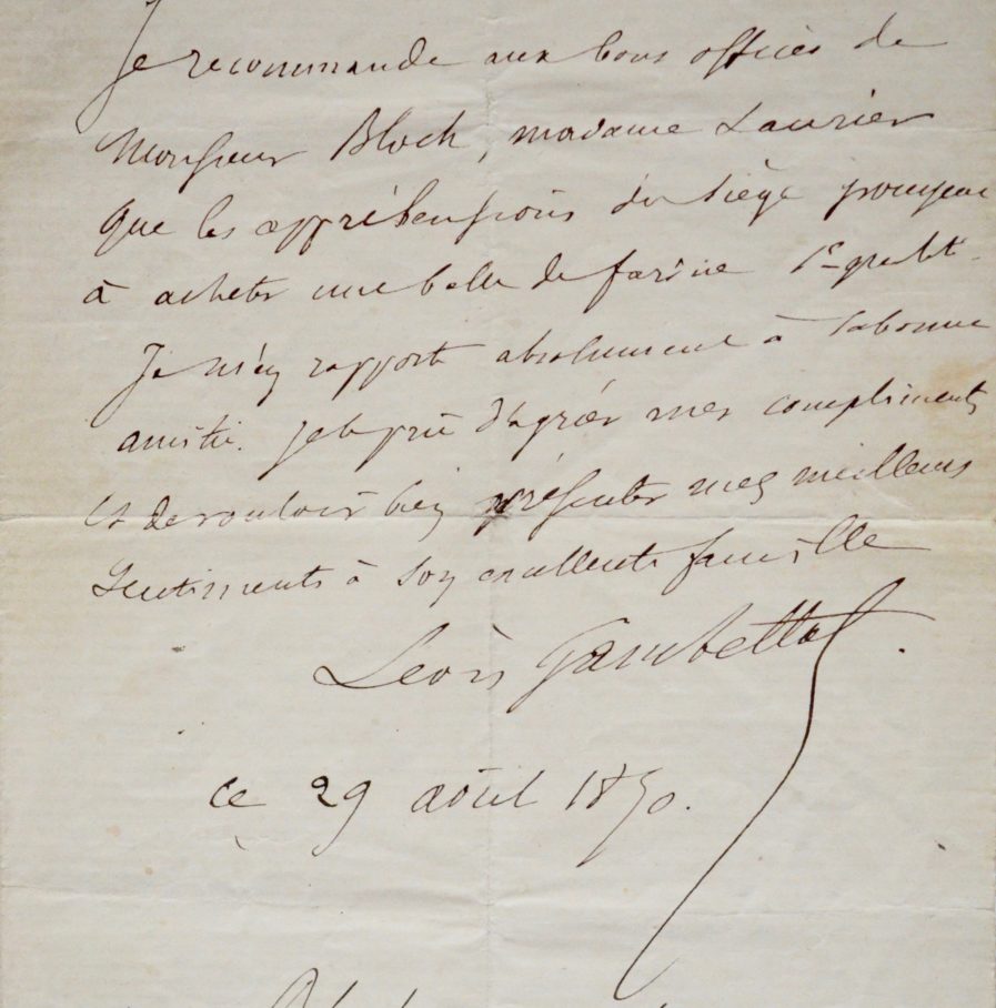 Alors qu'on entrevoit le siège de Paris, Gambetta, recommande aux bons soins de M. Bloch "Mme Laurier que les appréhensions du Siège poussent à acheter une balle de farine 1ère qualité. Je m'en rapporte absolument à la bonne amitié [...]".