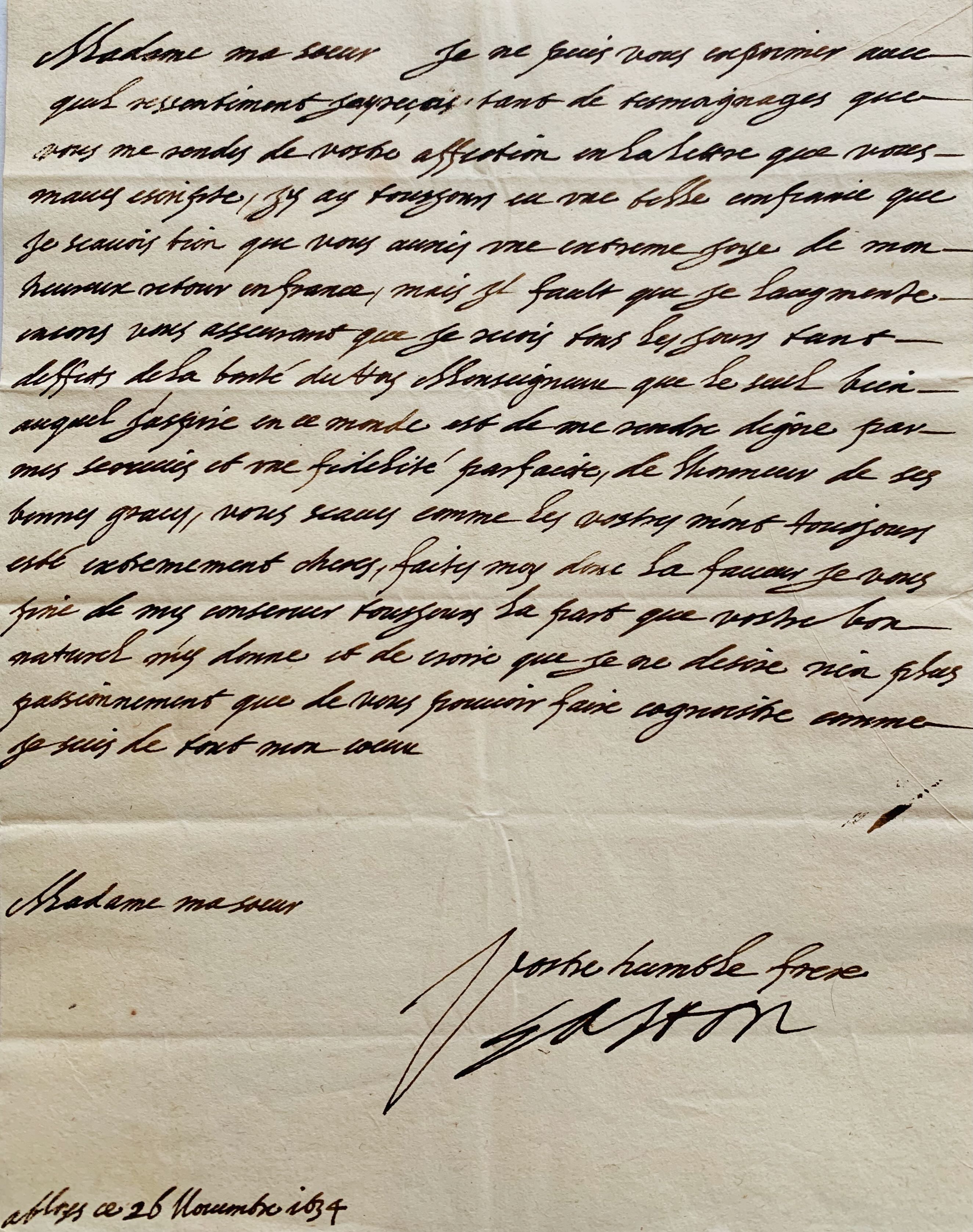 "Madame ma soeur, je ne puis vous exprimer avec quel ressentiment japerçois tant de tesmoignages que vous me rendez de vostre affection en la lettre que vous mavez escripte. Jy ay tousjours eu une belle confiance que je scavois que vous auriez une extreme joye de mon heureux retour en France, mais il fault que je laugmente encores vous asseurant que je reçois tous les jours tant deffets de la bonté du Roy Monseigneur que le seul bien auquel jaspire en ce monde est de me rendre digne par mes services et une fidélité parfaite, de l'honneur de ses bonnes graces, vous scavez comme les vostres m'ont tousjours esté extremement cheres, faites moy donc la faveur je vous prie de my conserver tousjours la part que vostre bon naturel my donne [...]".