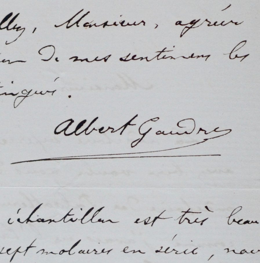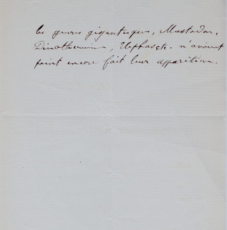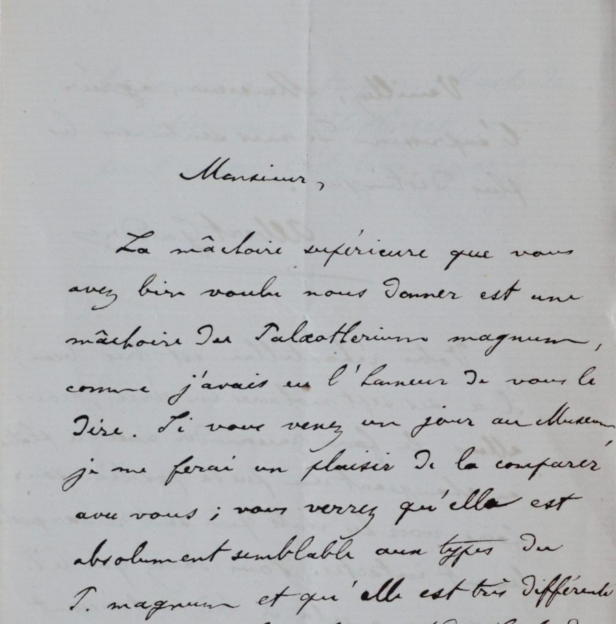 "[...] La mâchoire supérieure que vous avez bien voulu nous donner est comme j'avais eu l'honneur de vous le dire. Si vous venez un jour au Muséum, je me ferai un plaisir de la comparer avec vous ; vous verrez qu'elle est absolument semblable aux types du P. magnum et qu'elle est très différente de celle des Coryphodons et des Laphiadons animaux d'un âge un peu plus ancien [...]. Votre échantillon est très beau ; il a ses sept molaires en série, mais allons le faire raccommoder avec du plâtre en changeant un peu sa position pour faire voir les dents qui sont remarquablement intactes. Vous savez que le P. Magnum a cela de très intéressant que c'est un des plus grands représentants des années mammifères (terrain tertiaire inférieur). A l'époque où il a vécu, les genres gigantesques, Mastodon, Dinotherium [...], n'avaient point encore fait leur apparition."