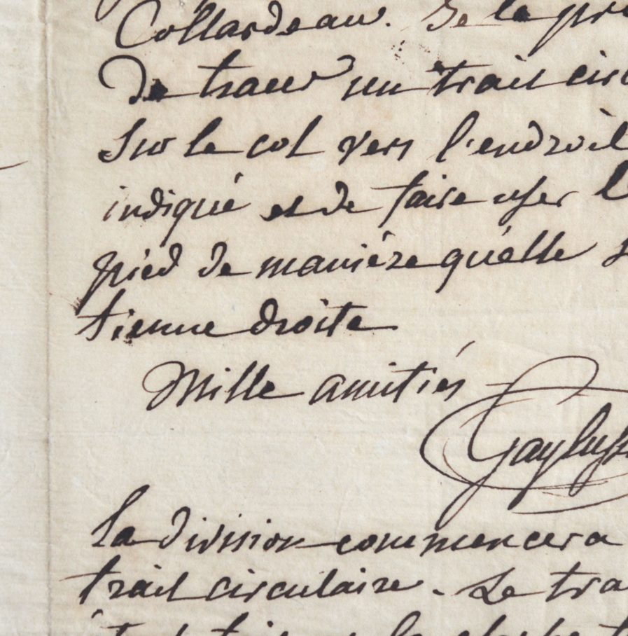 Instructions données par Gay-Lussac pour la finition une cloche. "J'envoie la cloche dont j'ai parlé hier à Mr Collardeau. Je le prie de tracer un trait circulaire sur le col vers l'endroit indiqué et de faire user le pied de manière qu'elle se tienne droite [...]. La division commencera au trait circulaire. Le trait étant fait et la cloche fermée avec un bouchon, on met de l'eau jusqu'au trait".