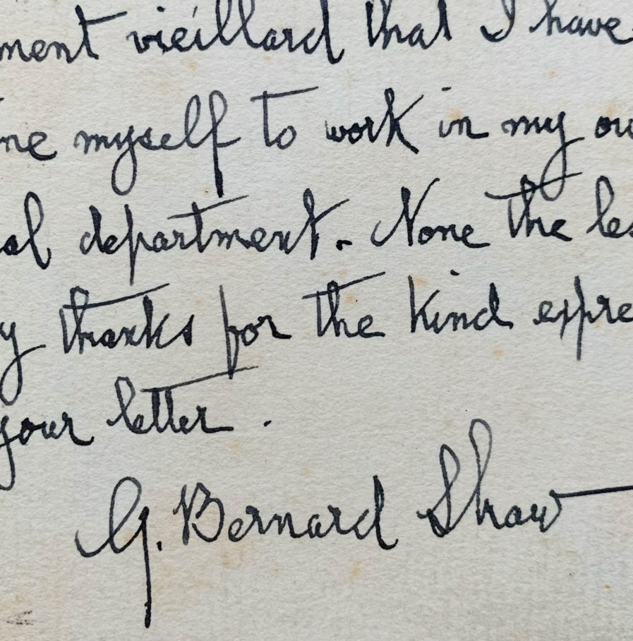 Il est joint une belle photographie de presse de 1946 de George Bernard Shaw âgé, lisant dans son lit, après un accident à la jambe (22,5 x 18 cm).