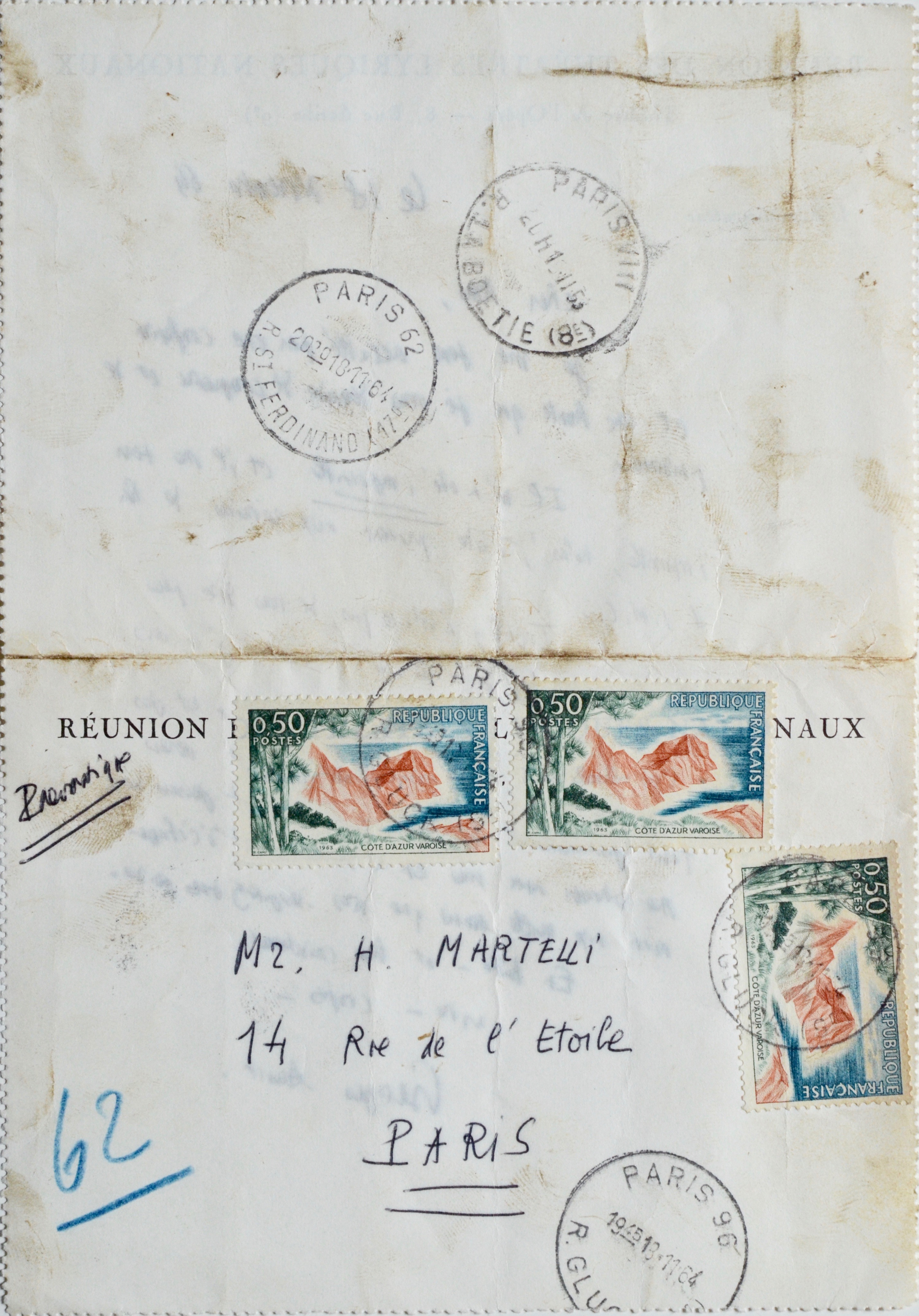 Stylo à bille noir sur papier à en-tête de la "Réunion des Théâtres Lyriques Nationaux - L'administrateur". Adresse au verso avec timbres et marques postales.