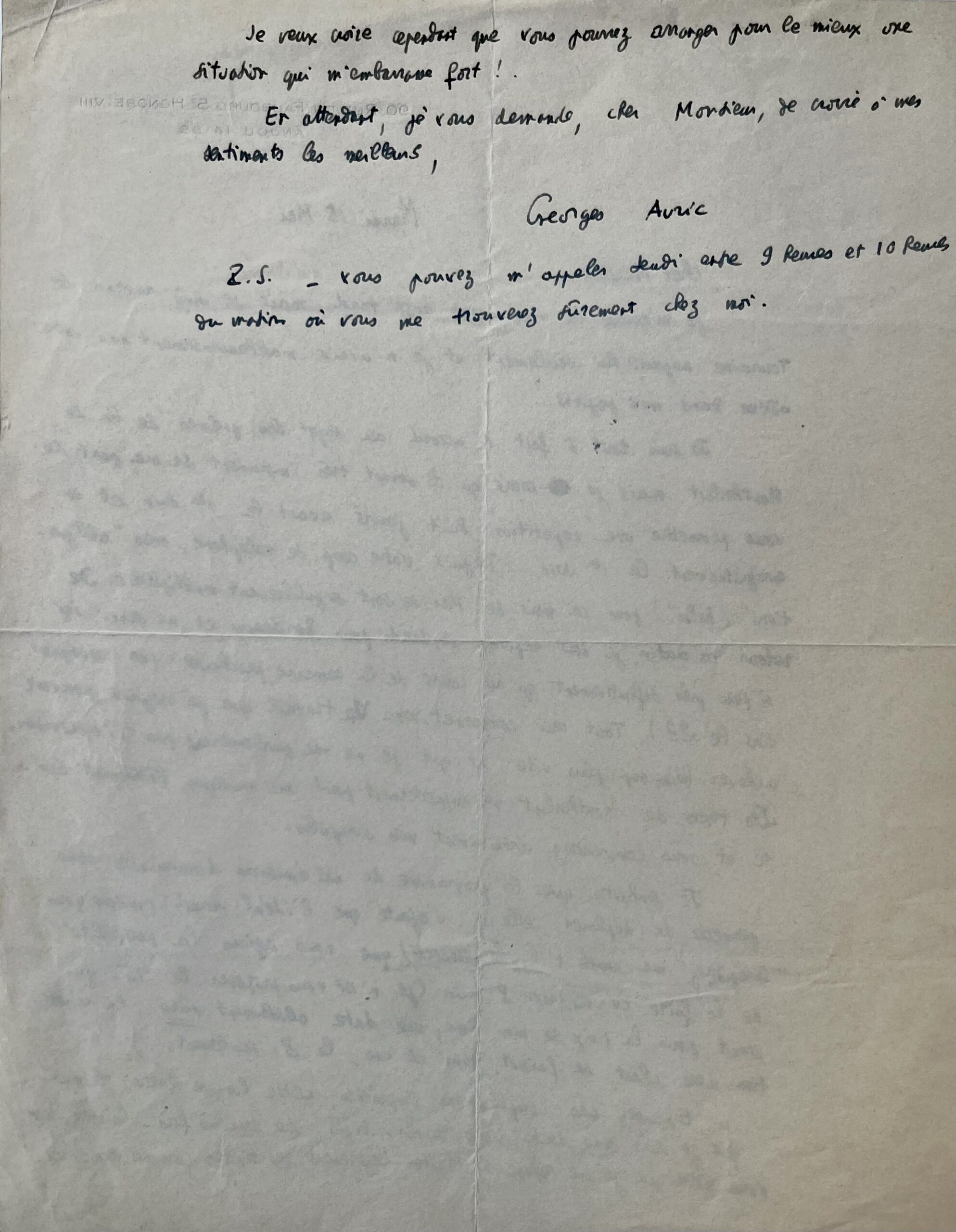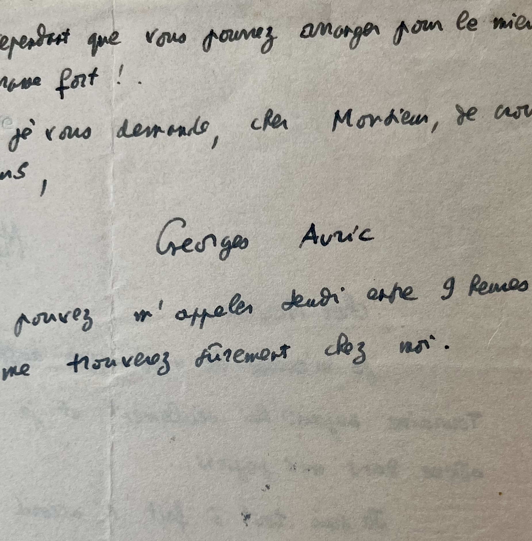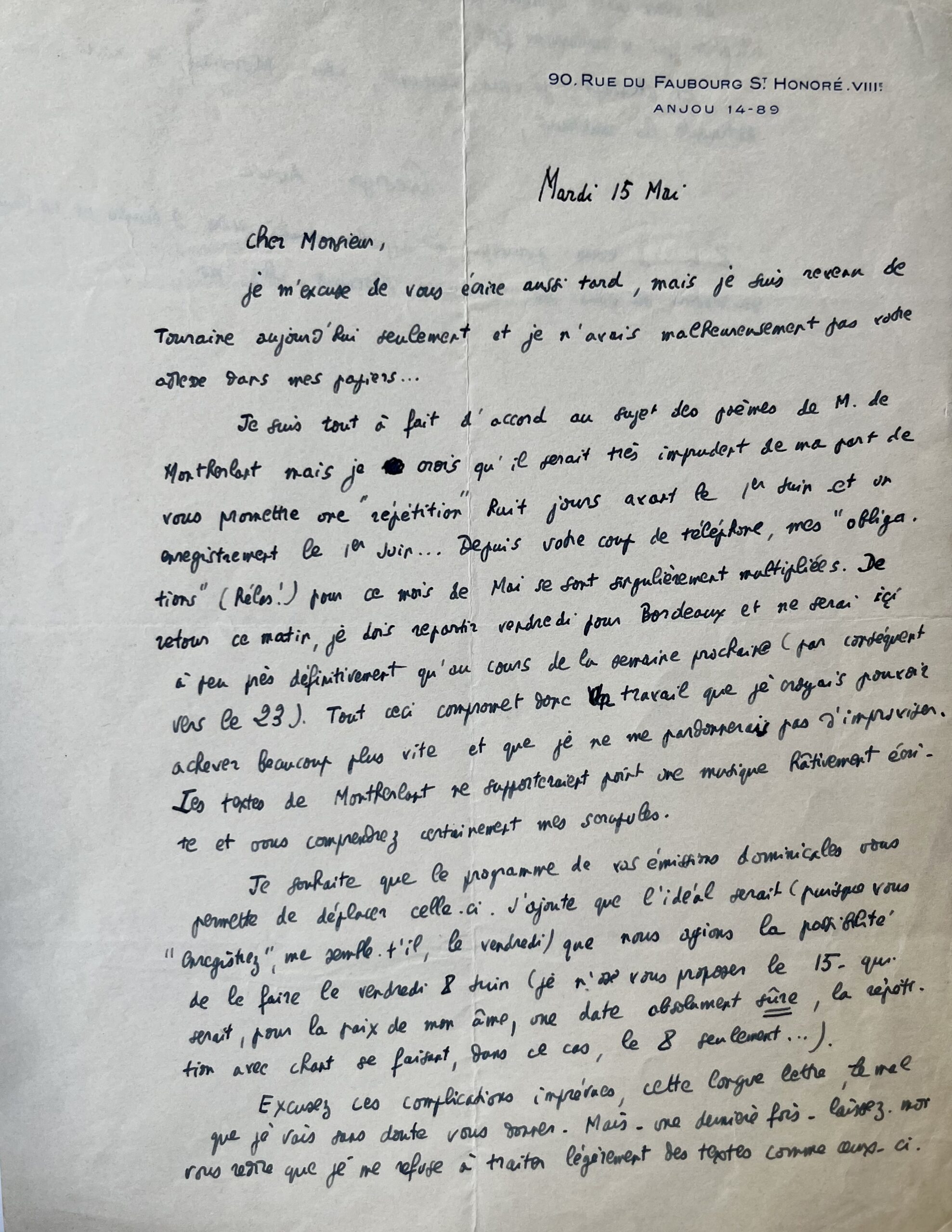 "[...] Je suis tout à fait d'accord au sujet des poèmes de M. de Montherlant, mais je crois qu'il serait très imprudent de ma part de vous promettre une «répétition» huit jours avant le 1er juin et un enregistrement [...]. Tout ceci compromet donc un travail que je croyais pouvoir achever beaucoup plus vite et que je ne me pardonnerais pas d'improviser. Les textes de Montherlant ne supporteraient point une musique hâtivement écrite et vous comprendrez certainement mes scrupules [...].". Il propose comme première date le 8 juin voir le 15 "pour la paix de mon âme, une date absolument sûre, la répétition avec chant se faisant, dans ce cas, le 8 seulement." Auric est désolé de ces conplications, insiste encore sur la tâche qui lui est confiée et se refusant "à traiter légèrement des textes comme ceux-ci". Il ajoute "Je veux croire cependant que vous pourrez arranger pour le mieux une situation qui m'embarrasse fort [...]".