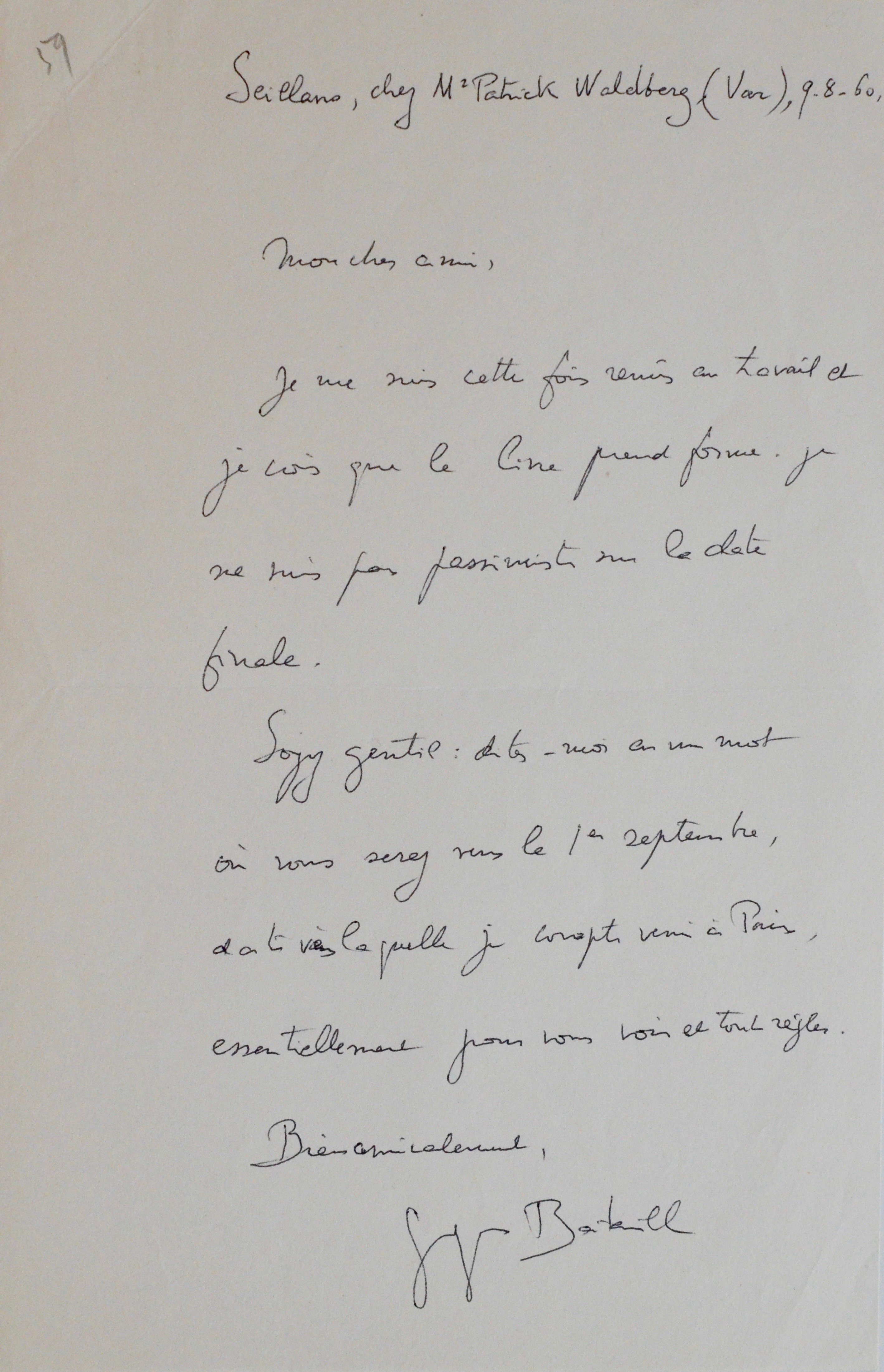 À propos de son ouvrage à venir, Les Larmes d'Éros : "Je me suis cette fois remis au travail et je crois que le livre prend forme. Je ne suis pas pessimiste sur la date finale [...]". Bataille s'enquiert de la date de retour à Paris de son correspondant, dans le but de l'y rencontrer et de "tout régler".