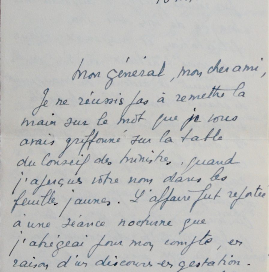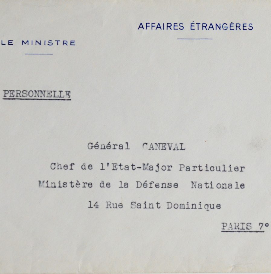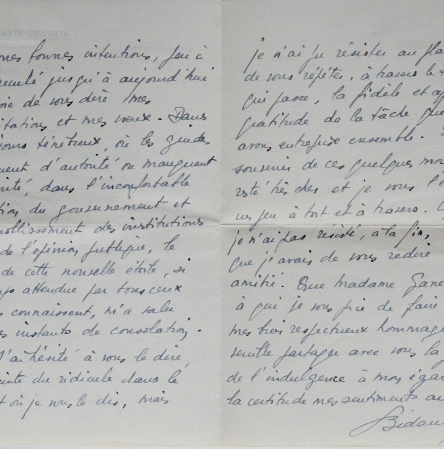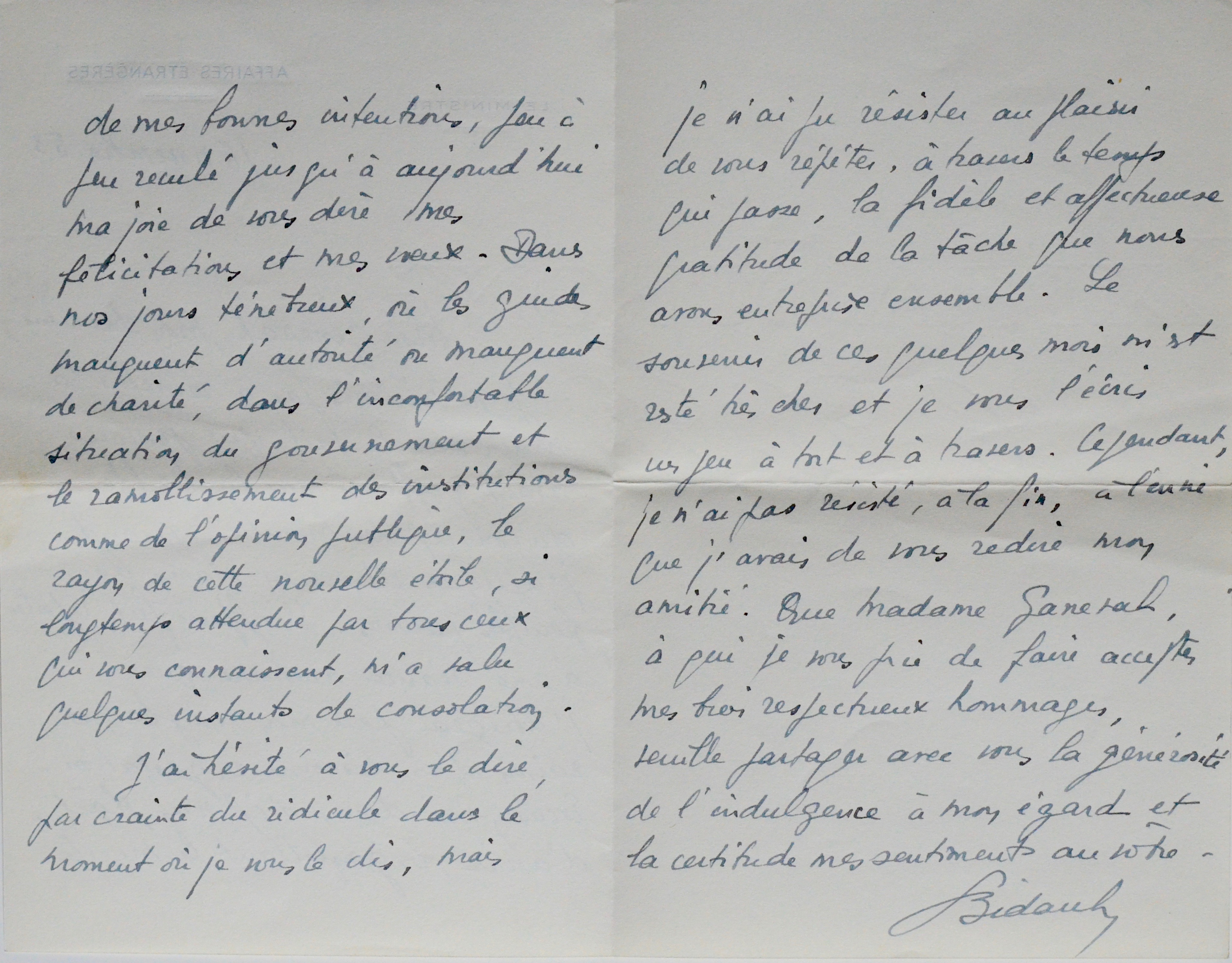 Georges Bidault (Moulins, 1899/1983)Georges Bidault, ministre des Affaires Étrangères, félicite son ami Jean Ganeval pour sa promotion au grade de Général de corps d'armée. "Dans nos jours ténébreux, où les guides manquent d'autorité ou manquent de charité, dans l'inconfortable situation du gouvernement et le ramollissement des institutions comme de l'opinion publique, le rayon de cette nouvelle étoile, si longtemps attendue par tout ceux qui vous connaissent, m'a valu quelques instants de consolation [...]". Il évoque encore le souvenir de "la tâche que nous avons entreprise ensemble".