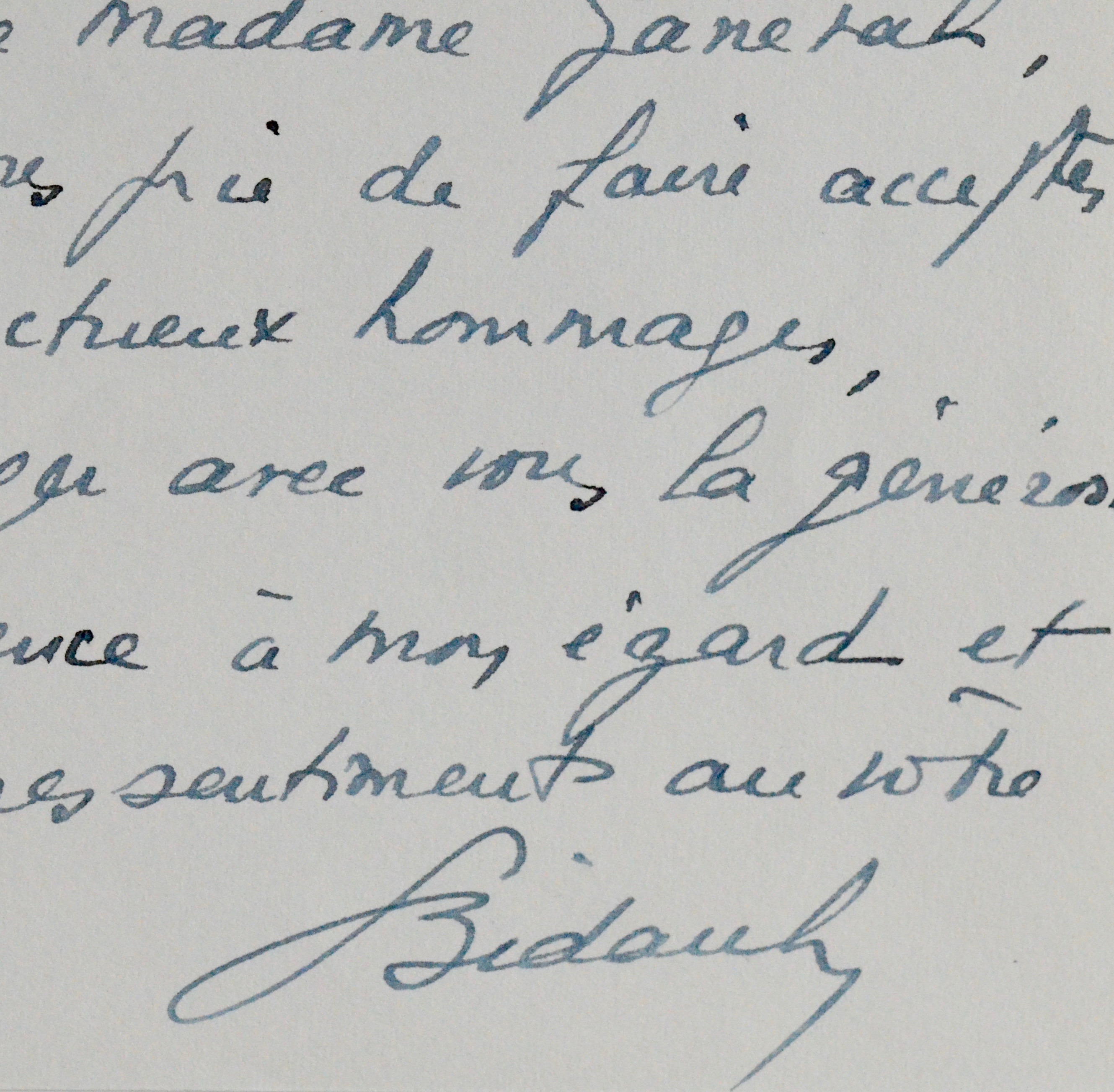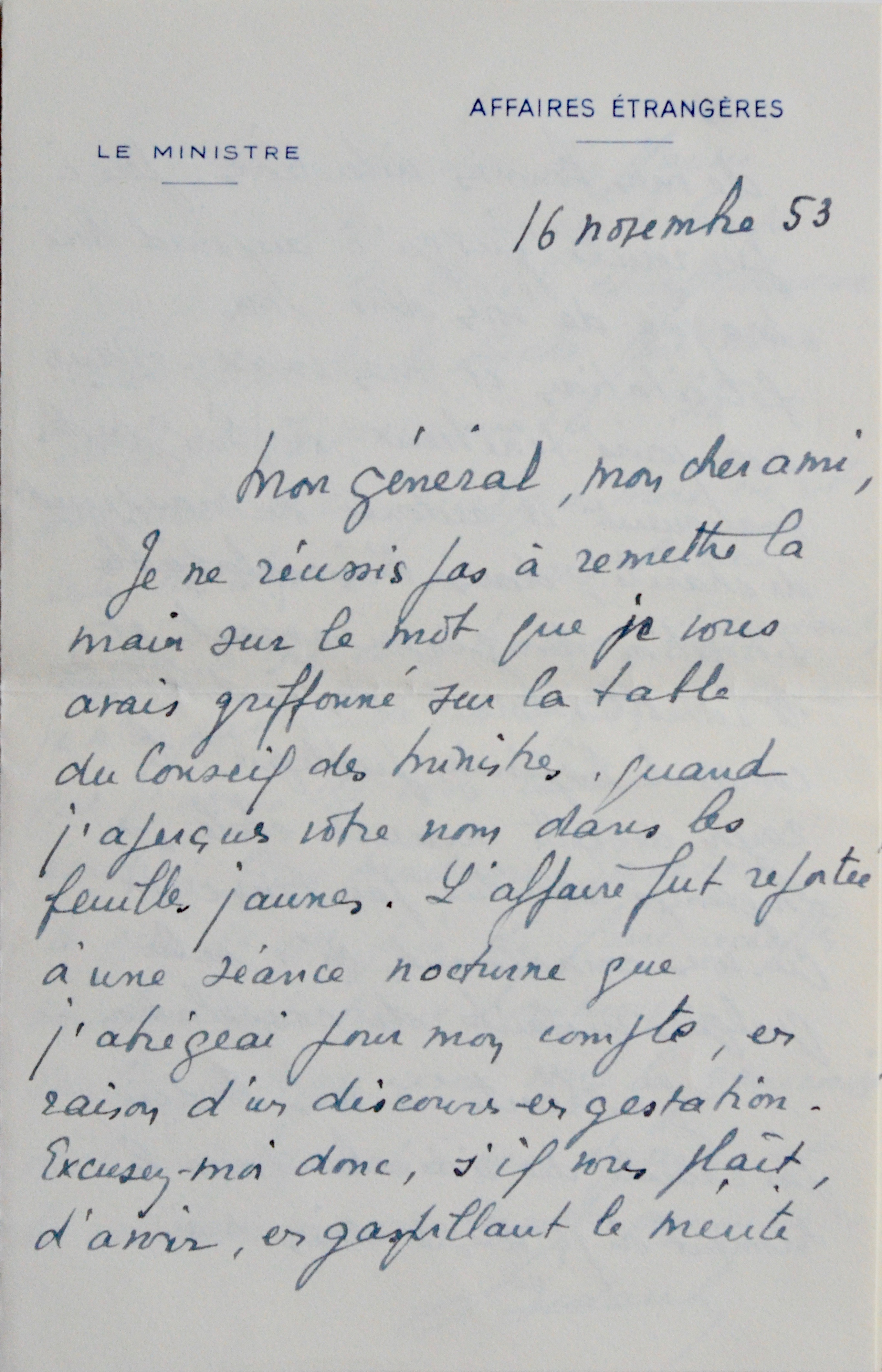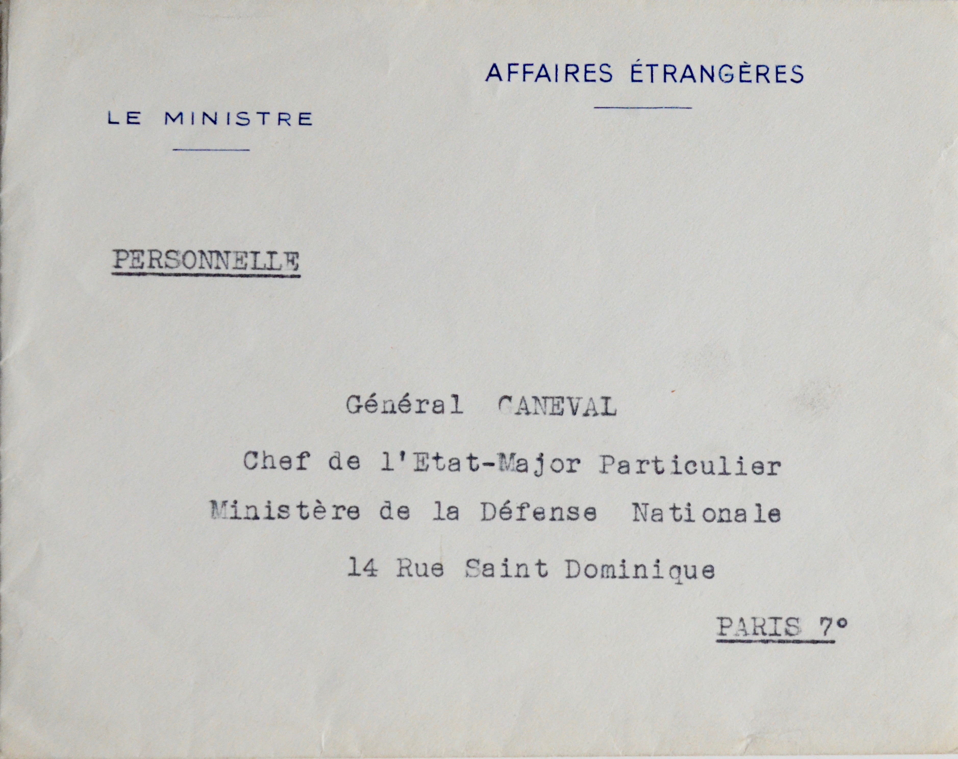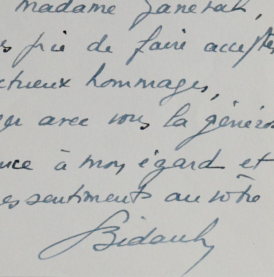 Georges Bidault (Moulins, 1899/1983)Georges Bidault, ministre des Affaires Étrangères, félicite son ami Jean Ganeval pour sa promotion au grade de Général de corps d'armée. "Dans nos jours ténébreux, où les guides manquent d'autorité ou manquent de charité, dans l'inconfortable situation du gouvernement et le ramollissement des institutions comme de l'opinion publique, le rayon de cette nouvelle étoile, si longtemps attendue par tout ceux qui vous connaissent, m'a valu quelques instants de consolation [...]". Il évoque encore le souvenir de "la tâche que nous avons entreprise ensemble".