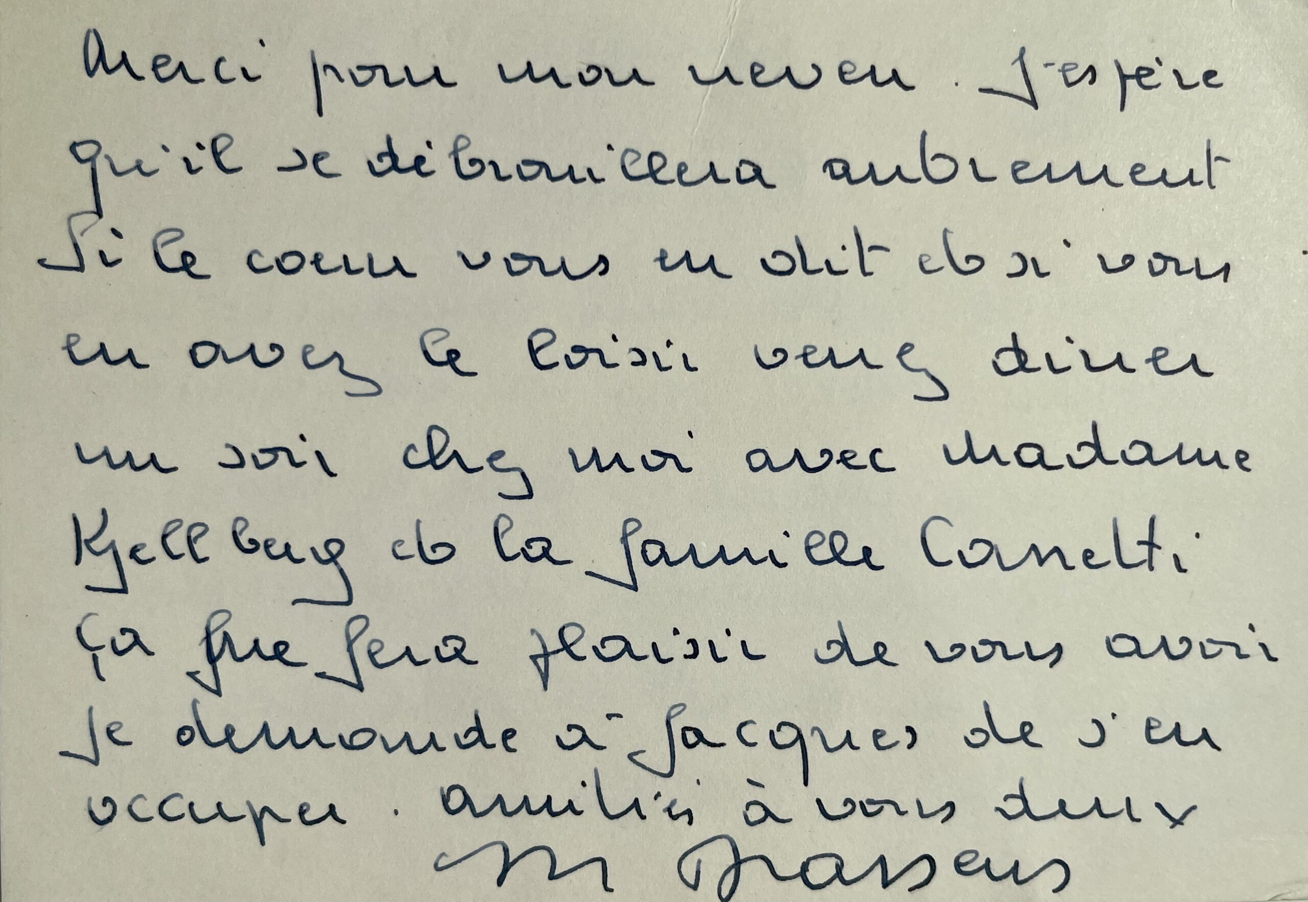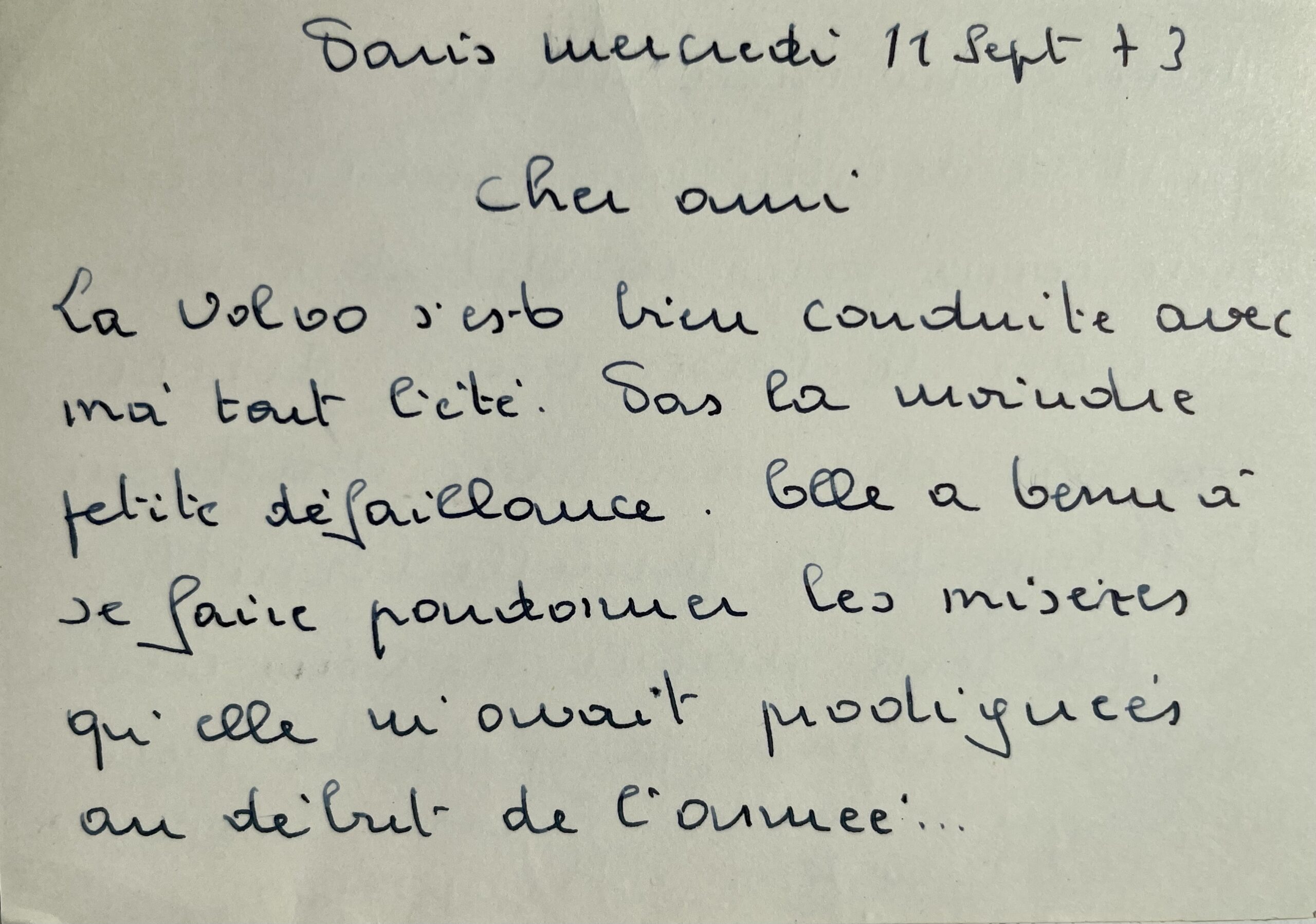 "Cher ami. La Volvo s'est bien conduite avec moi tout l'été. Pas la moindre petite défaillance. Elle a tenu à se faire pardonner les misères qu'elle m'avait prodiguées au début de l'année... Merci pour mon neveu. J'espère qu'il se débrouillera autrement. Si le coeur vous en dit et si vous en avez le loisir venez diner un soir chez moi avec Madame Kjellberg et la famille Canetti [le producteur de musique Jacques Canetti (1909-1997)]. Ça me fera plaisir de vous avoir. Je demande à Jacques de s'en occuper. Amitiés à vous deux".