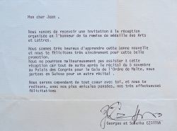 Georges Cziffra félicite Jean Darnel pour sa médaille des Arts et lettres. Cependant, "nous ne pourrons malheureusement pas assister à cette réception car tout de suite après le récital du 8 novembre au Palais des Congrès pour le gala de l'Ordre de Malte, nous partons en Suisse pour un autre récital [...]".