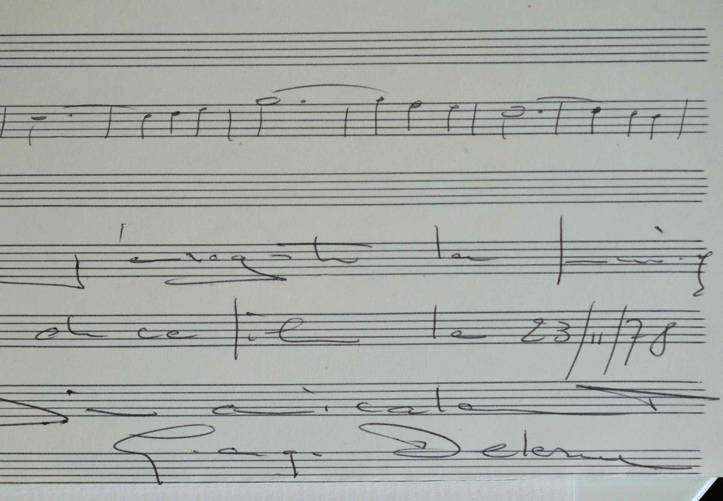 Manuscrit musical de Georges Delerue, du "Thème principal du dernier film de François Truffaut, "L'Amour en fuite". A la suite, il précise : «j'enregistre la musique de ce film le 23/11/78» (le lendemain).
