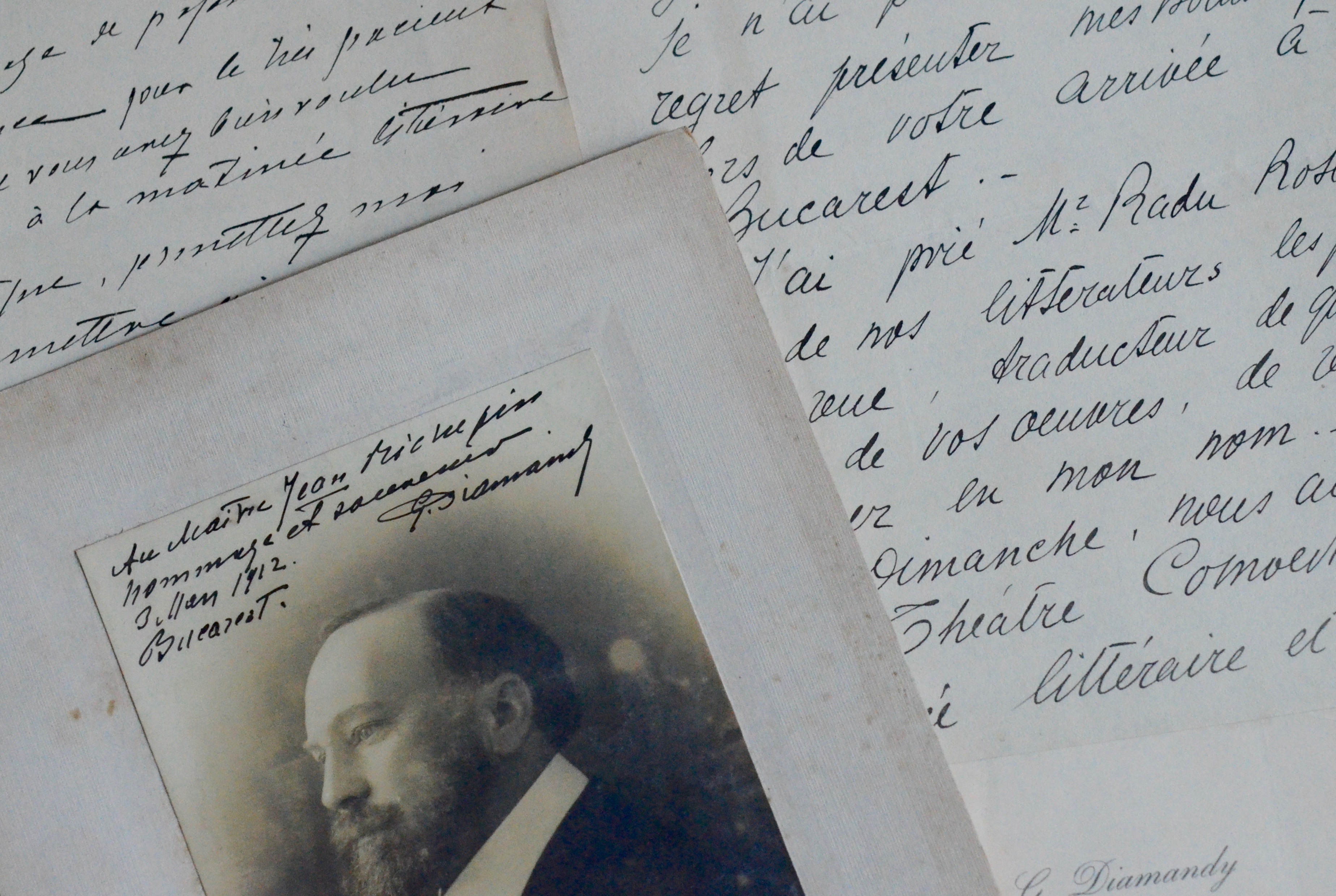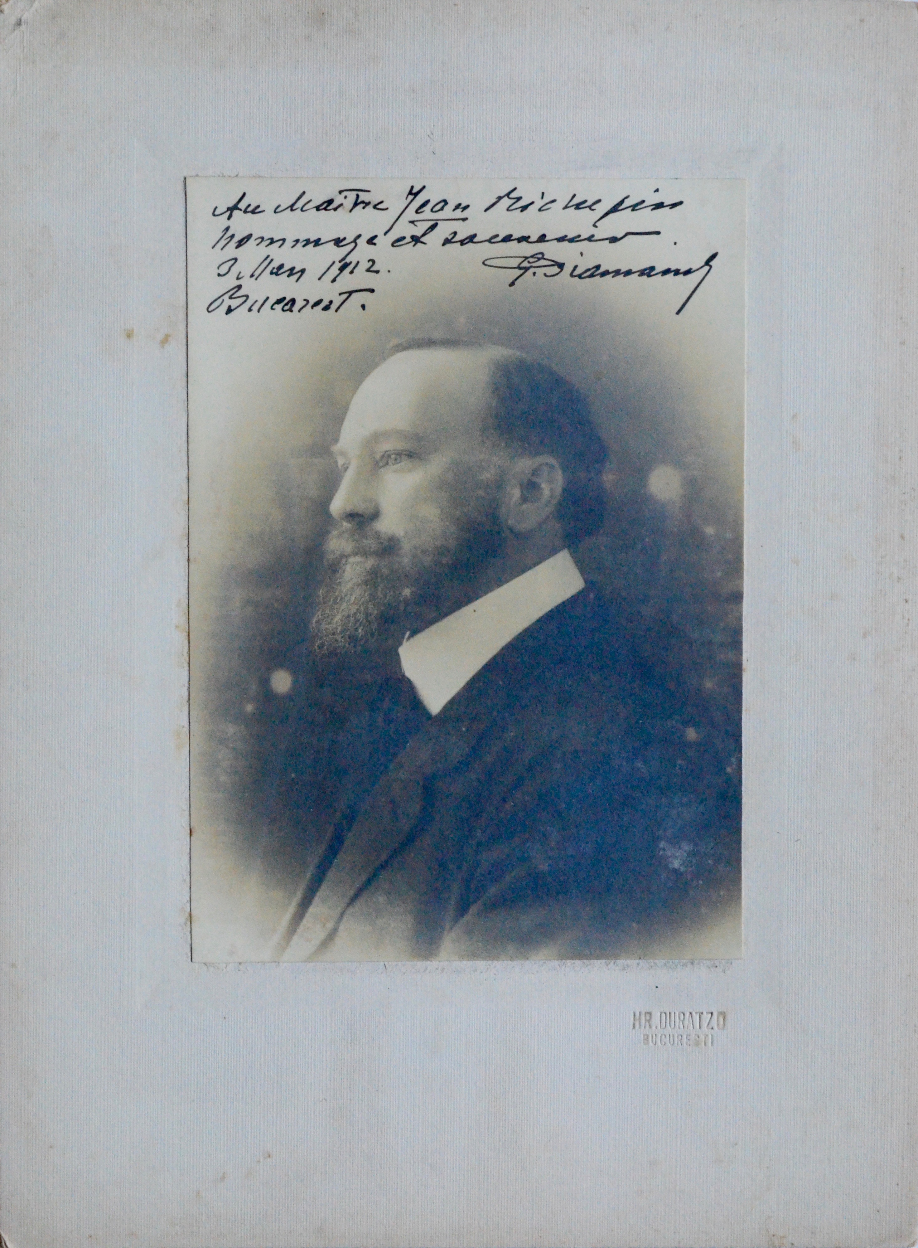 - Portrait photographique de Diamandy, de profil. Bucarest, 3 mars 1912. 14,3 x 10,1 cm, contrecollé sur carton du photographe (22,8 x 16,8 cm). Tirage argentique d'époque. Marque à froid du photographe attaché au Théâtre national dans le carton : HR. DURATZO. Bucarest. Envoi autographe signé et daté, en tête du cliché, à l'encre noire : "Au Maître Jean Richepin. Hommage et souvenirs [...]".