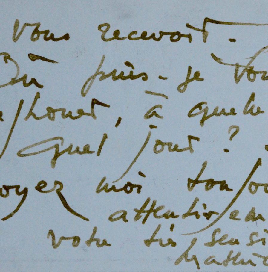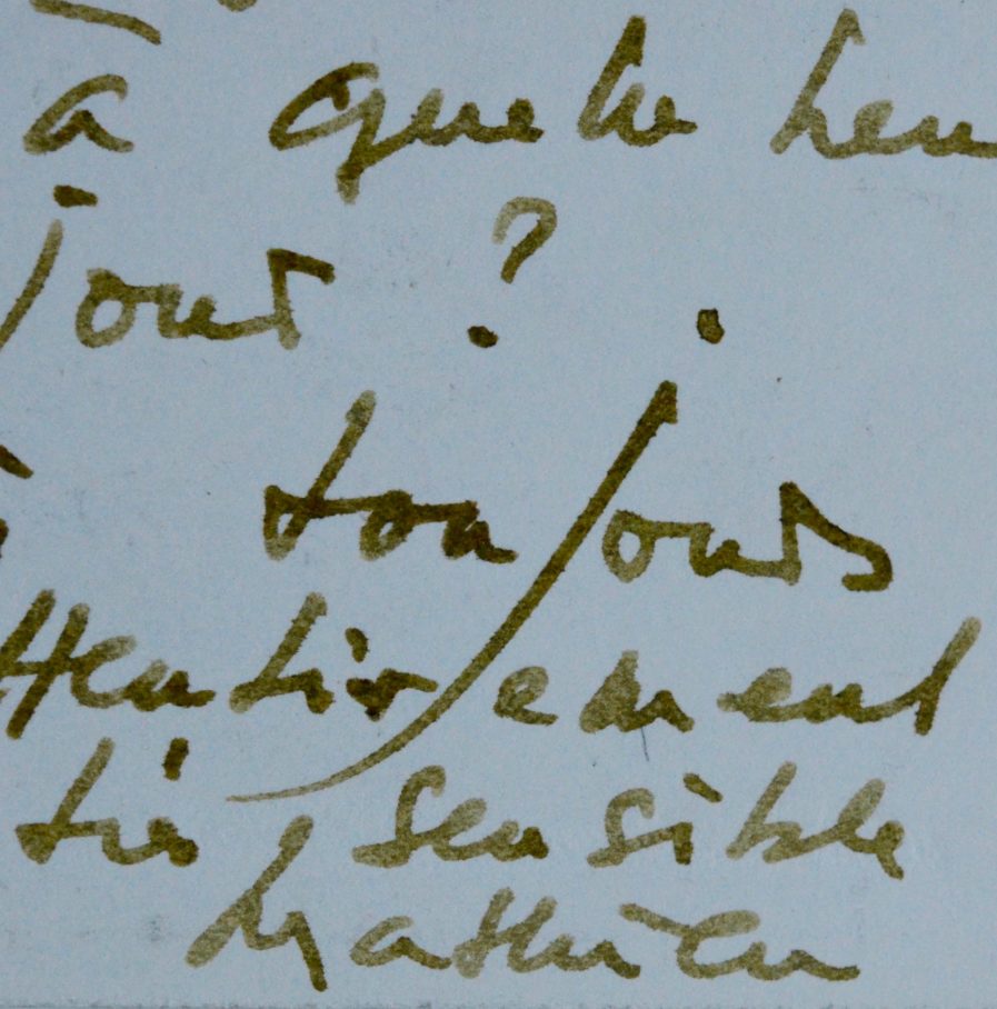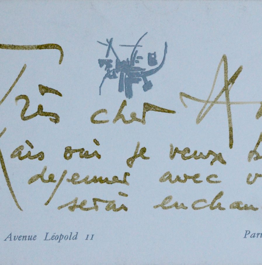 "Très cher ami. Mais oui je veux bien déjeuner avec vous et serai enchanté de vous recevoir. Où puis-je vous téléphoner, à quelle heure, quel jour ? Croyez-moi toujours attentivement votre très sensible Mathieu".