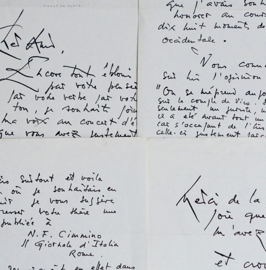 Mais surtout et voilà où je souhaiterais en venir je vous suggère d'adresser votre thèse une fois publiée à N.F. Cimmino - Il Giornale d'Italie - Rome [...]". Il cite ensuite, longuement, en français et en italien, un article lui étant consacré, dans un journal italien, en juillet 1971. "Merci de la grande joie que vous m'avez donnée [...]".
