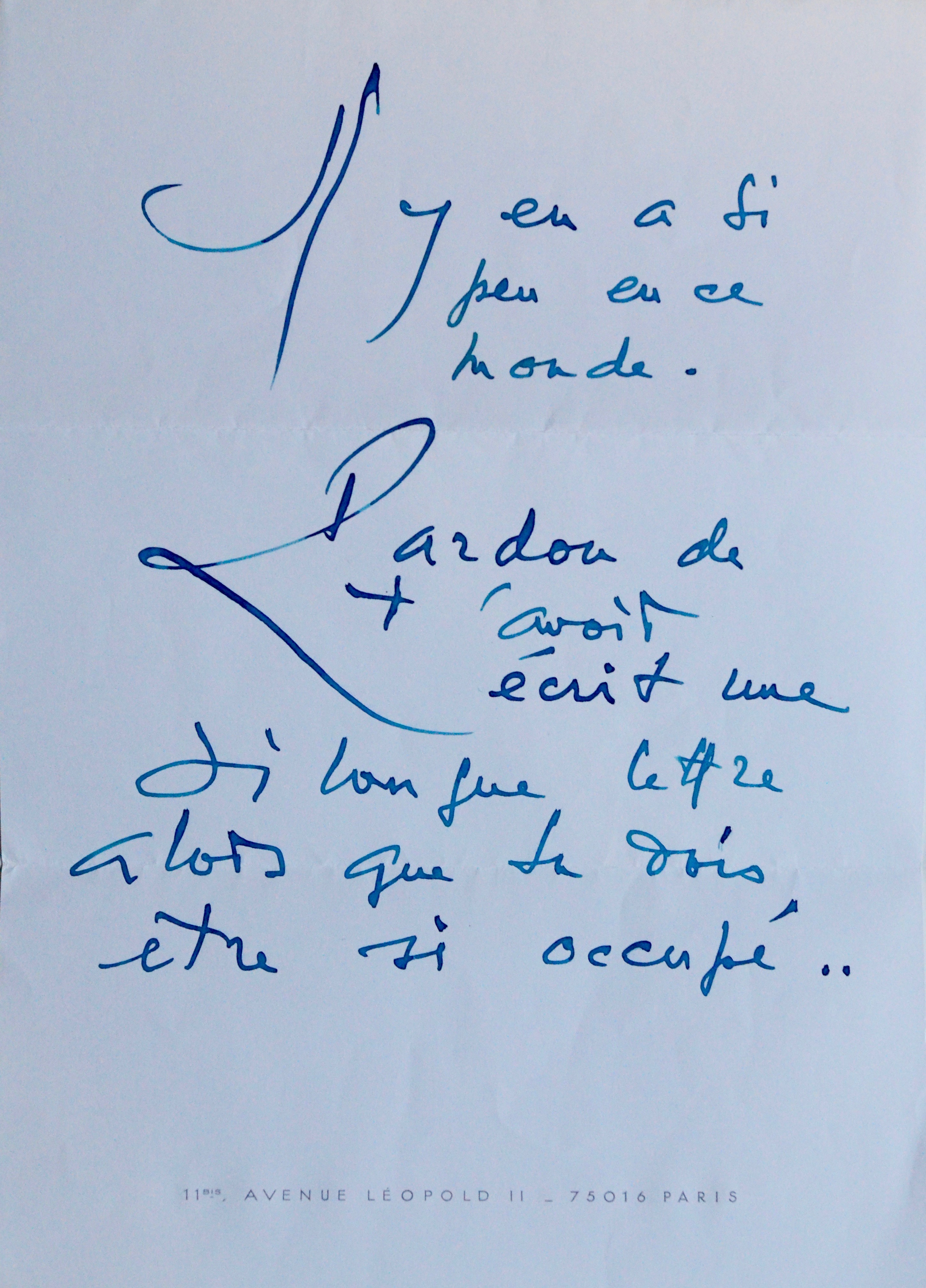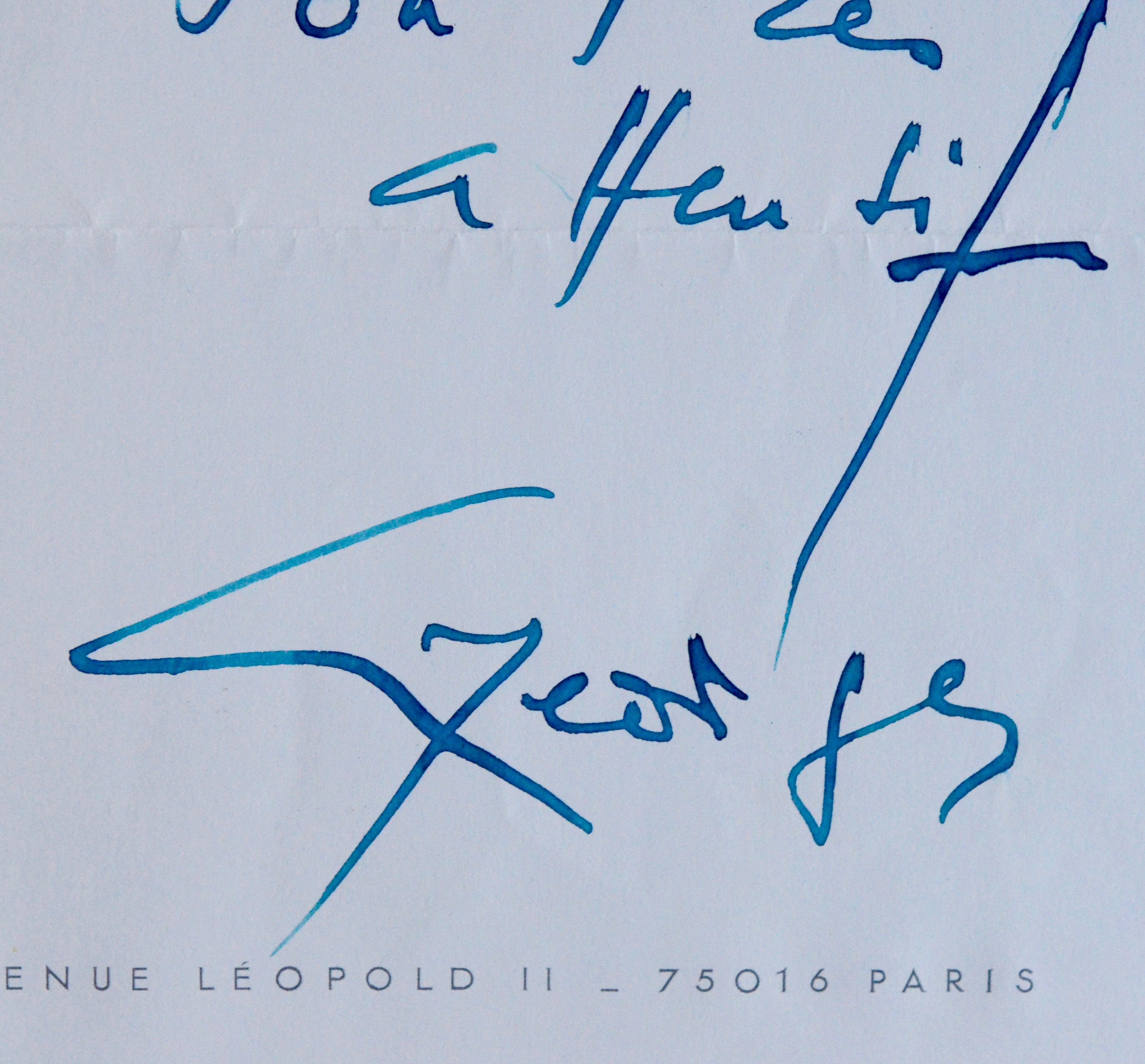 Lettre de Georges Mathieu, rédigée à l'encre turquoise de son écriture spectaculaire. Il remercie son ami Louis Amade de sa diligence "[...] Tu es vraiment un admirable ami ! Il y en a si peu en ce monde [...]".