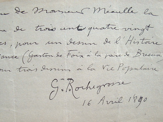 Georges Rochegrosse dresse un reçu pour la somme de 380 francs «pour un dessin de l'Histoire de France (Gaston de Foix à la paix de Brescia) et pour trois dessins à la Vie Populaire».