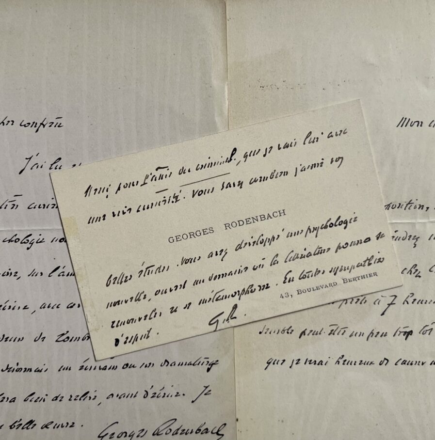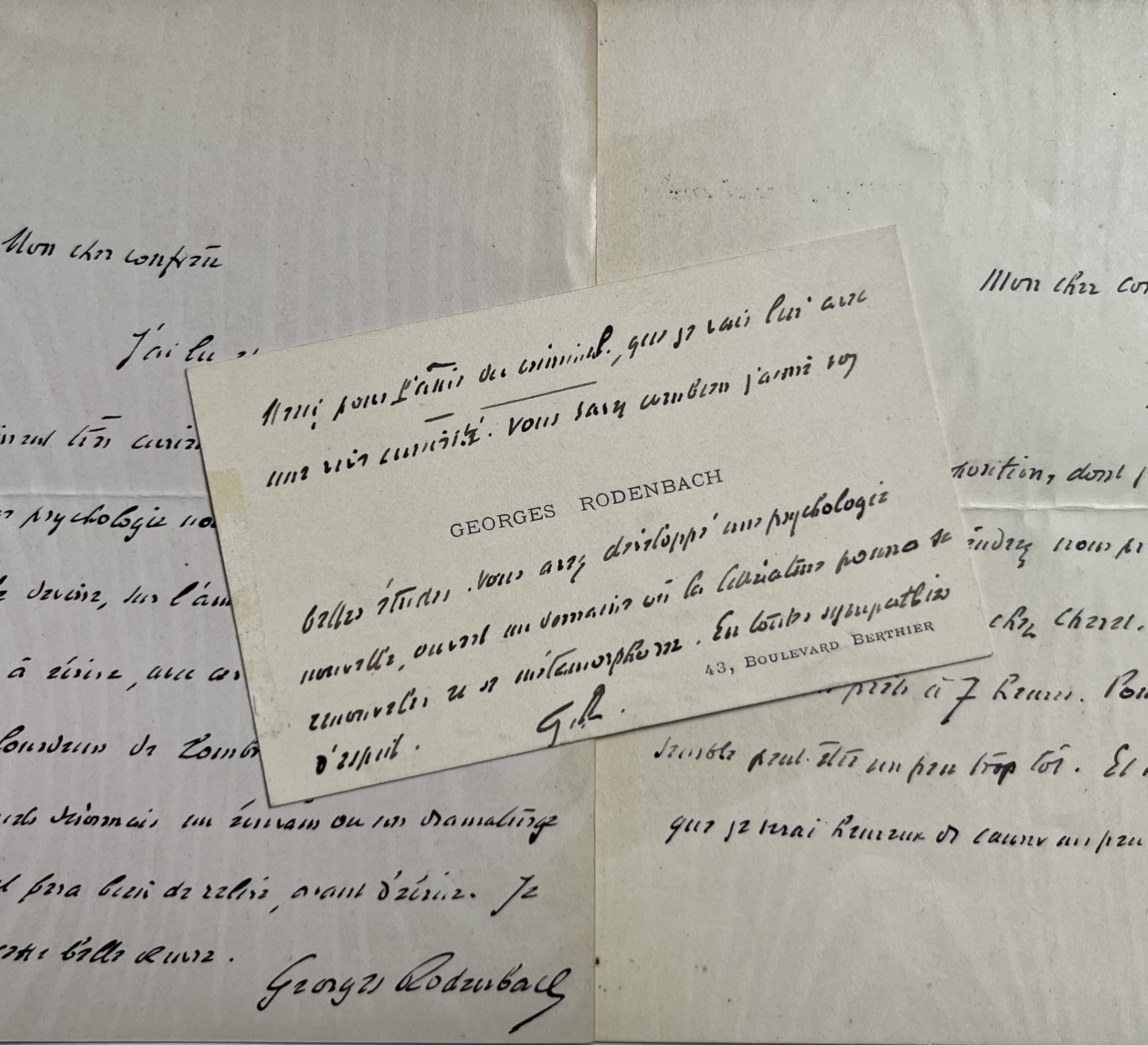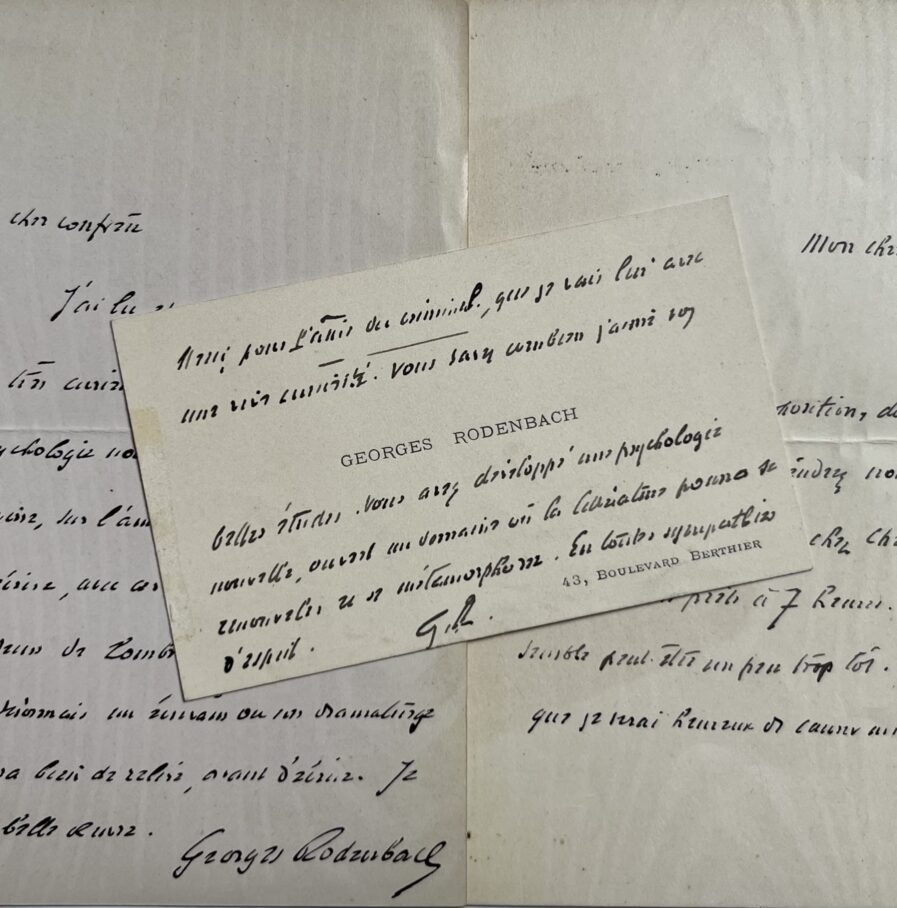 Il est joint une carte de visite A.S., au même. Rodenbach remercie Maurice de Fleury pour son ouvrage "L'âme du criminel" qu'il a lu avec curiosité. "Vous savez combien j'aime vos belles études. Vous avez développé une psychologie nouvelle, ouvert un domaine où la littérature pourra se renouveler et se métamorphoser [...]".