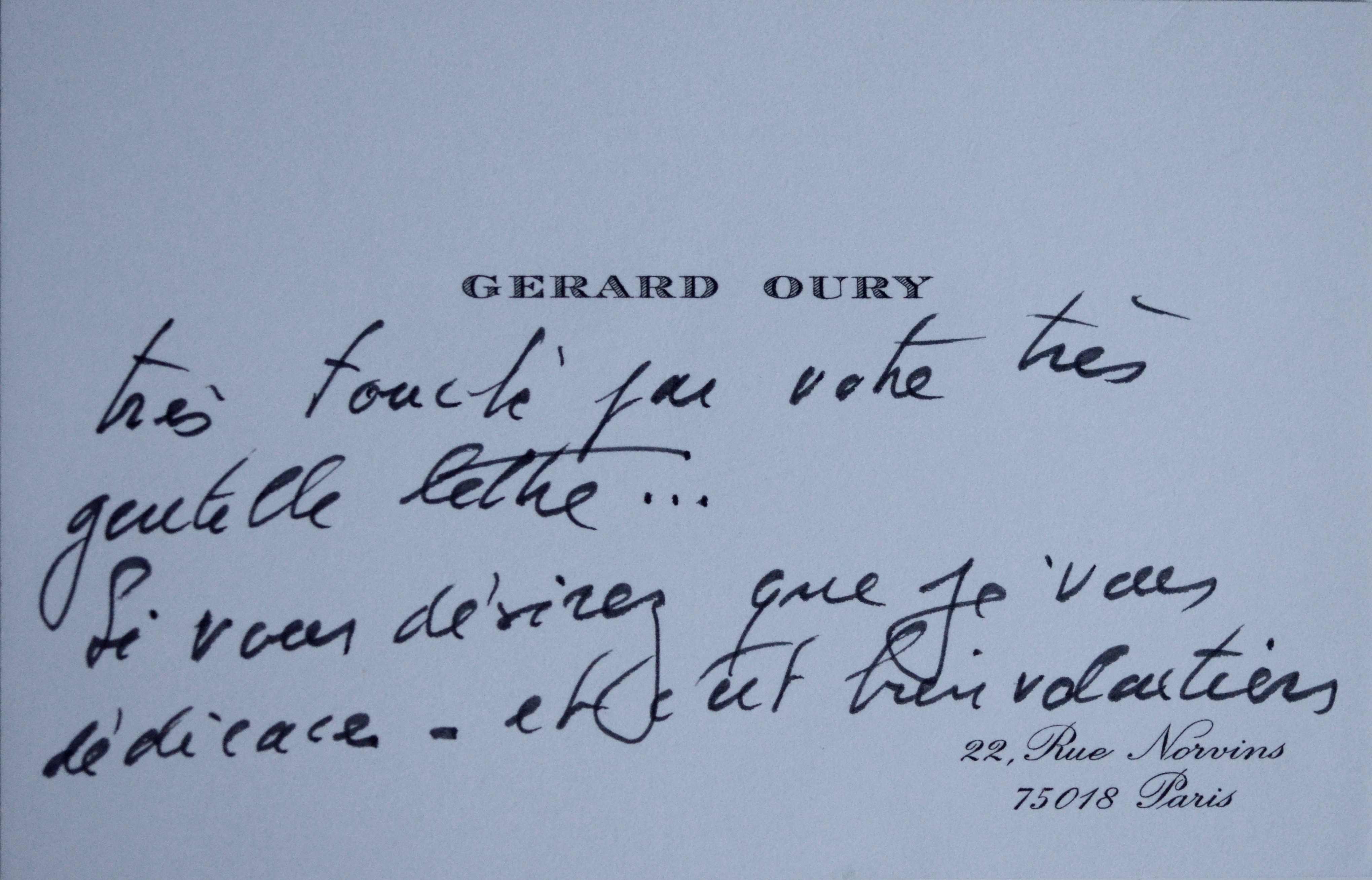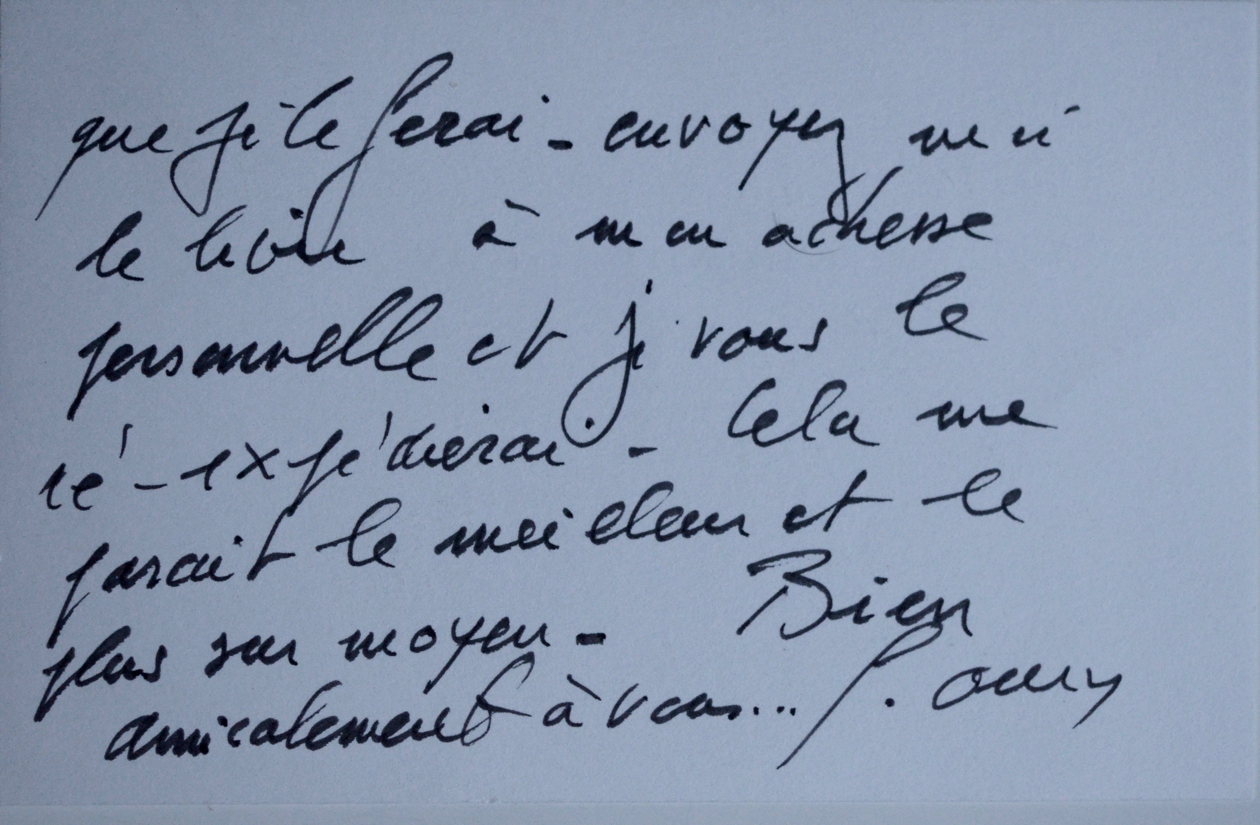 "Très touché par votre très gentille lettre... Si vous désirez que je vous dédicace - et c'est bien volontiers que je le ferai - envoyez moi le livre [...]". Il propose de lui adresser à son adresse personnelle et se chargera de ré-expédier l'ouvrage signé.