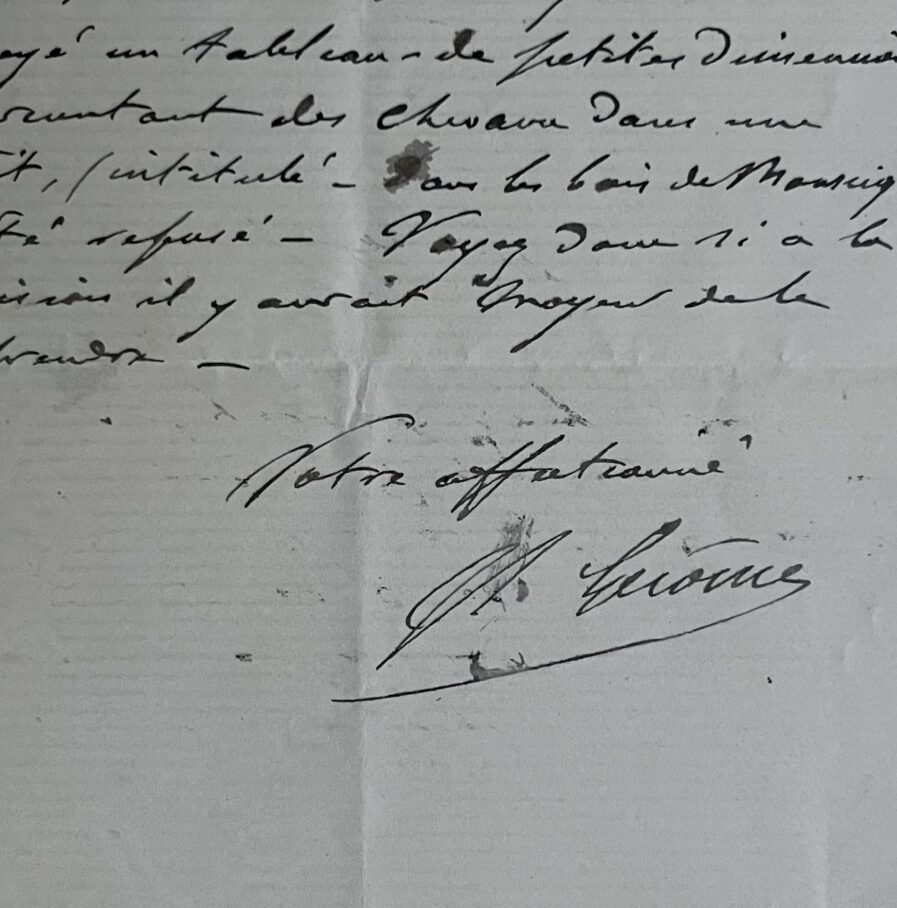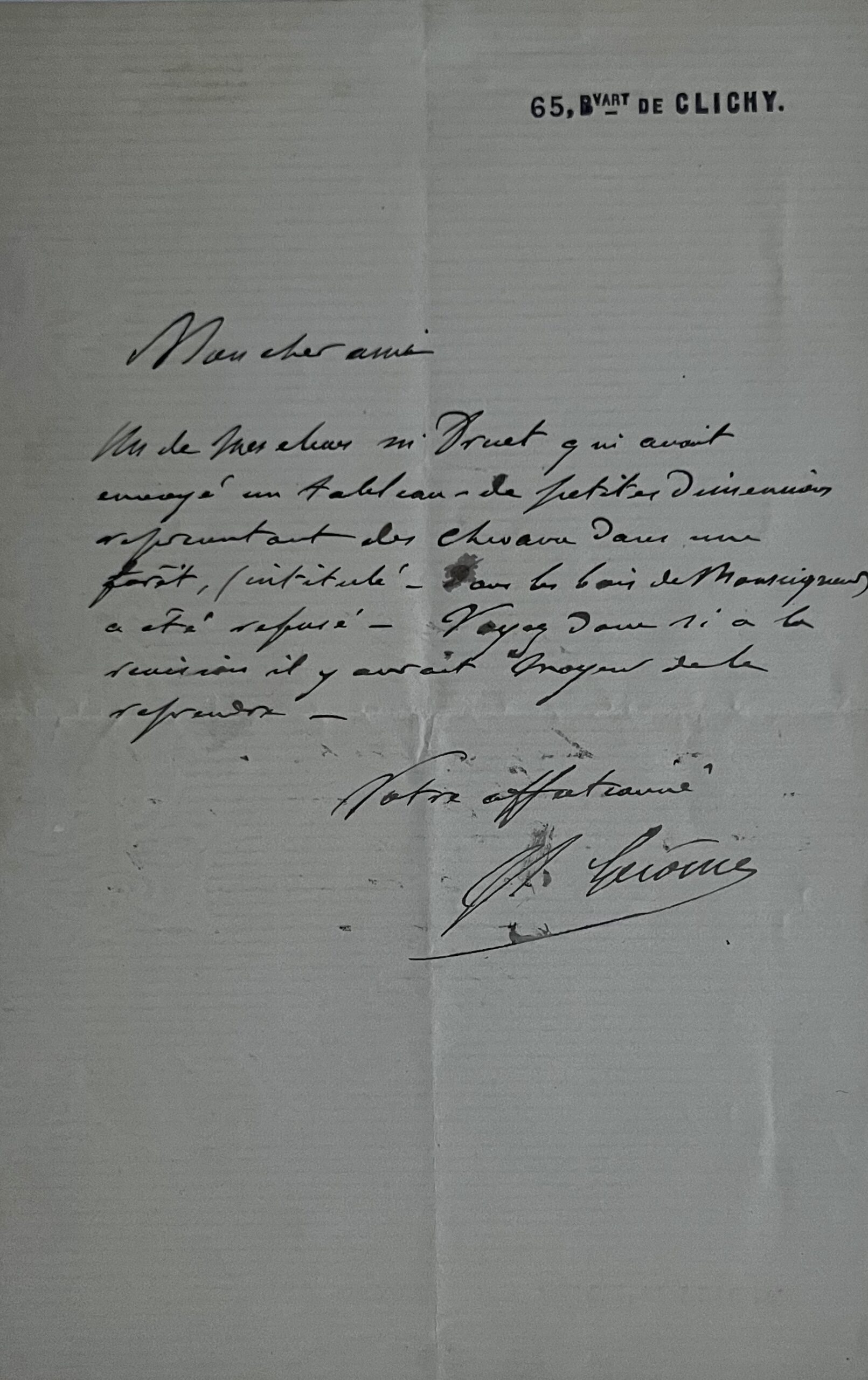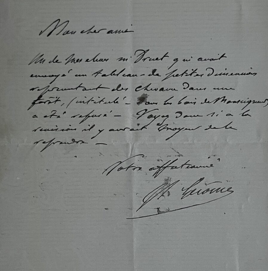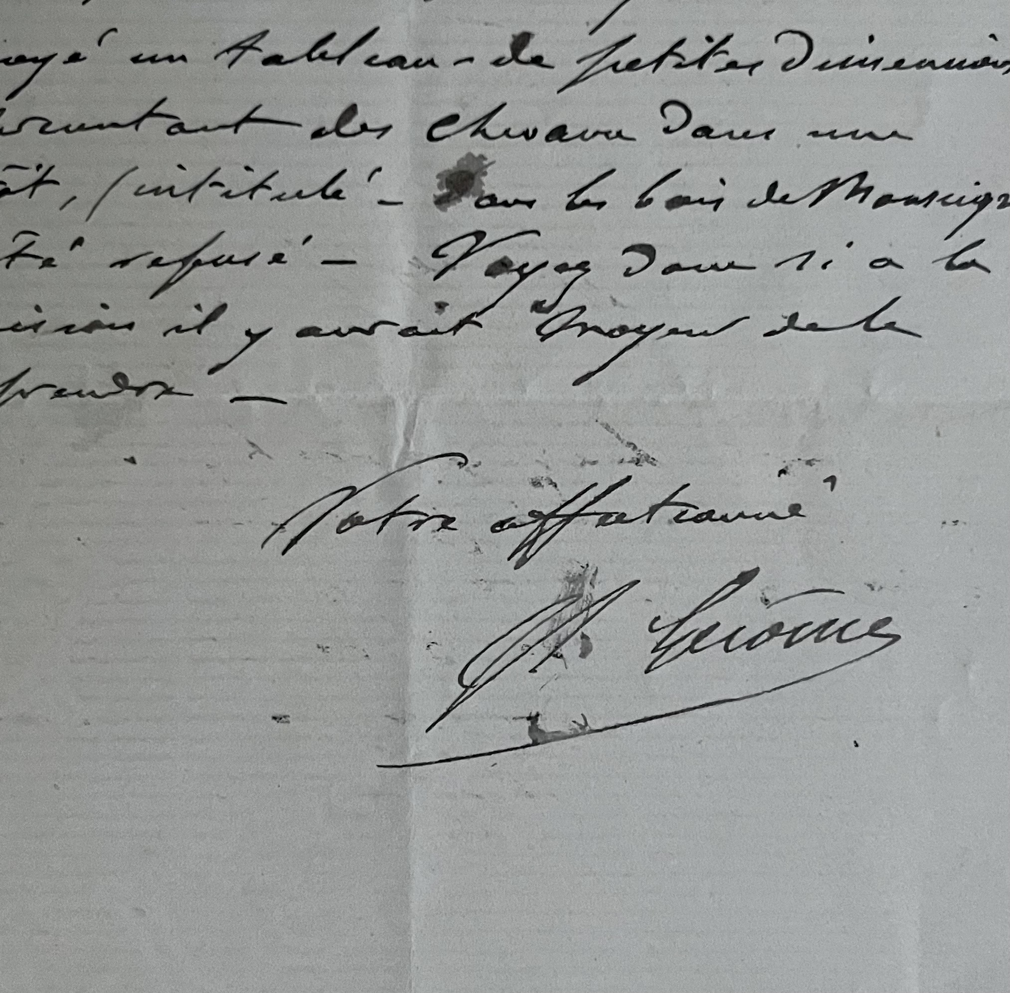 "Un de mes élèves M. Druet qui avait envoyé un tableau de petites dimensions représentant des chevaux dans une forêt, (intitulé - Dans les bois de Monseigneur) a été refusé. Voyez donc si à la révision il y avait moyen de le reprendre. Votre affectionné. JL Gérôme".