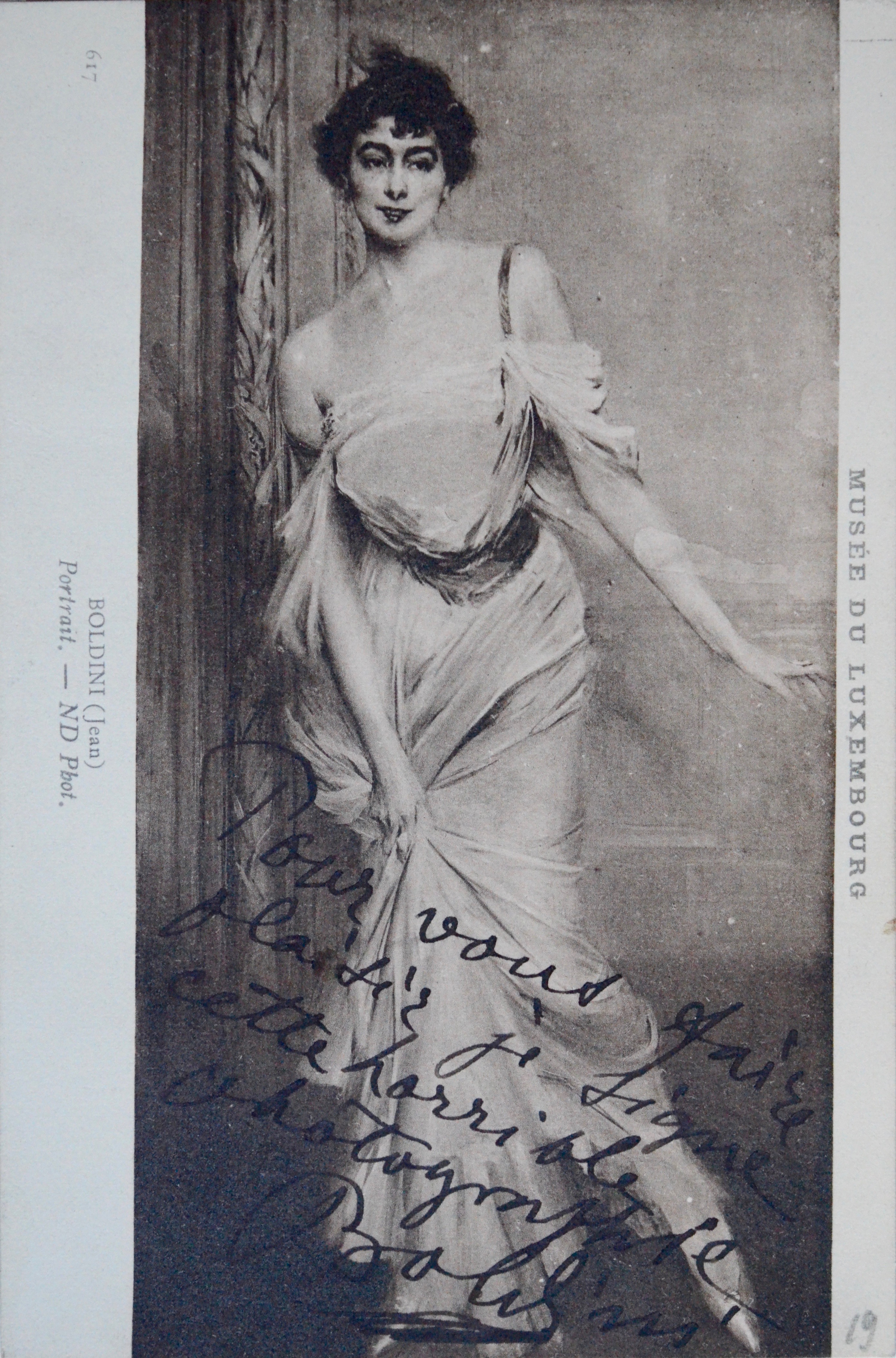 Amusant envoi de Giovanni Boldini sur une carte postale reproduisant son portrait de Mrs. Charles Max, "Pour vous faire plaisir, je signe cette horrible photographie. Boldini".