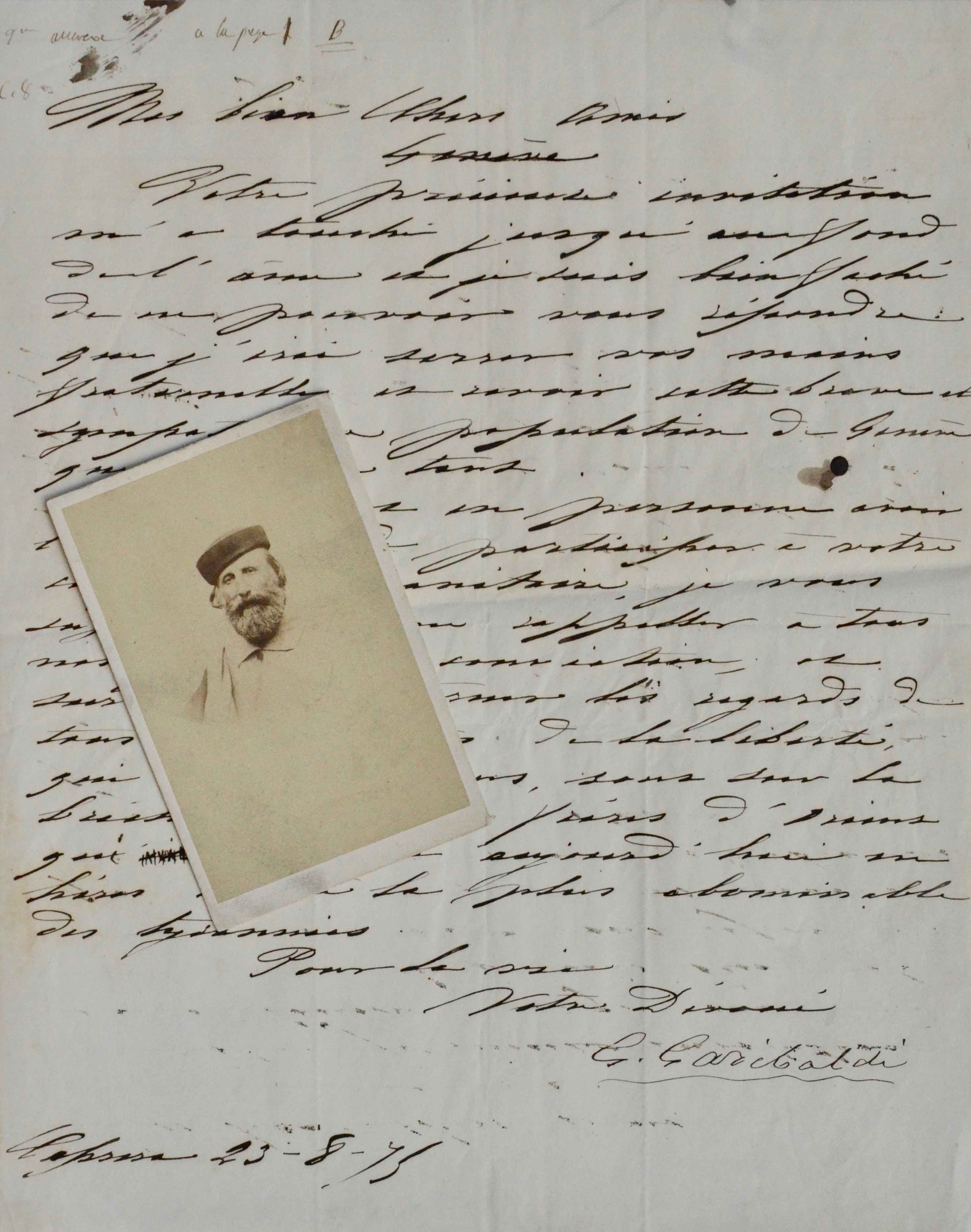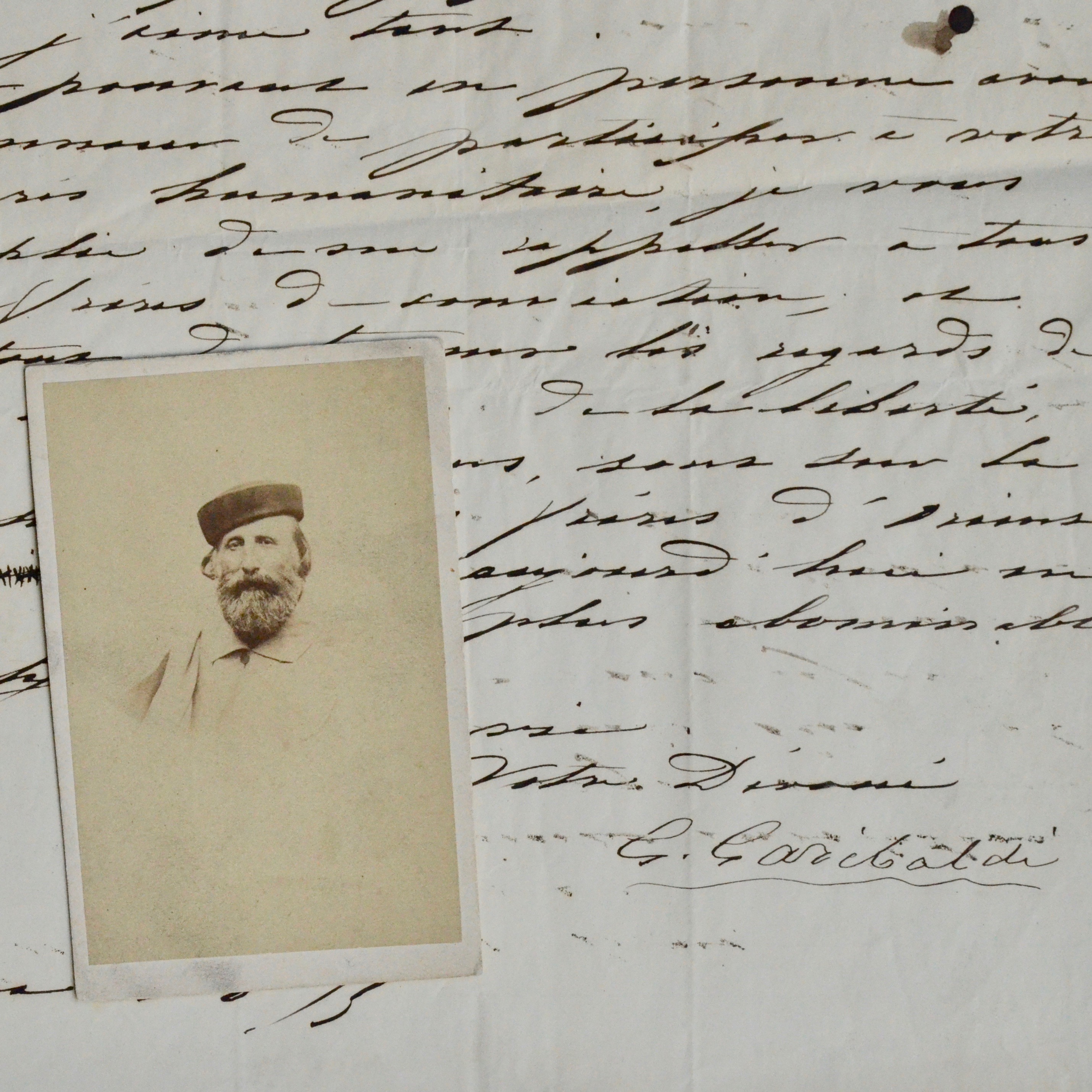 On joint un portrait photographique de Giuseppe Garibaldi, coiffé d'un chapeau, réalisée par Pierre Ambroise Richebourg (1810-1875), "photographe de la couronne ", quai de l'horloge à Paris. [Circa 1870]. Format carte de visite : 9,1 x 6 cm. Minimes salissures.