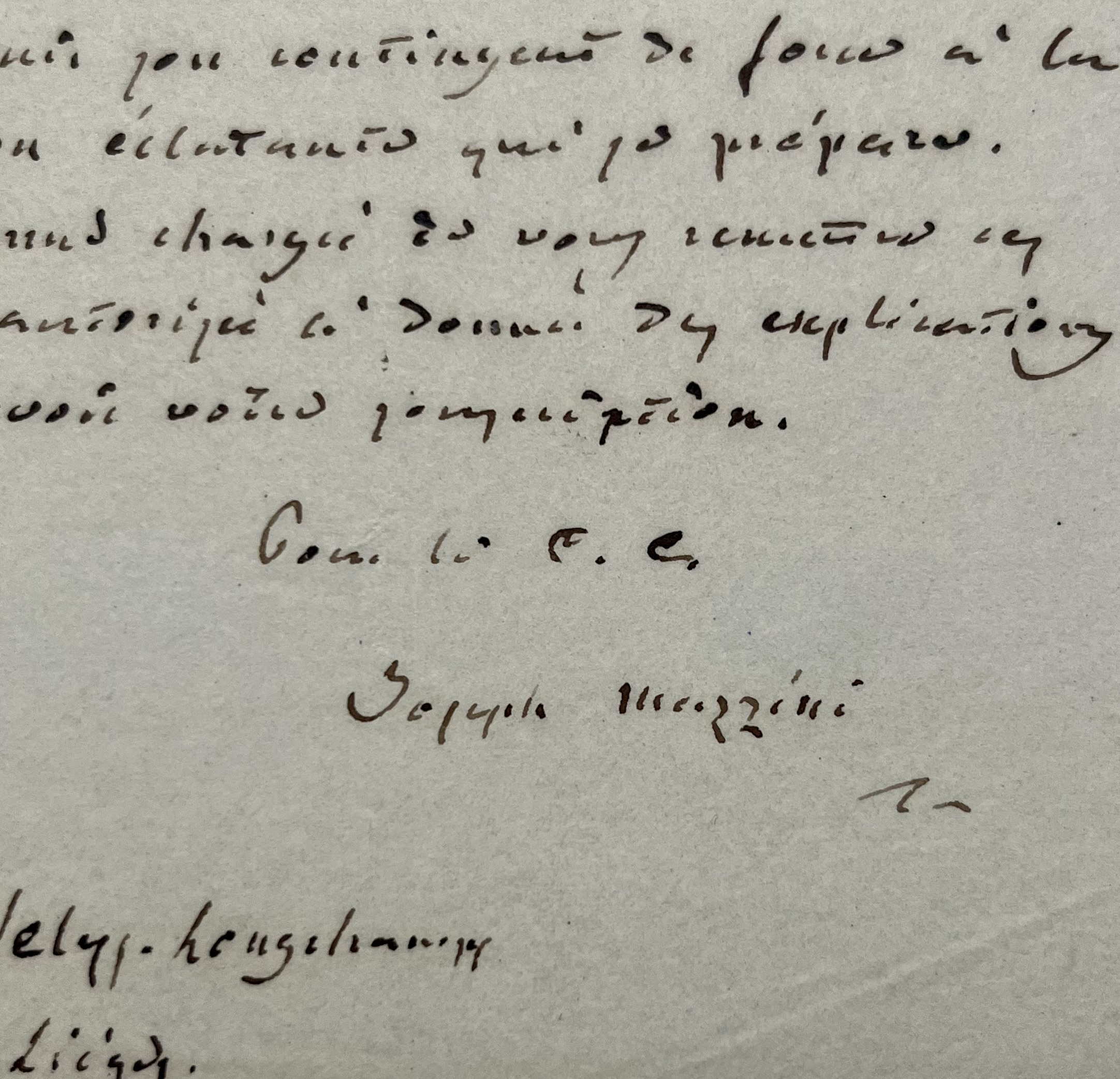 Giuseppe Mazzini (Gênes , 1805/1872)"Citoyen. La Démocratie Européenne a besoin de quelques fonds pour compléter les préparatifs, de quelques opérations vitales. Elle s'adresse par nous aux hommes du parti qui ont les moyens pour satisfaire à ses demandes. Vous comptez parmi eux. Vous ne vous refuserez pas à notre appel. Devant l'Empire qui s'élève, tout homme doit devenir homme d'action : tout homme doit fournir son contingent de force à la protestation éclatante qui se prépare. La personne chargée de vous remettre ces lignes est autorisée à donner des explications [...]".