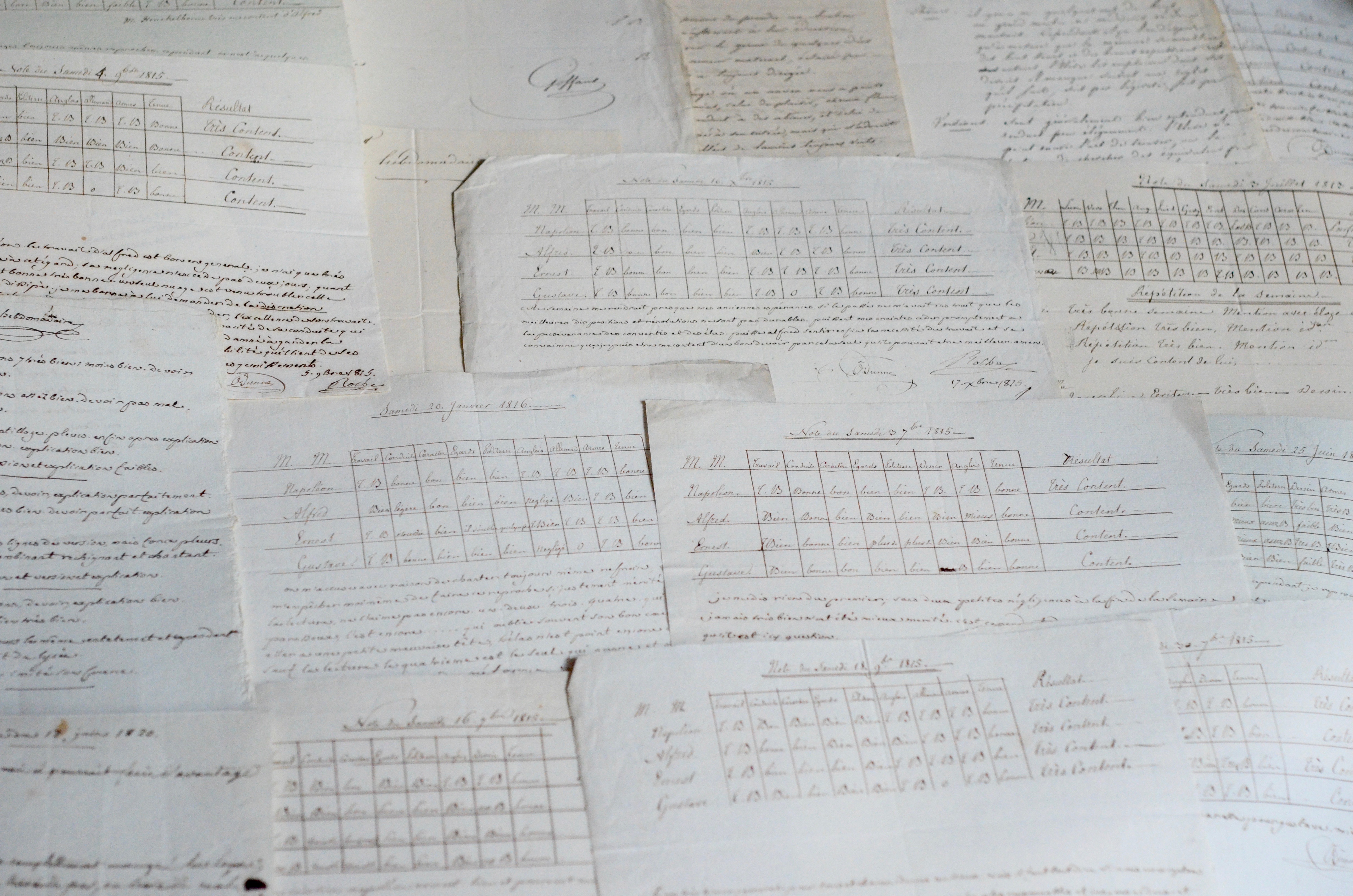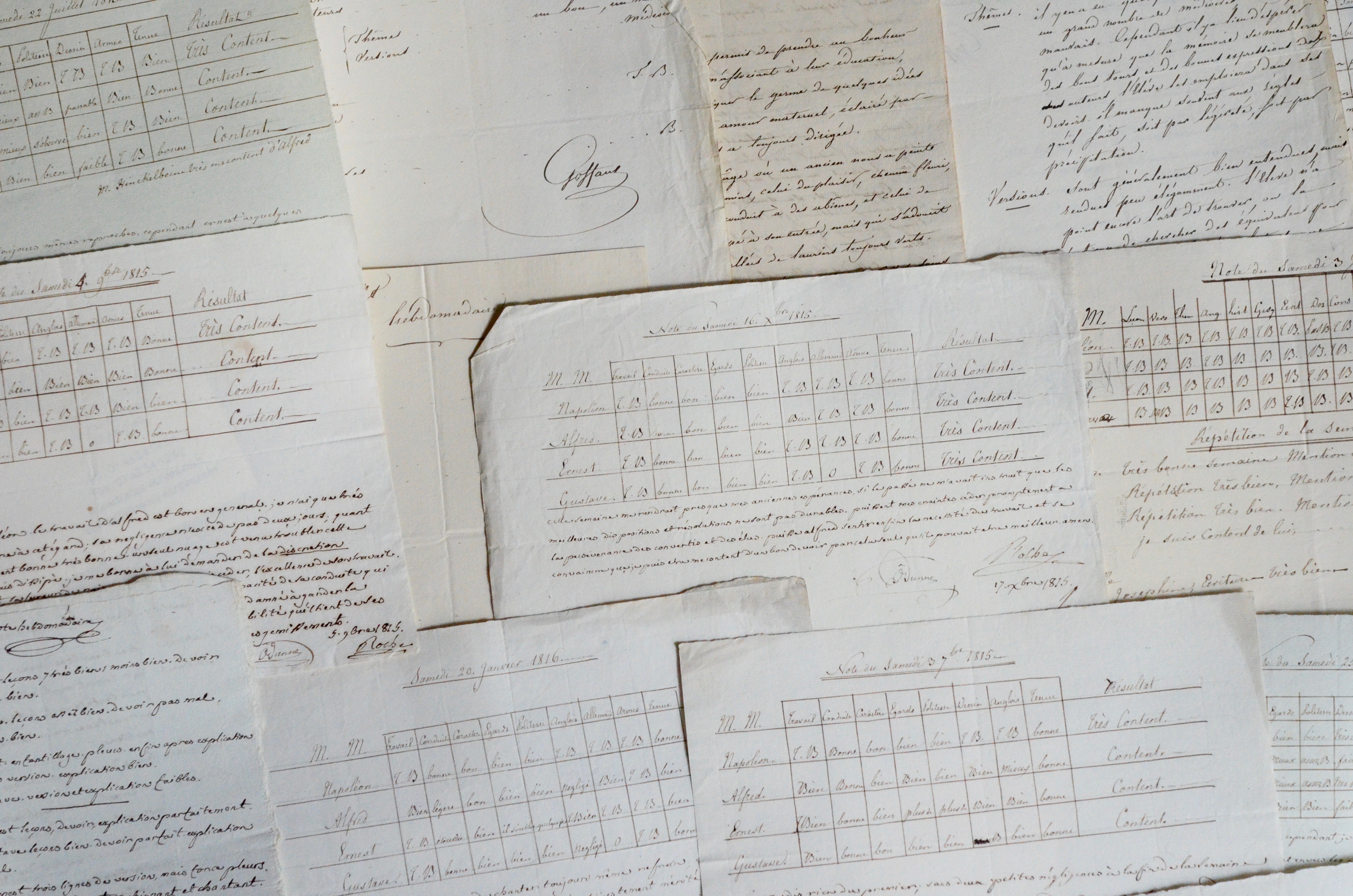 La lettre est accompagnée d'un ensemble de 16 bulletins scolaires des enfants Lannes, signés par Goffaux, Dunne ou Roche. Les bulletins de notes portent des tableaux, où sont inscrites des appréciations sur les quatre garçons Lannes : travail, conduite, caractère, égards, politesse, anglais, dessin, tenue). 1813-1820. 17 pp. in-4.