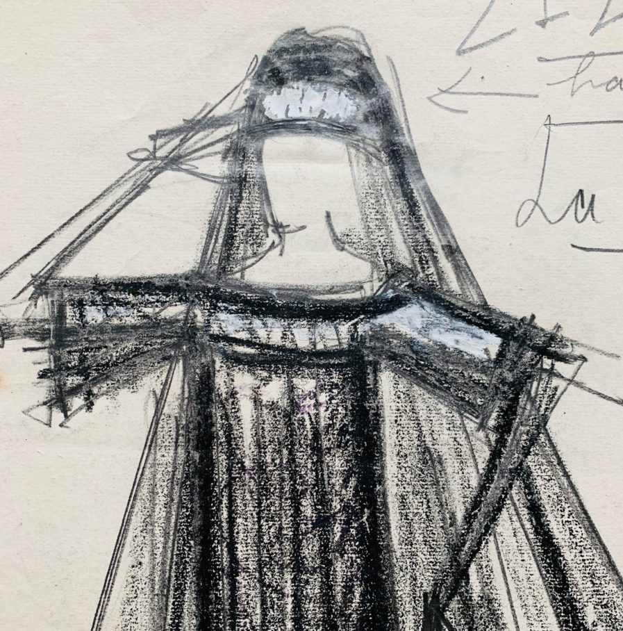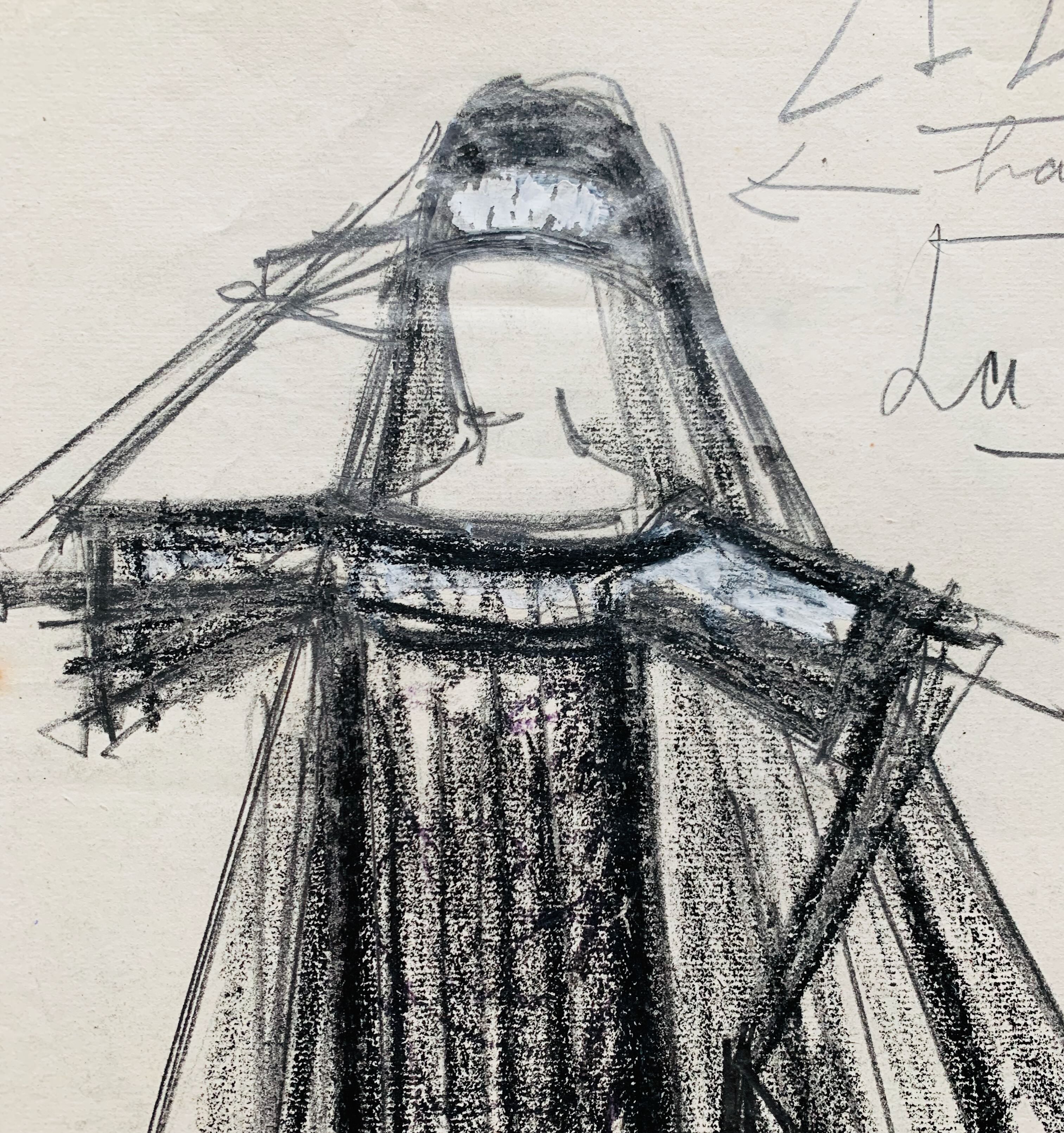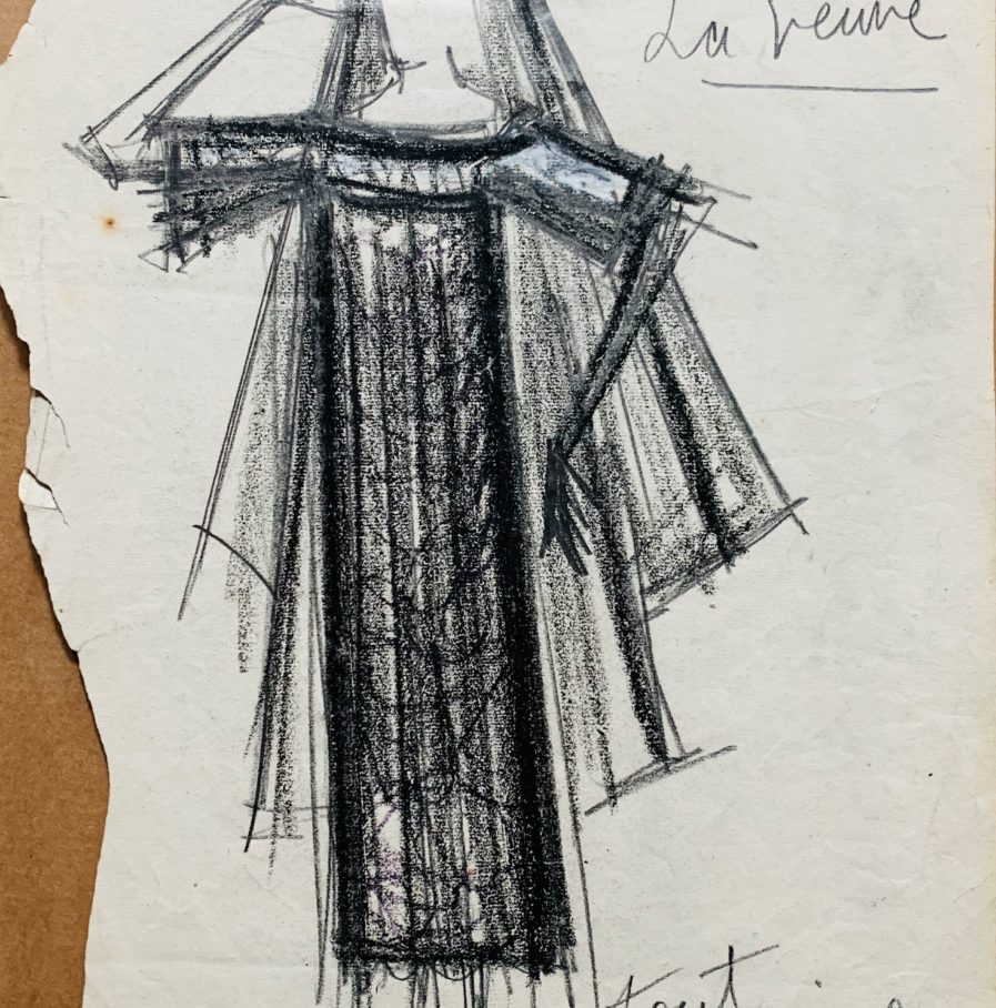 Annotations autographes en marge : "Zizi", "Bande[au] blanc", "Le veuve", "Tout en crêpe de Chine", "Voile très ample".