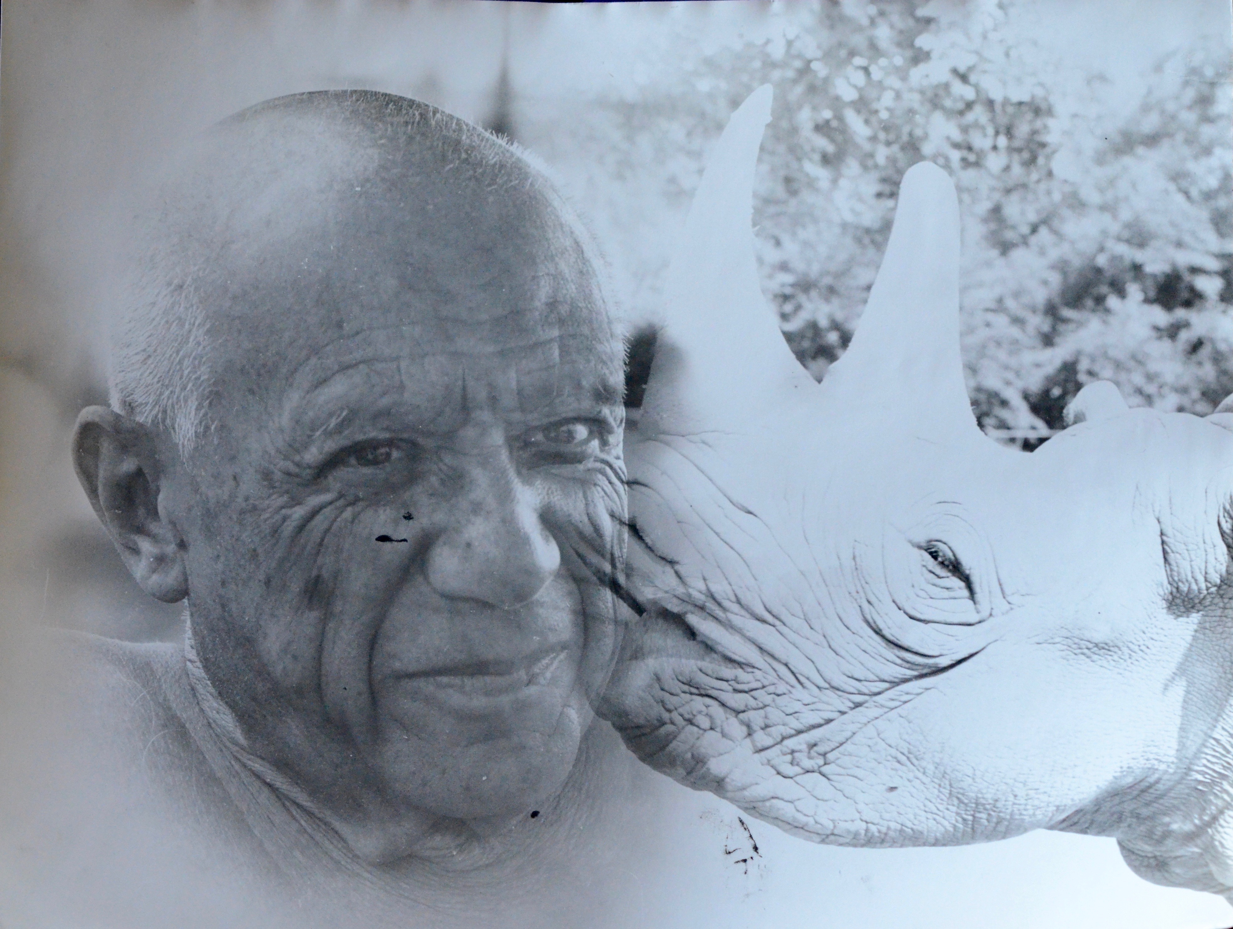 Grand et beau portrait photographique de Pablo Picasso avec un rhinocéros
