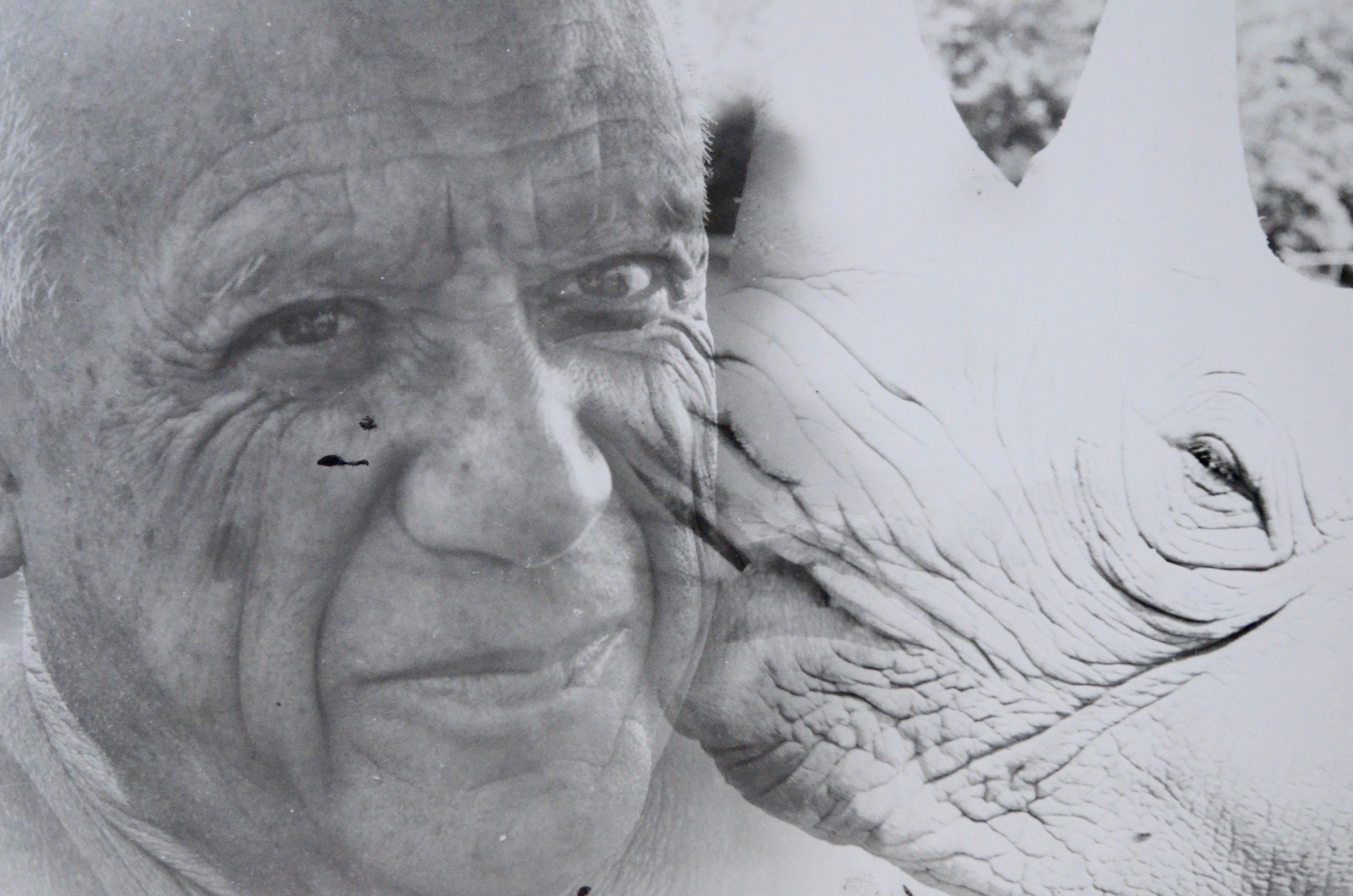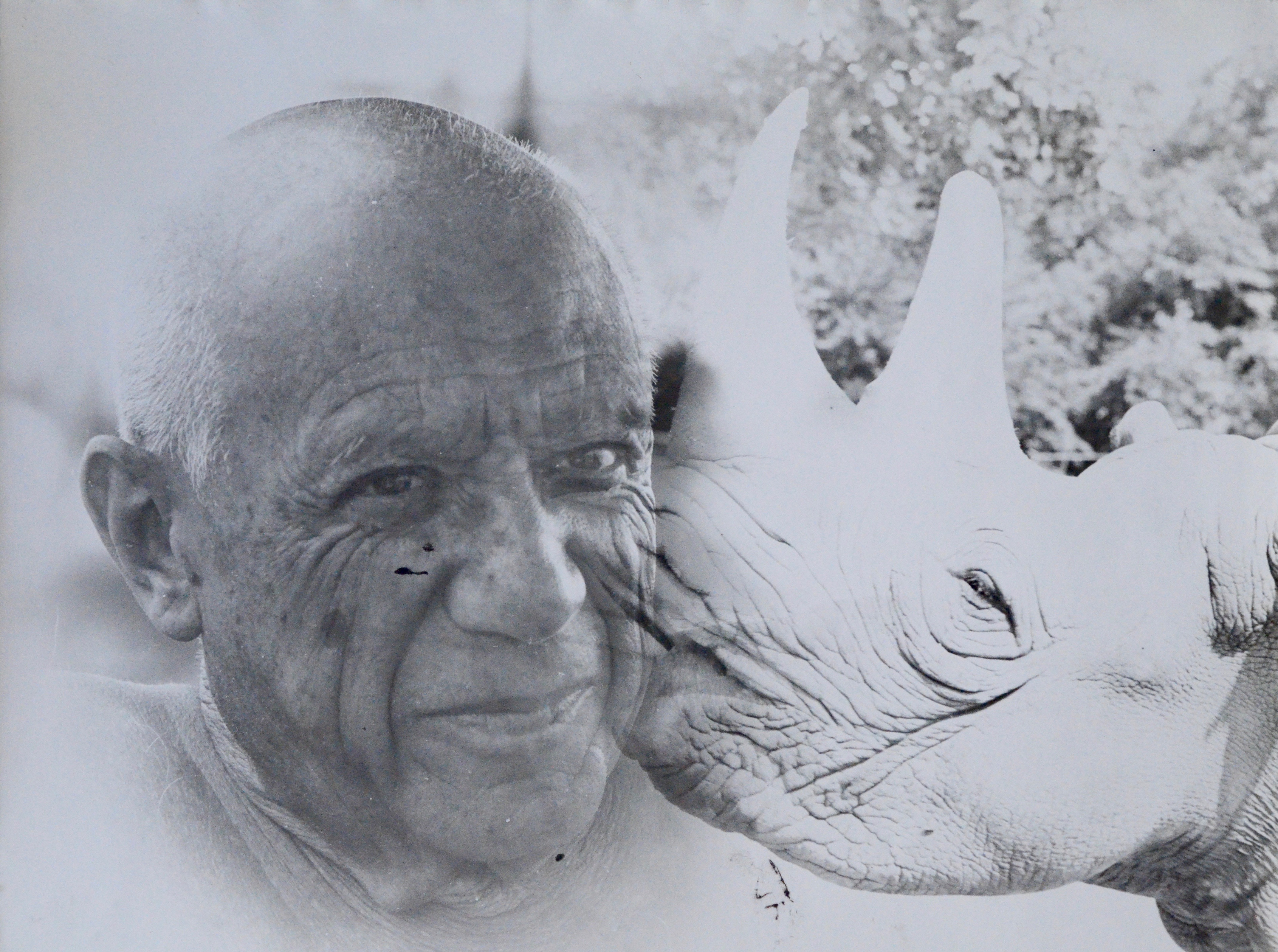 Montage photographique figurant un portrait de Pablo Picasso avec un rhinocéros, par réalisé par le photographe Richard de Grab (1927-2001). Tirage argentique d’époque [1964] en noir et blanc.