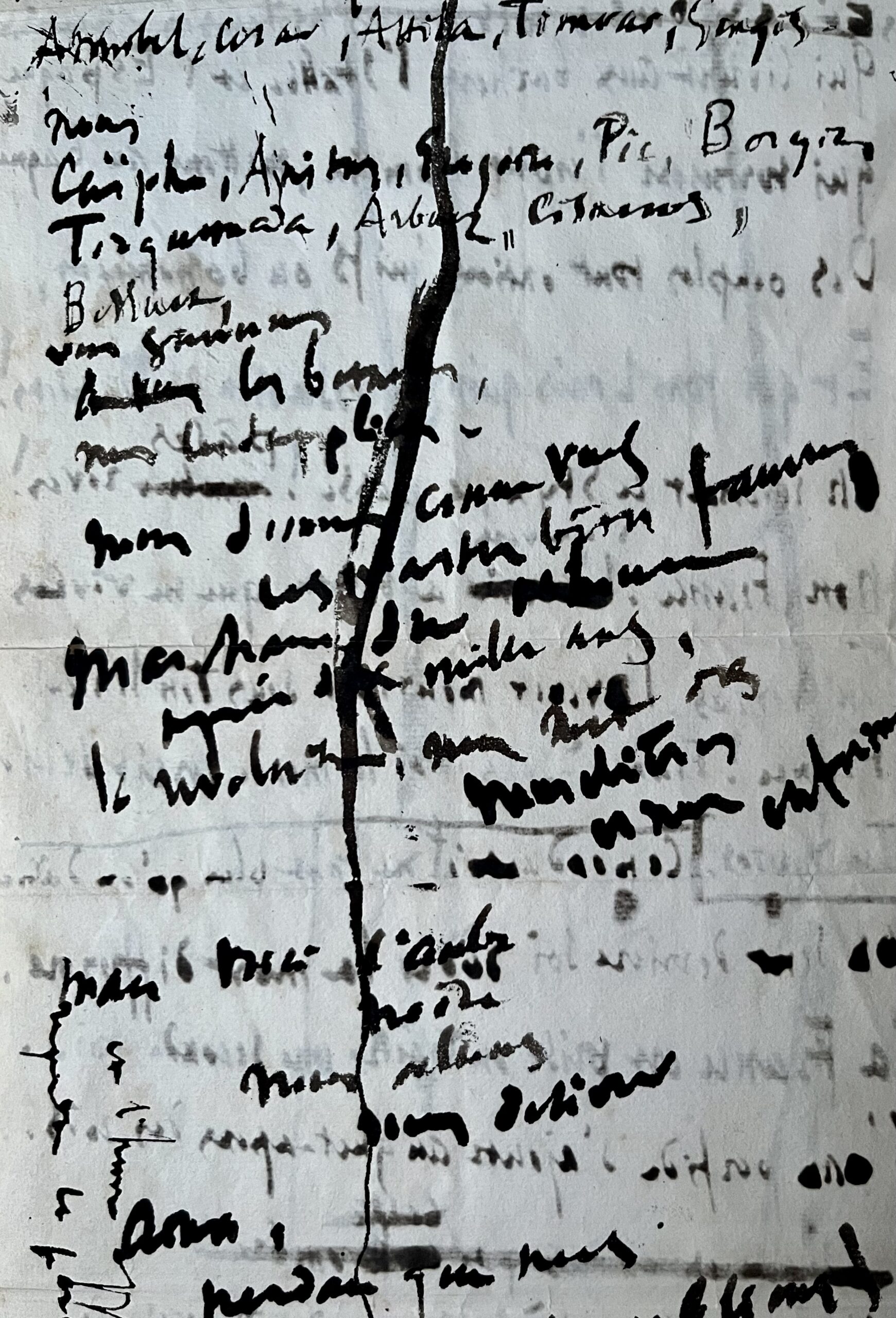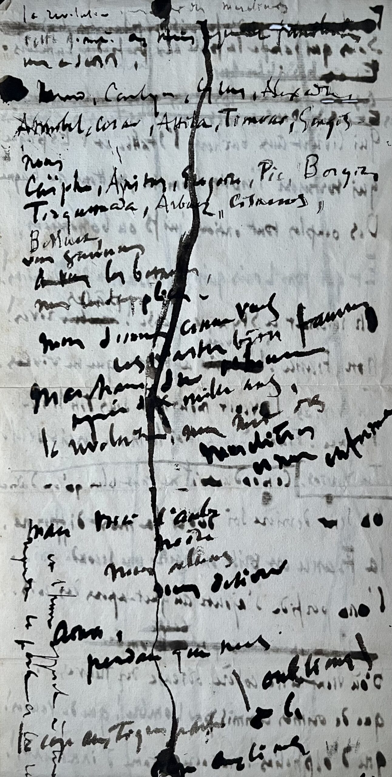 Au verso figurent des notes jetées à la hâte, assez difficiles à déchiffrer. On distingue des noms de personnages historiques clés, qui apparaissent dans La Légendes des siècles : Cambyse, Cyrus, Alexandre, Annibal, Attila, Gengis, Caïphe, Pic, Borgia, Torquemada [...]". Et des vers où la Révolution est évoquée à 2 reprises.