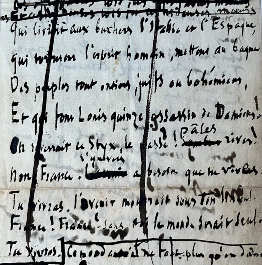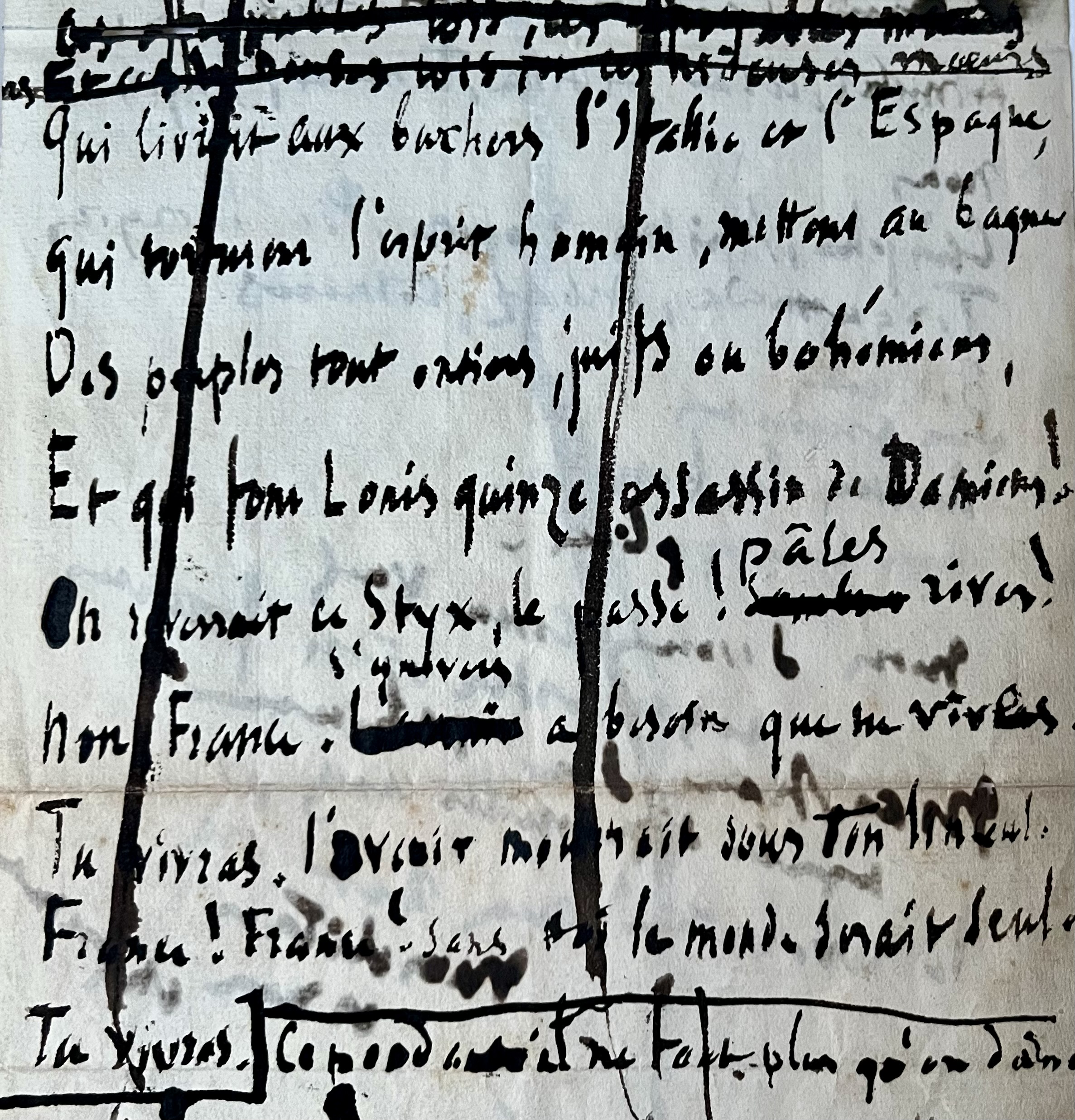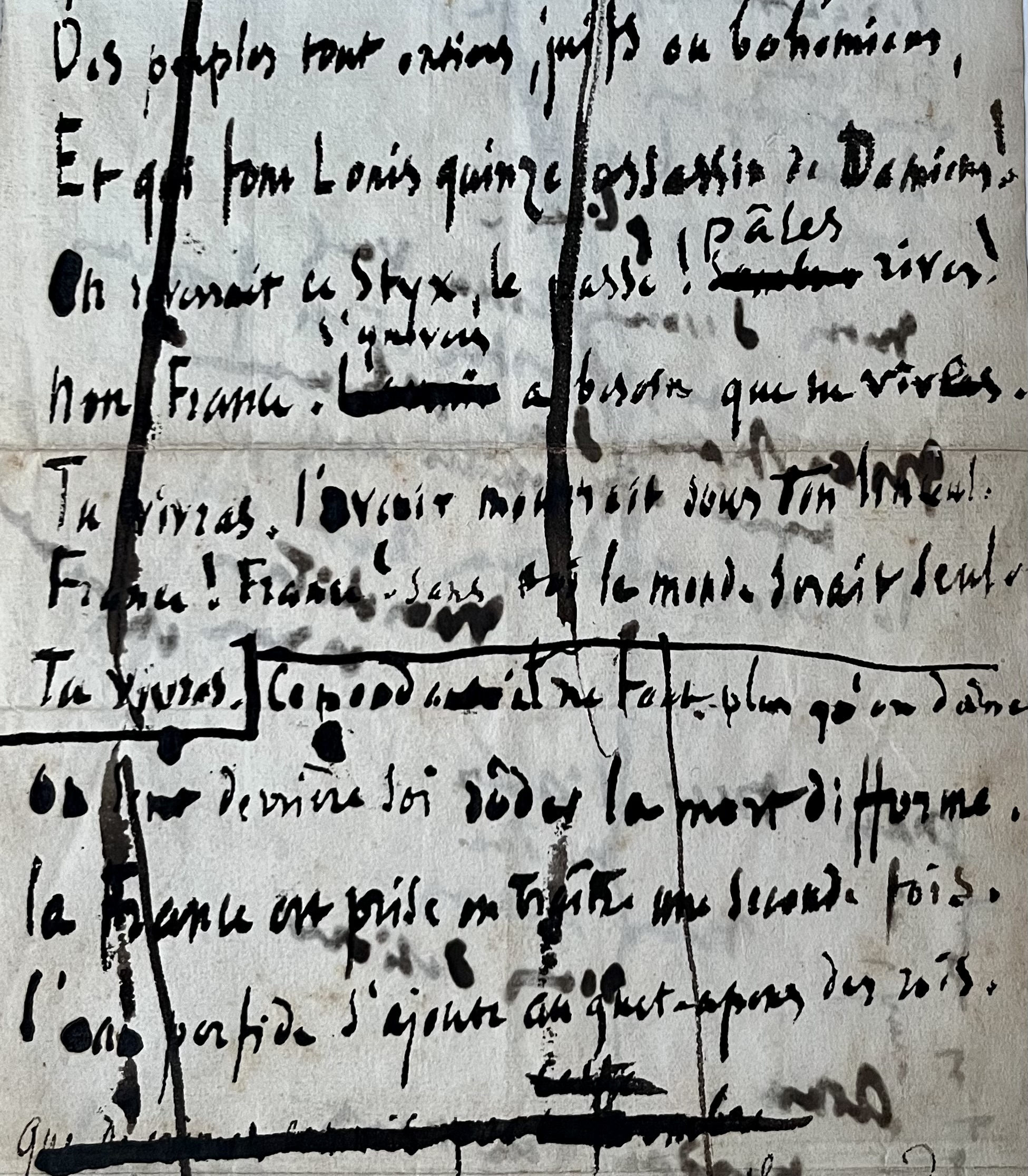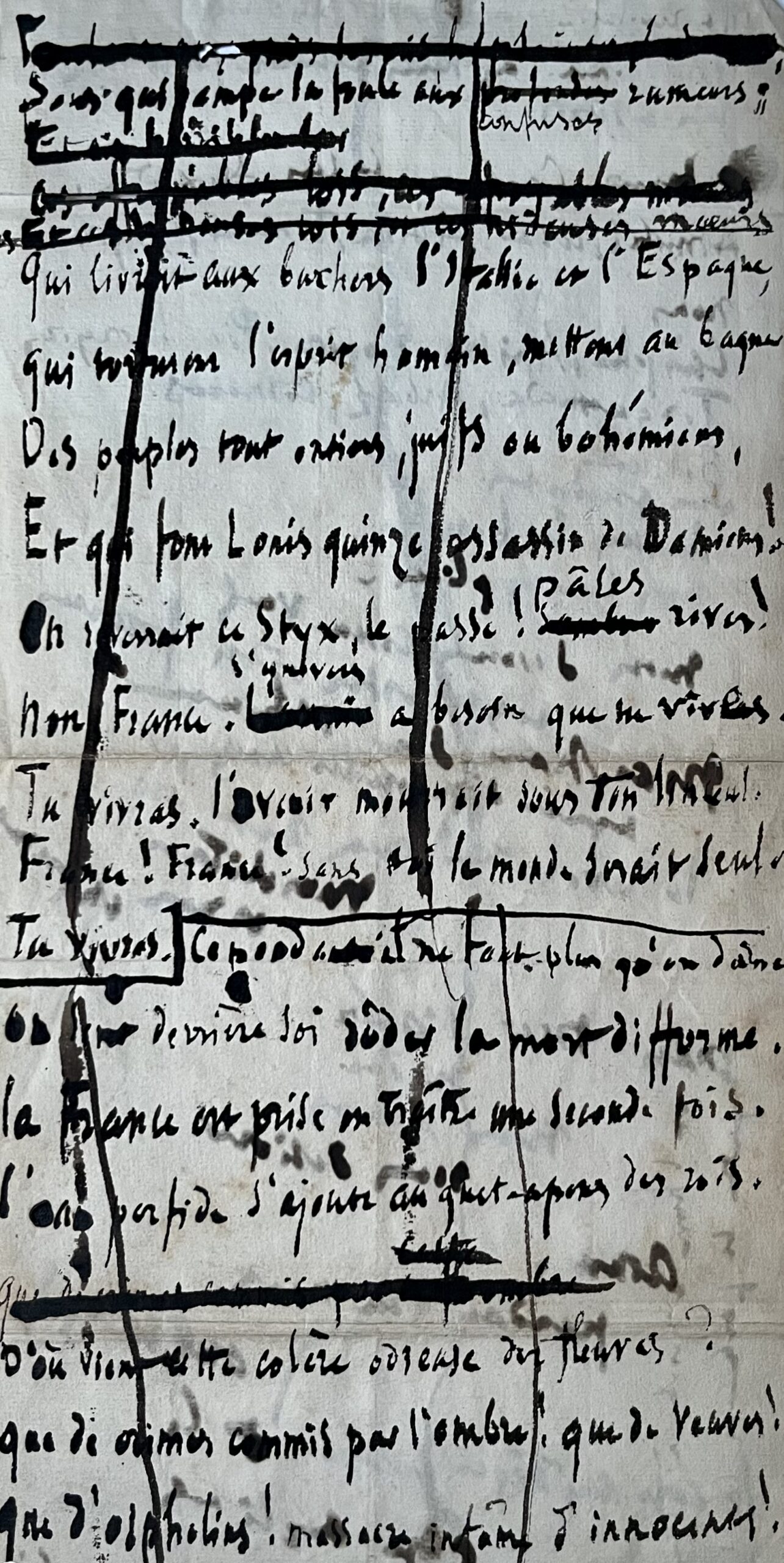 "Sous qui rampe la foule aux confuses rumeurs. [passage biffé] / [Et ces lugubres lois et ces lugubres moeurs, en partie biffé] / Qui livrent aux bûchers l'Italie et l'Espagne, / qui torturent l'esprit humain [au lieu de "Jettent au cabanon Collomb" dans la Pléiade], mettent au bagne / des peuples tout entiers, juifs ou bohémiens, / et qui font Louis Quinze assassin de Damiens ! / On reverrait ce Styx, le passé ! Pâles [mornes] rives ! / Non France, l'univers a besoin que tu vives. / Tu vivras, l'avenir mourrait sous ton linceul. / France ! France ! Sans toi le monde serait seul. / Tu vivras. Cependant il ne faut plus [pas] qu'on dorme / on sent derrière soi rôder la mort difforme. / La France est prise en traitre une seconde fois / L'eau perfide s'ajoute au guet-apens des rois. / D’où vient cette colère odieuse des fleuves ? / Que de crimes commis par l’ombre ! [L'eau devient un suaire et tout meurt]. Que de veuves ! / Que d’orphelins ! Massacre infâme d’innocents !".