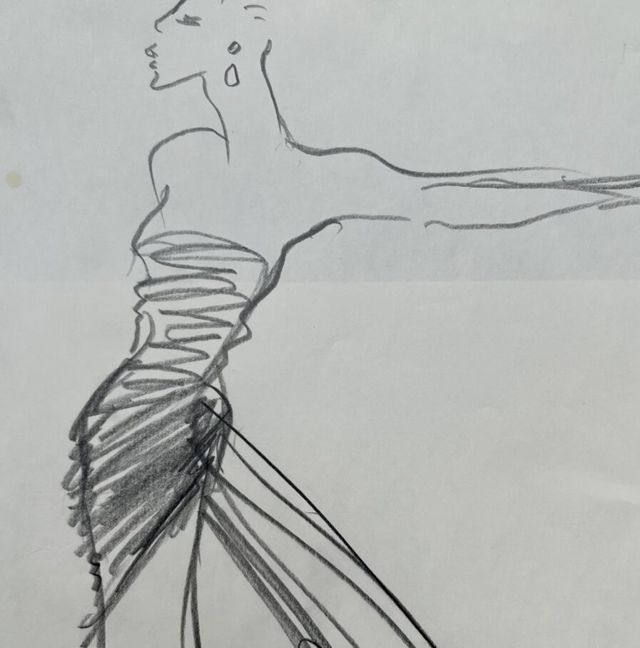 Grand dessin de mode de la main d'Yves Saint-Laurent, au crayon à papier, non signé.