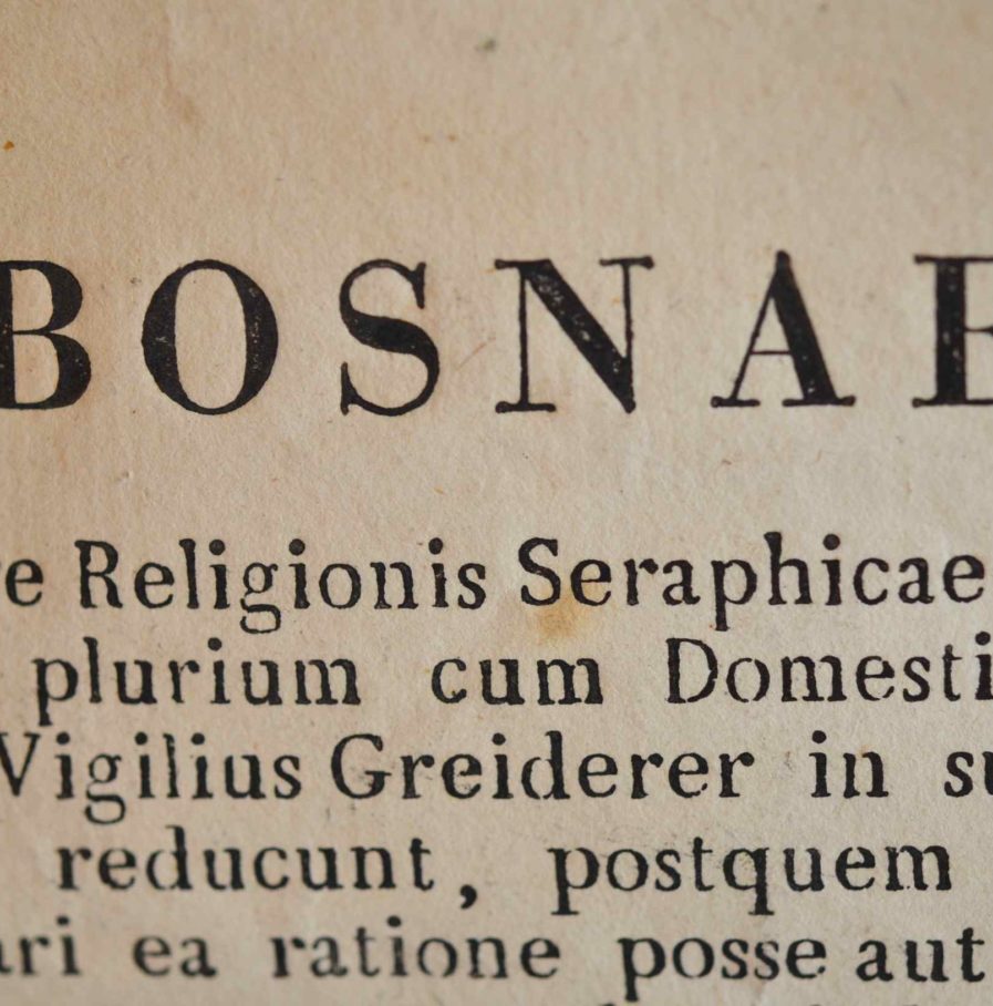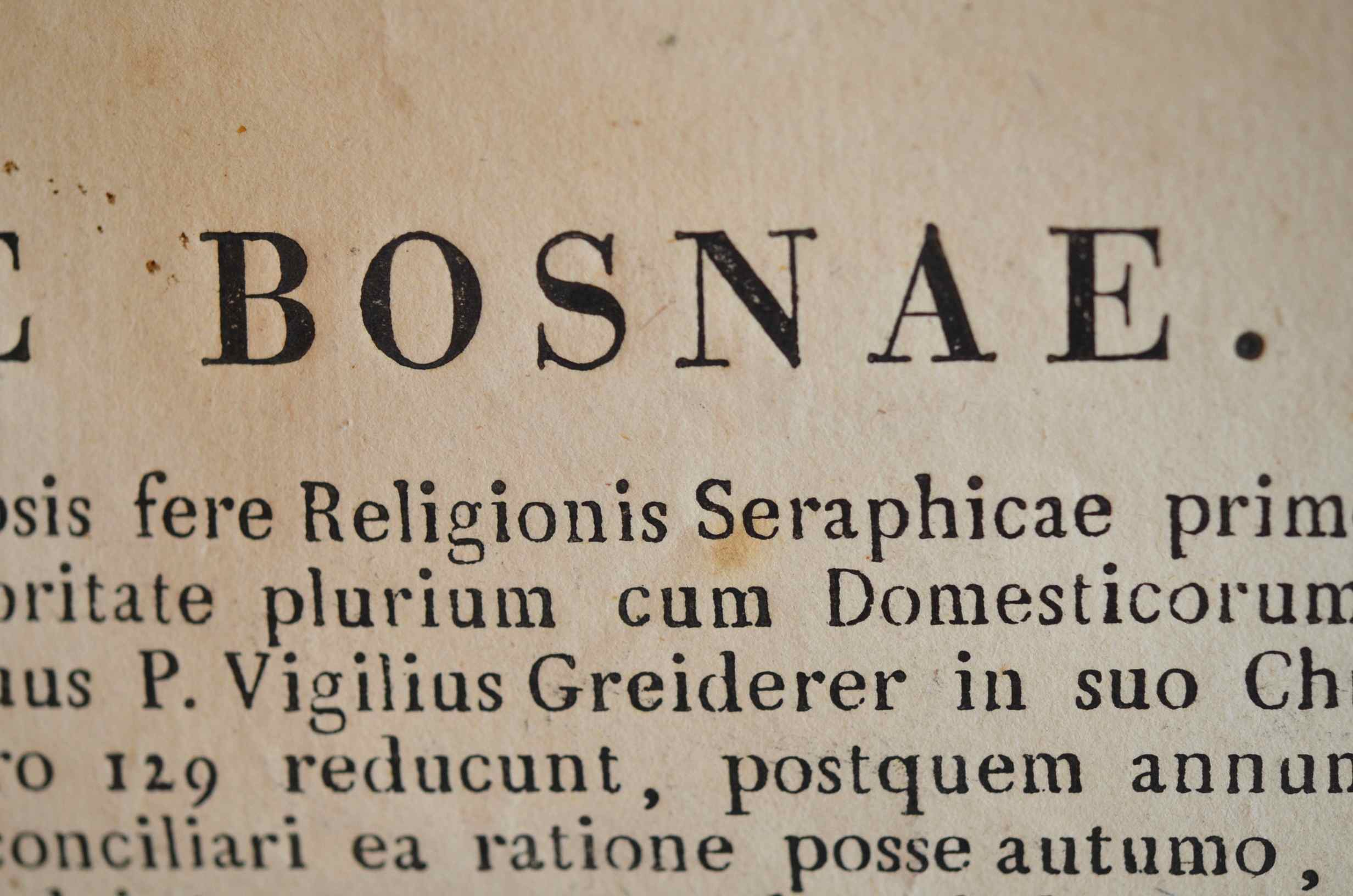 Description : Rare tableau chronologique des vicaires de l'Eglise bosniaque, de 1340 à 1820, intitulé Rigo Vicariae Bosnae. Le document a été complété à la main jusqu'à l'année 1854.