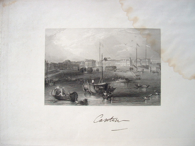 Jolie vue animée du port de Canton, en Chine, au milieu du XIXe. Gravure sur acier, gravée par H. Jorden d´après H. Melville.