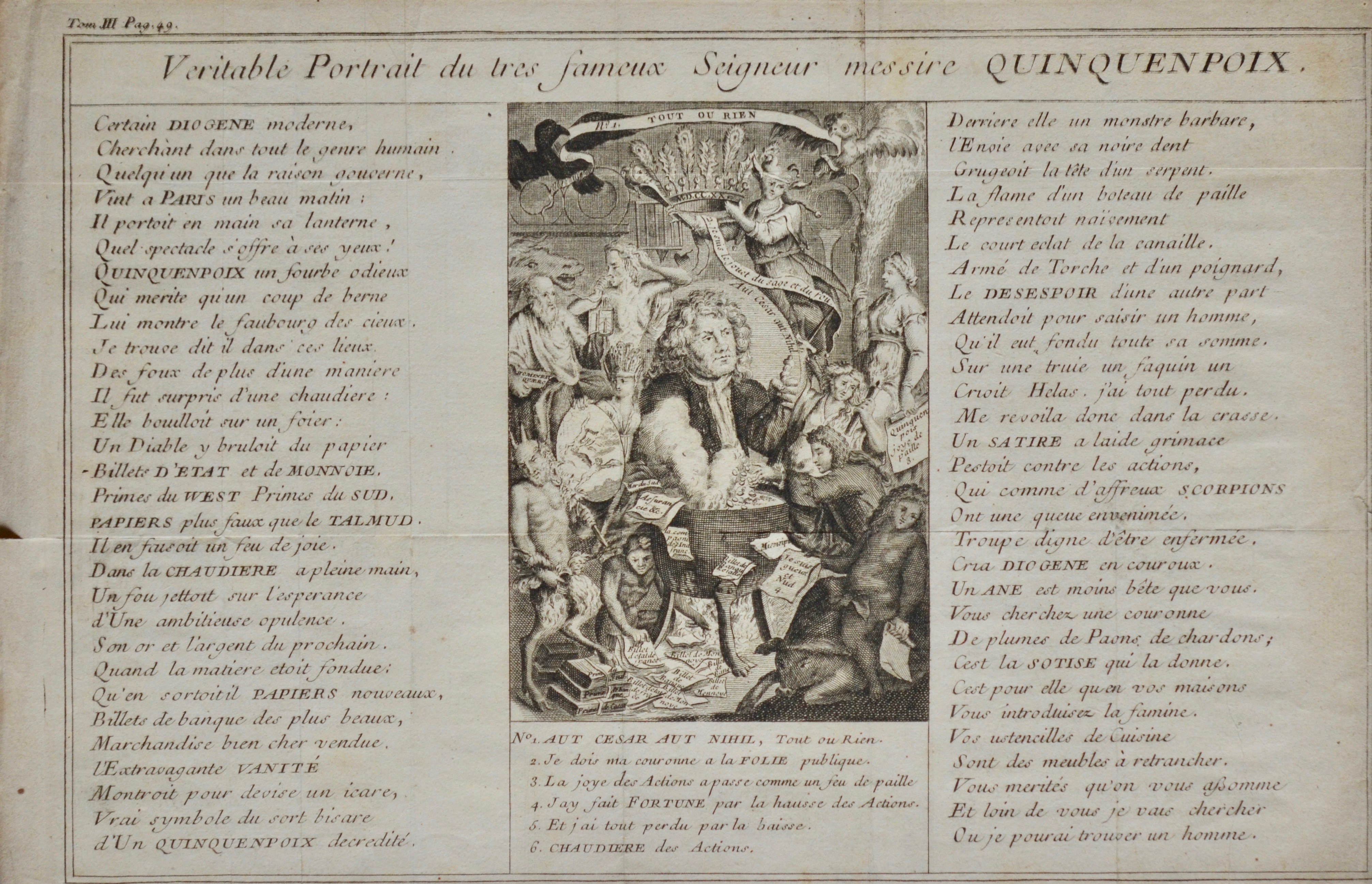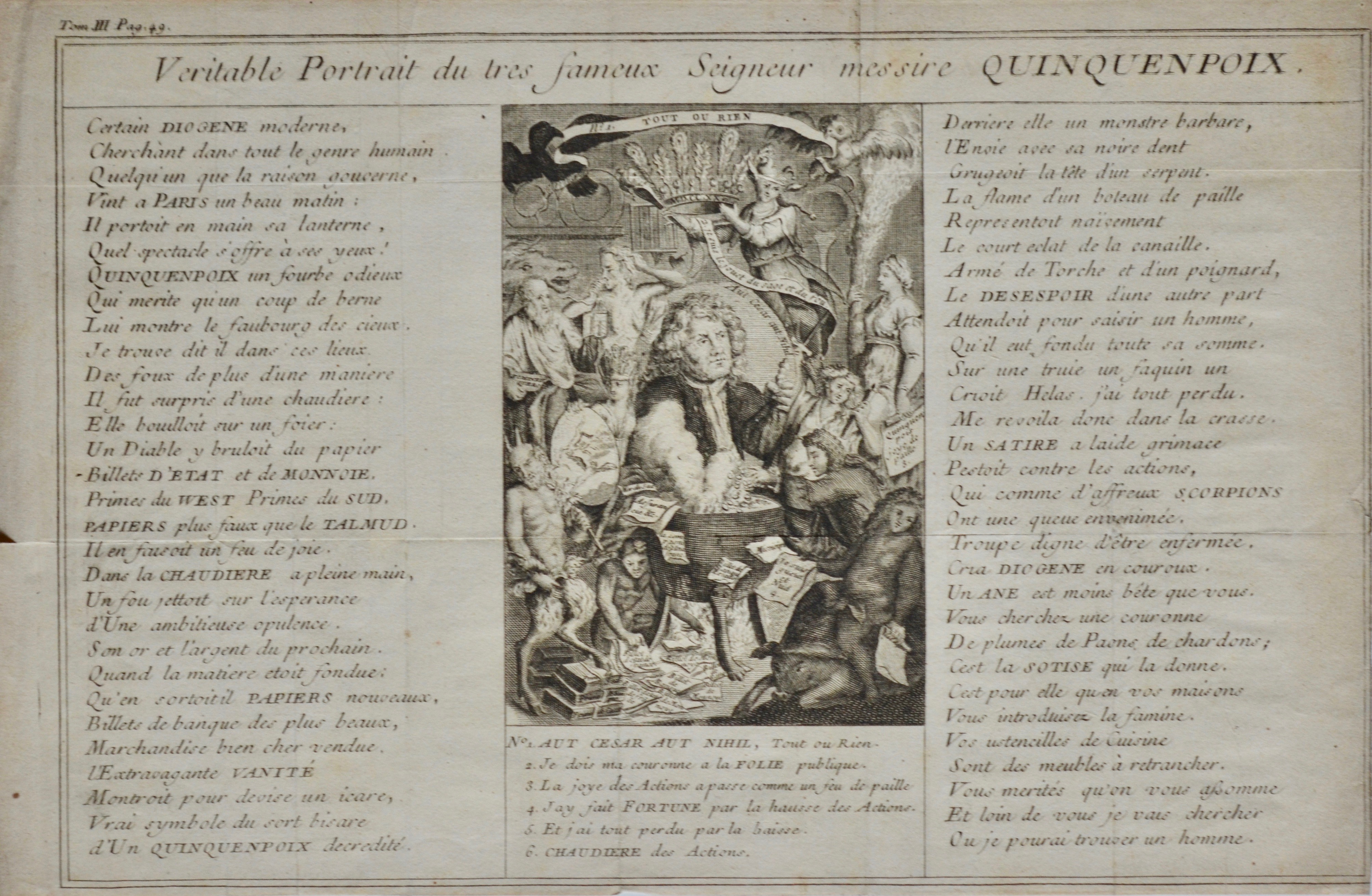 Belle gravure à l'eau-forte extraite d'un ouvrage (Tom III, p. 49), intitulée « Véritable portrait du très fameux Seigneur messire Quinquenpoix ». Gravure satyrique sur l'économie, figurant un homme au dessus d'un chaudron bouillonnant, entouré de satyres, hiboux, sangliers, etc., encadré d'un texte en vers : "Certain Diogène moderne / Cherchant dans tout le genre humain / Quelqu'un que la raison gouverne / Vint à Paris un beau matin [...]"