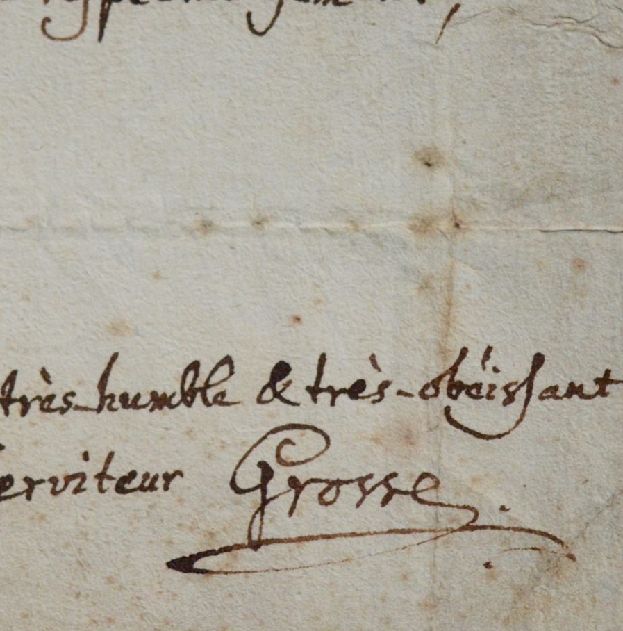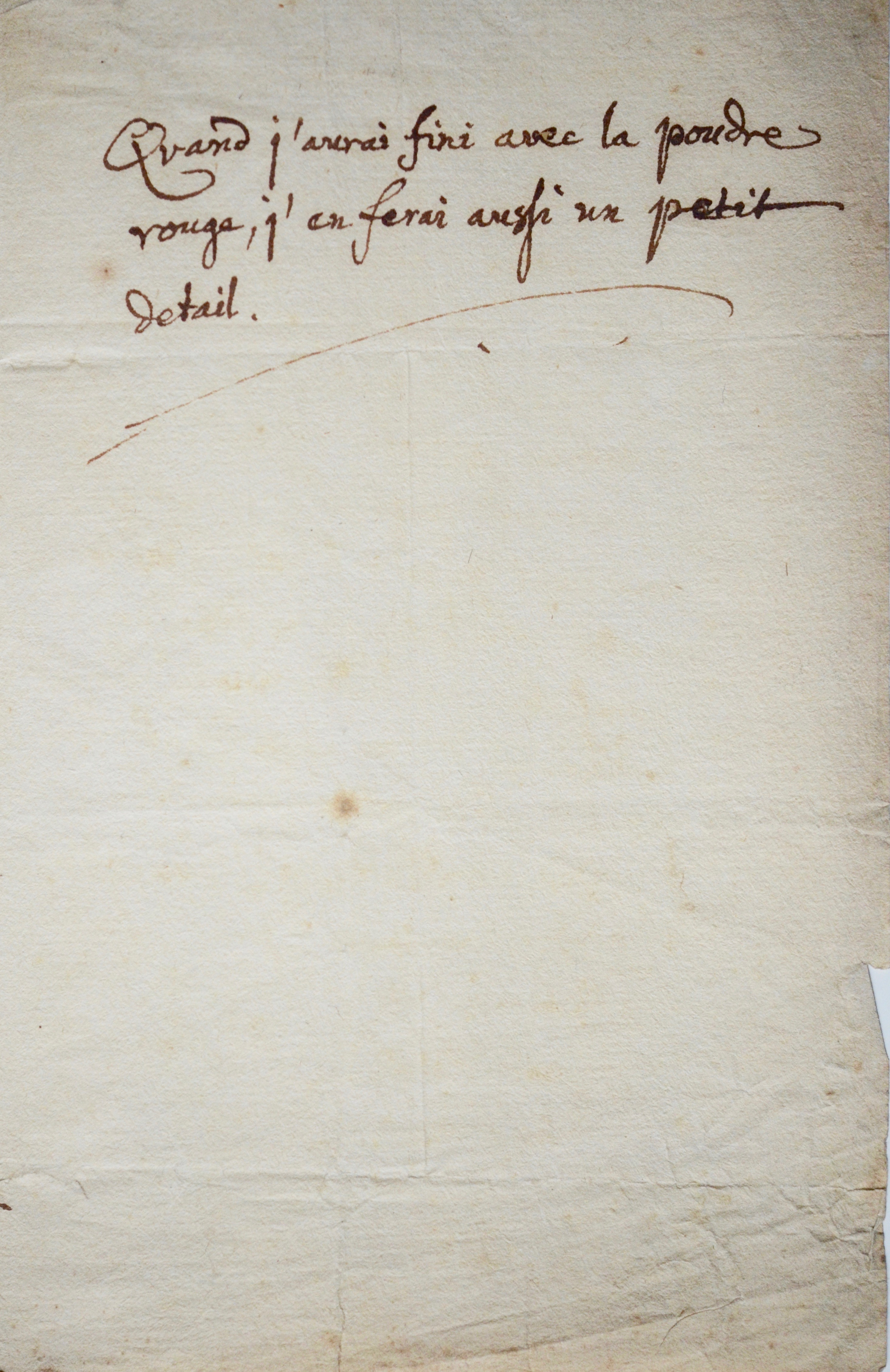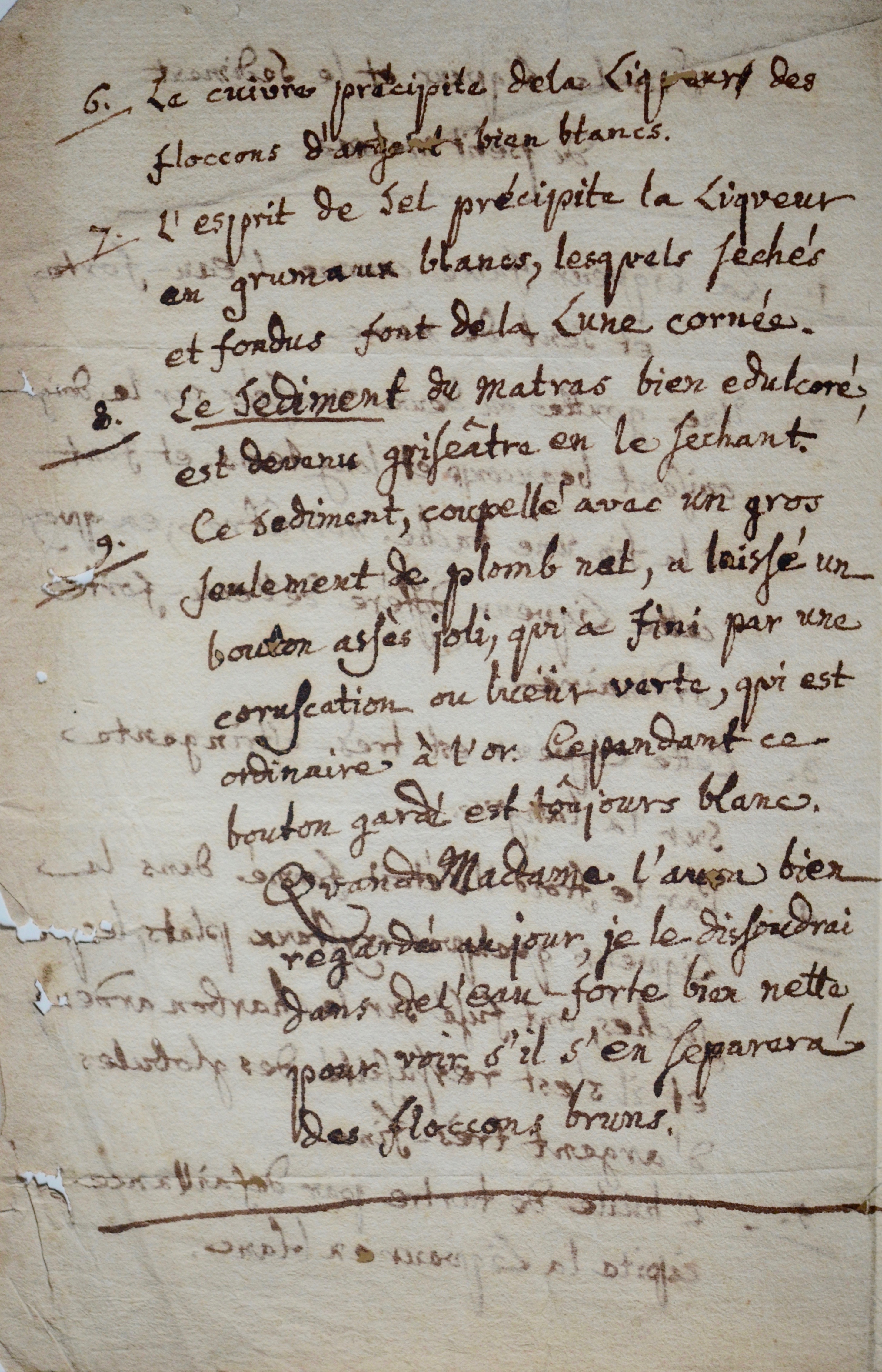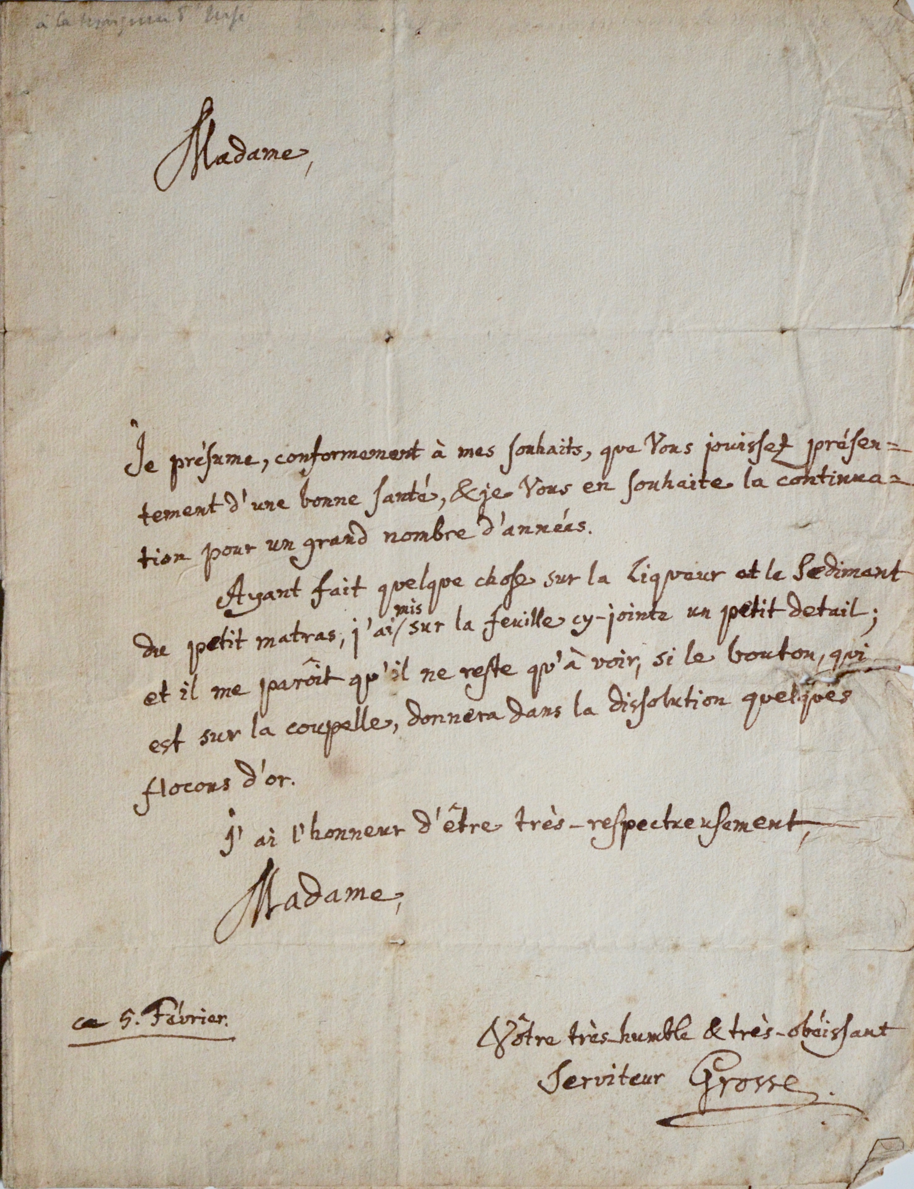 "[...] Je présume, conformément à mes souhaits, que vous jouissez présentement d'une bonne santé, & je vous en souhaite la continuation pour un grand nombre d'année. Ayant fait quelque chose sur la liqueur et le sediment du petit matras, j'ai mis sur la feuille cy-jointe un petit détail ; et il me paroît qu'il ne reste qu'à voir si le bouton, qui est sur la coupelle, donnera dans la dissolution quelques flocons d'or [...]".