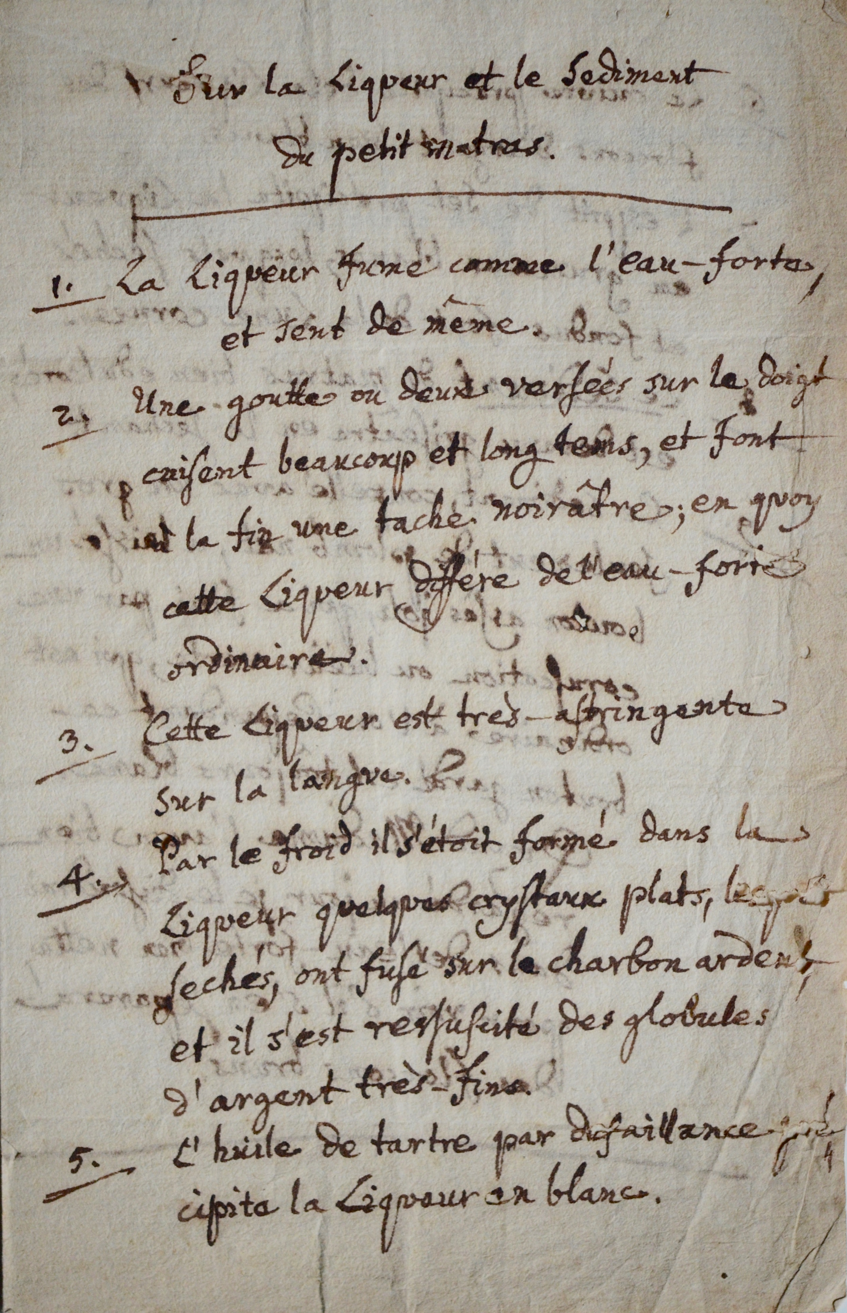 Le manuscrit joint à la lettre, intitulé Sur la Liqueur et le Sediment du petit matras détaille minutieusement toutes les étapes de l'expérience d'alchimie de Grosse :