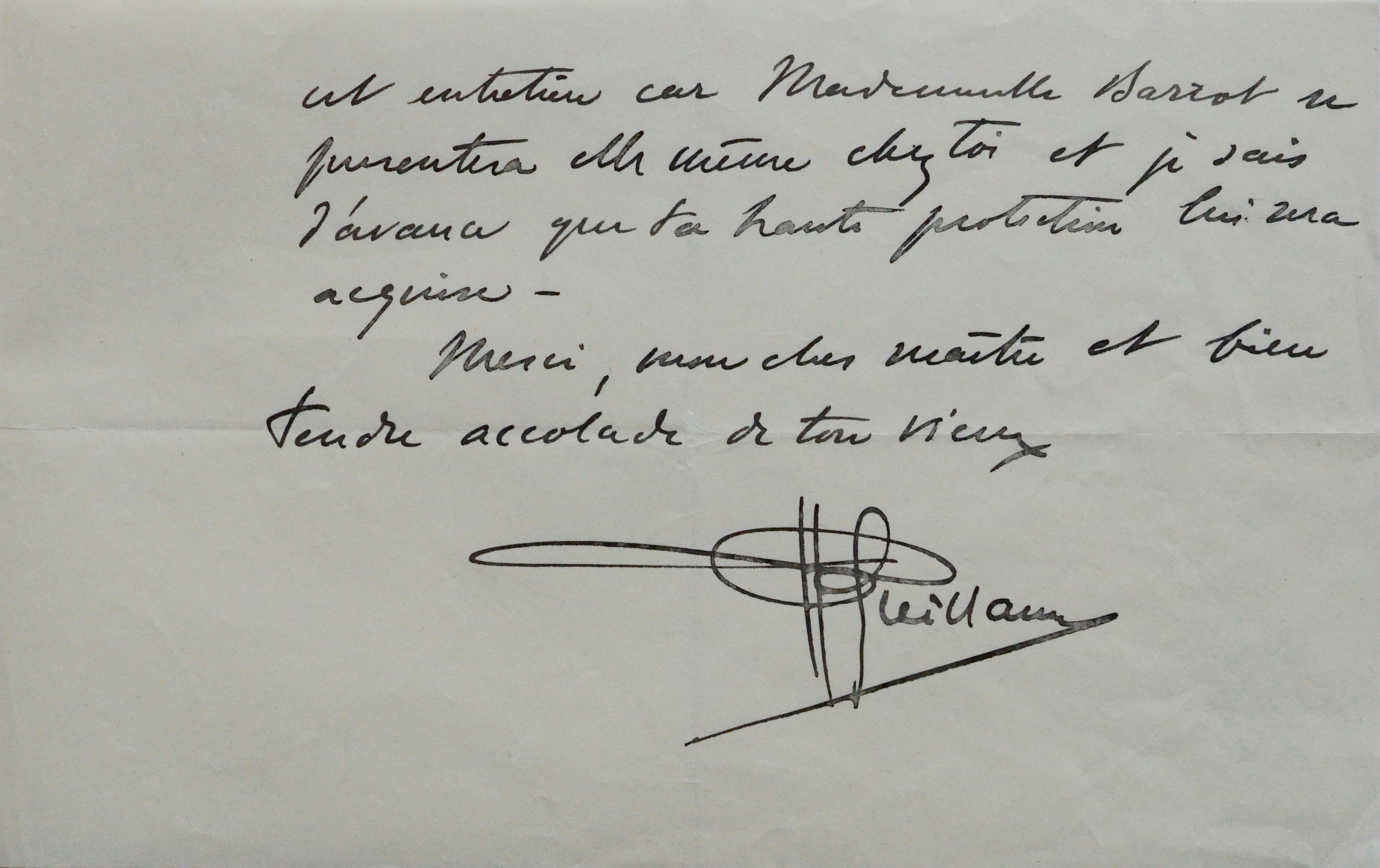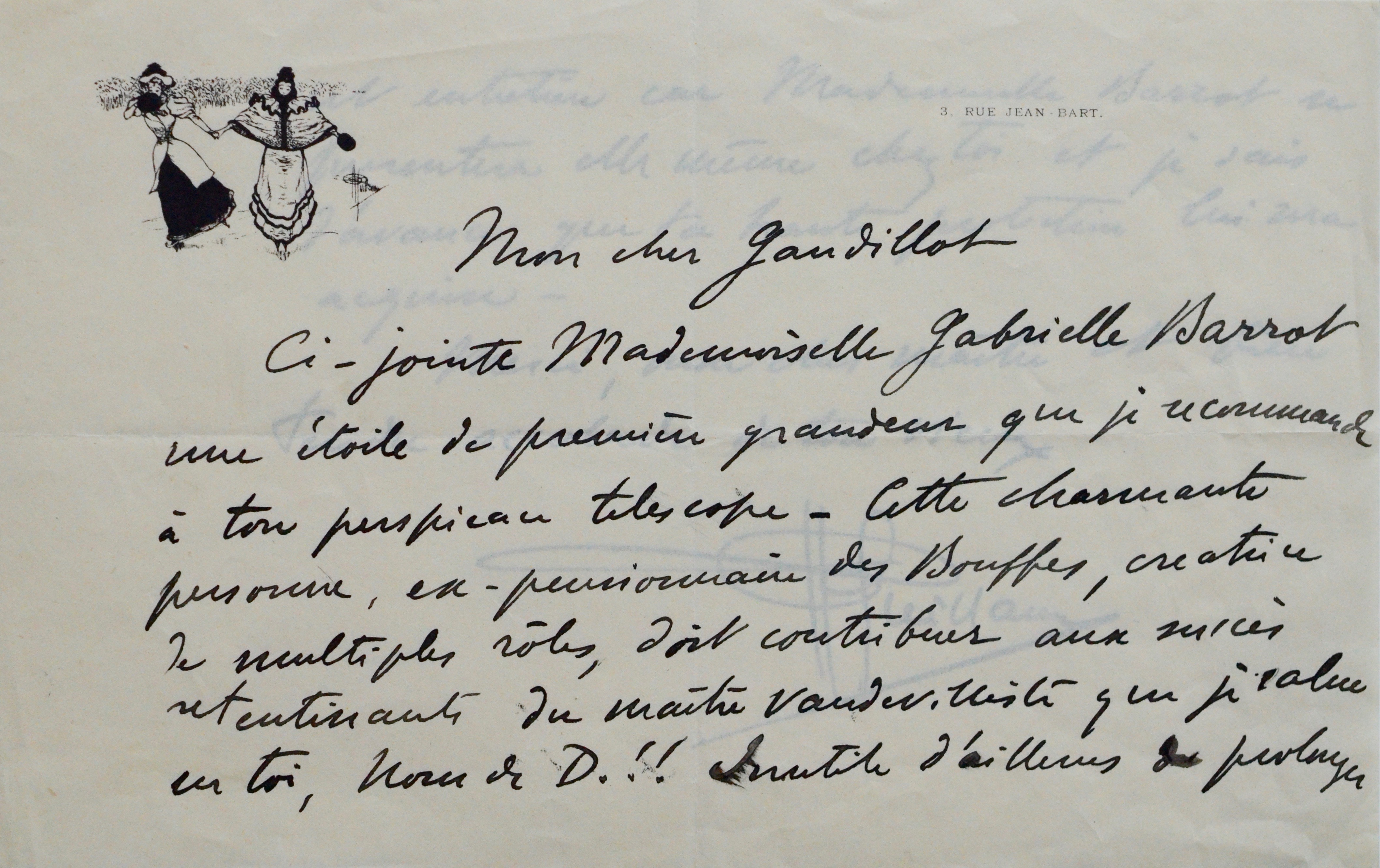 Guillaume recommande une amie actrice : "Mon cher Gandillot. Ci-jointe Mademoiselle Gabrielle Barrot une étoile de première grandeur que je recommande à ton perspicace télescope. Cette charmante personne, ex-pensionnaire des Bouffes, créatrice de multiples rôles, doit contribuer aux succès retentissants du maître vaudevilliste que je salue en toi, nom de D. !! Inutile d'ailleurs de prolonger cet entretien car Mademoiselle Barrot se présentera elle même chez toi et je sais d'avance que ta haute protection lui sera acquise. Merci, mon cher maître et bien tendre accolade de ton vieux [...]".