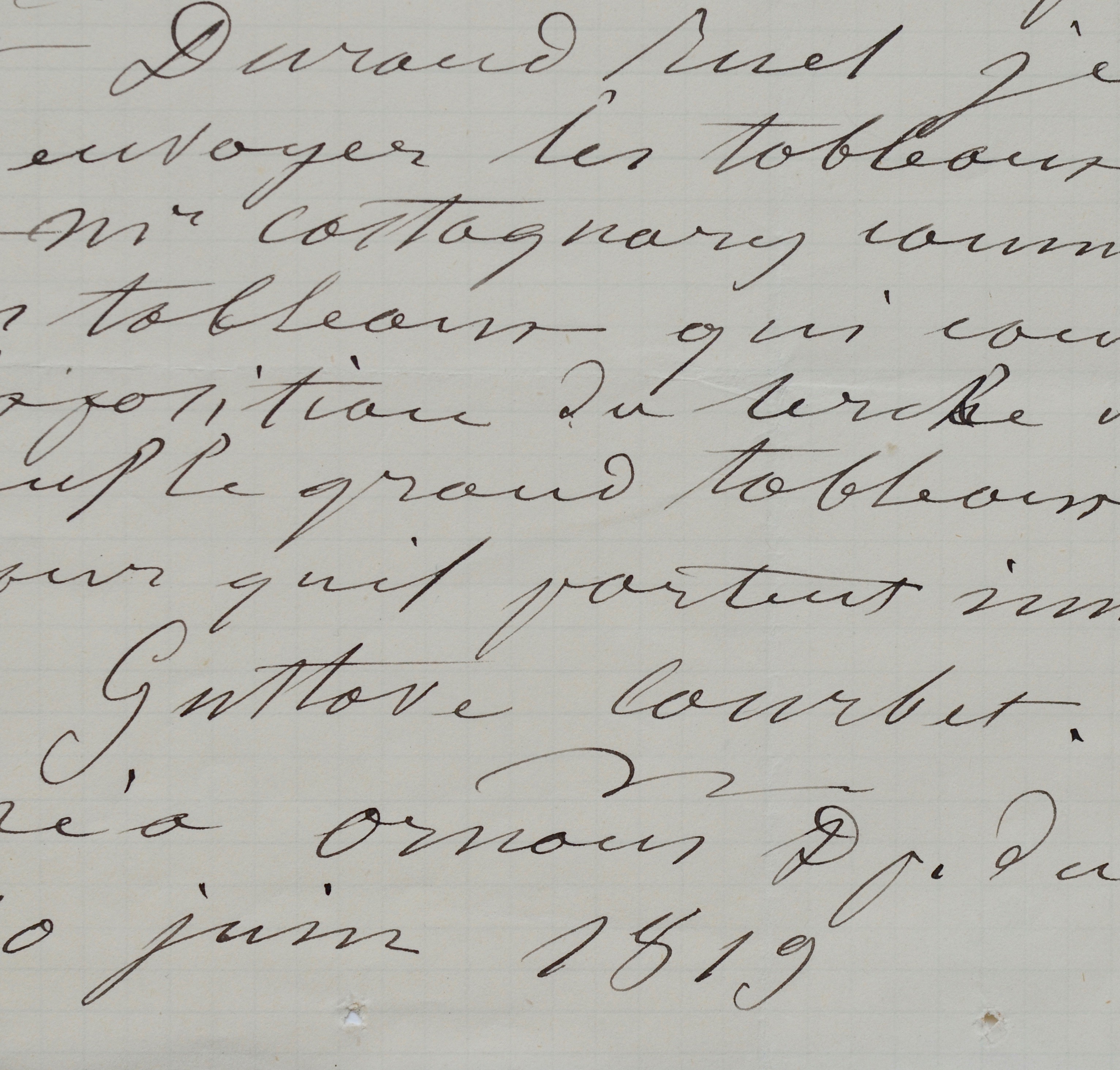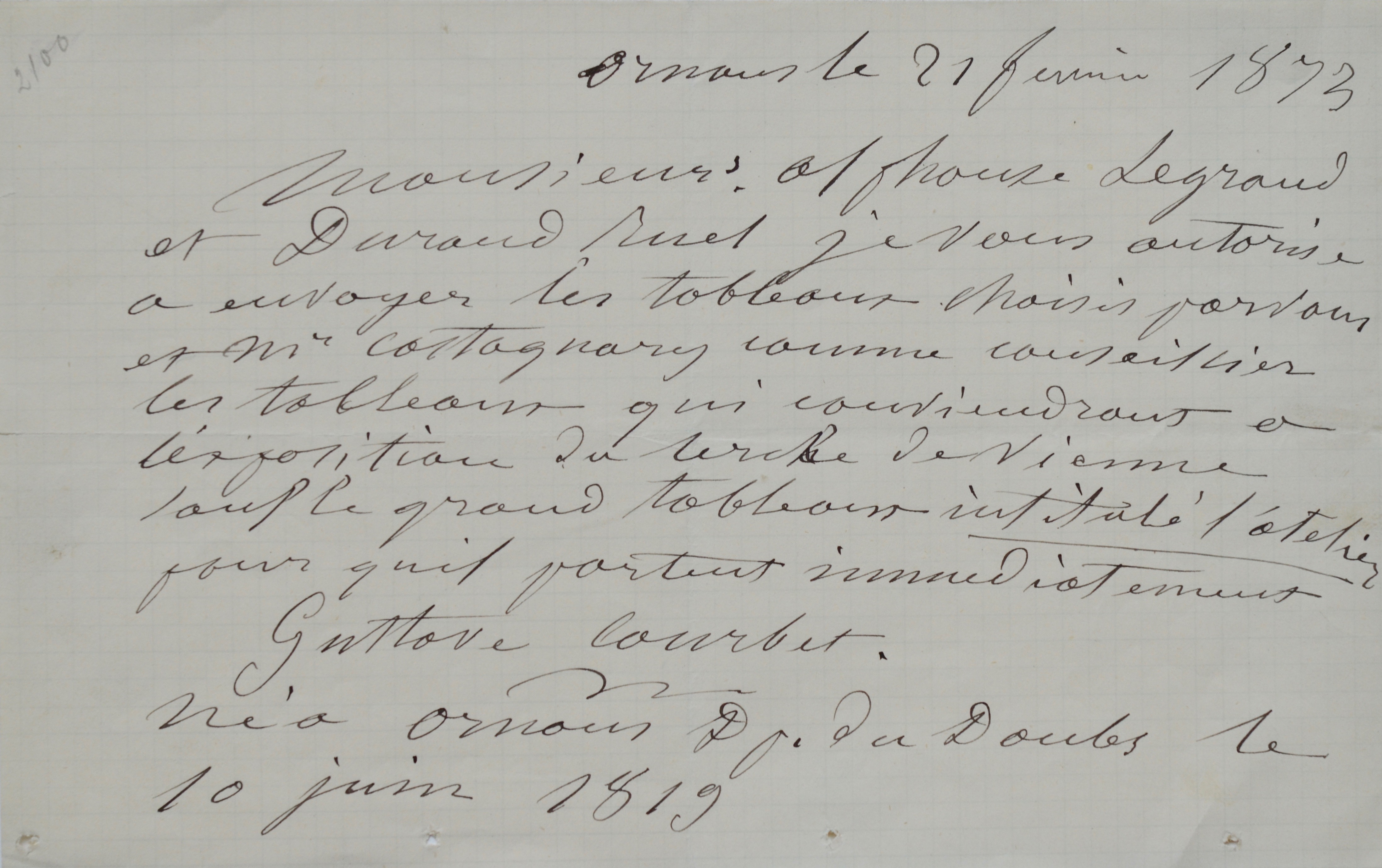 Gustave Courbet (Ornans, 1819/1877)Courbet invite Durand-Ruel et son collaborateur à choisir des tableaux pour l'exposition du Cercle Artistique de Vienne, durant l'Exposition universelle qui eut lieu à Vienne de mai à octobre 1873. "Je vous autorise à envoyer les tableaux choisis par vous et Mr Castagnary comme conseillier [sic] les tableaux qui conviendront à l’exposition du cercle de Vienne sauf le grand tableau intitulé l’Atelier pour qu’ils partent immédiatement". Il fait suivre sa signature de cette curieuse mention "né à Ornans Dp. du Doubs le 10 juin 1819".