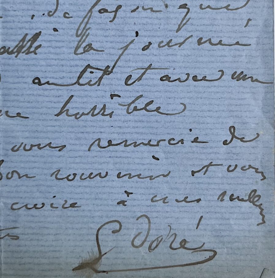 Gustave Doré exprime ses "vifs regrets" de n'avoir pu honorer l'invitation de son correspondant et "de n'avoir pas vu une chose dont je suis très amateur". "Je m'étais rendu malade en restant toute la nuit et la matinée de samedi au bal de la marine" ; il a dû rester alité toute la journée de la veille avec "une migraine horrible".