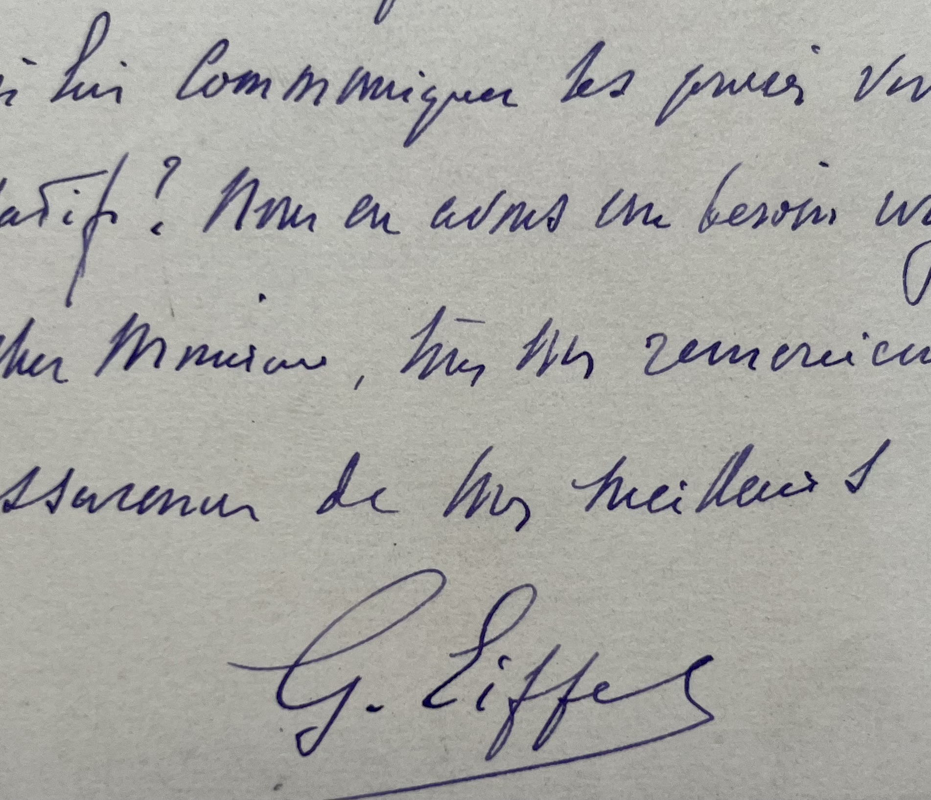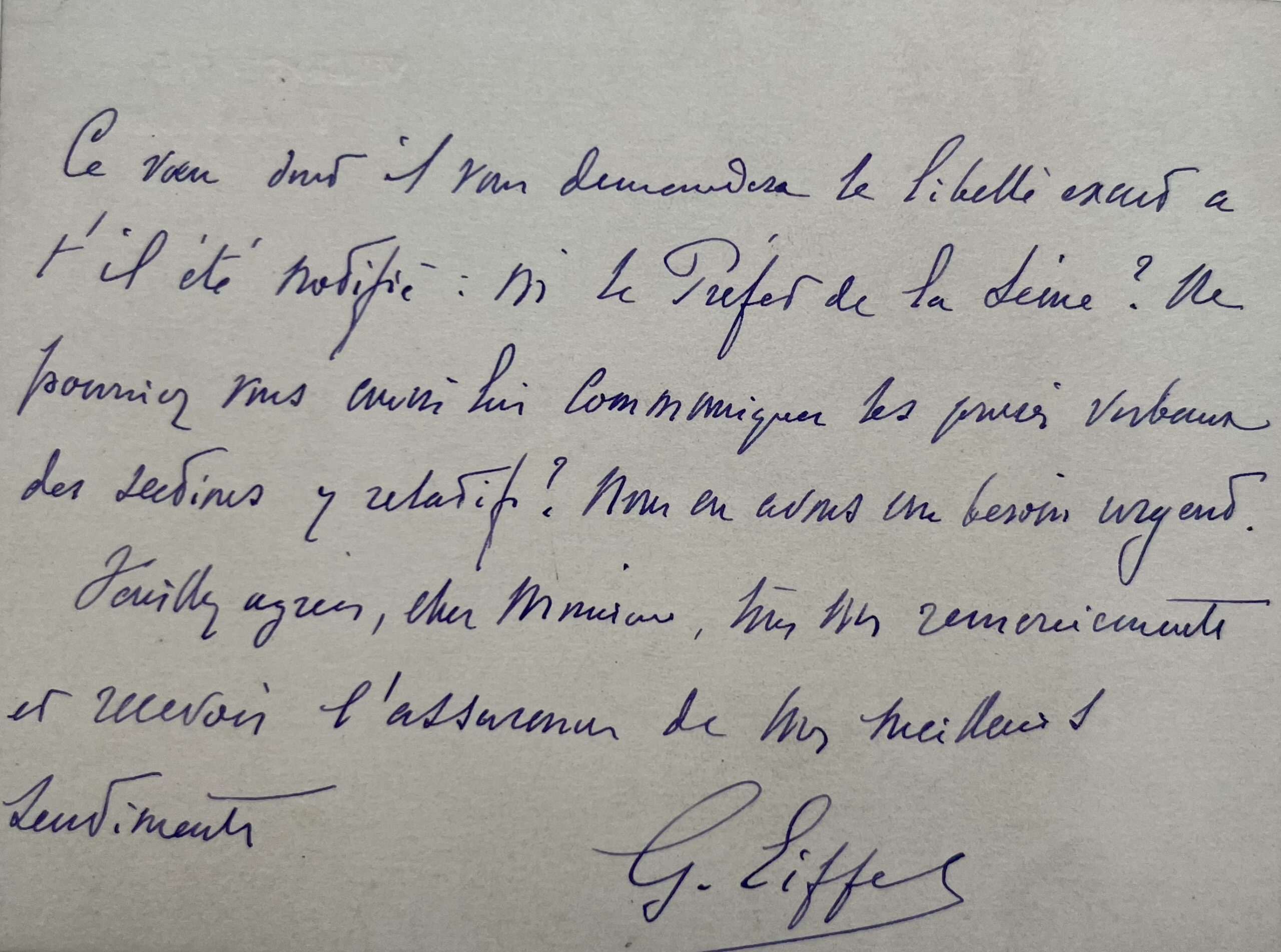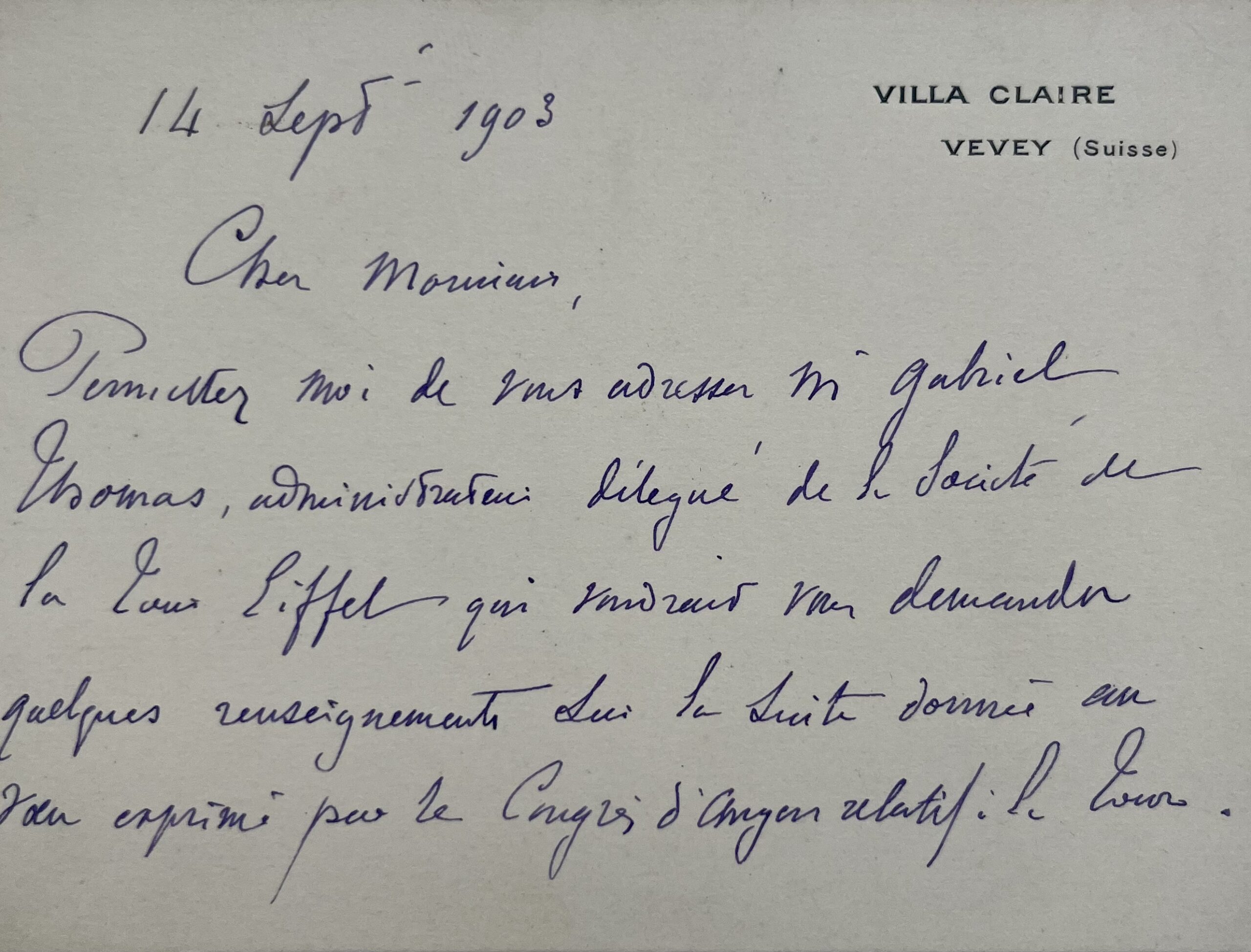 "Permettez moi de vous adresser M. Gabriel Thomas, administrateur délégué de la Société de la tour Eiffel qui voudrait vous demander quelques renseignements sur la suite donnée au voeu exprimé par le Congrès d'Angers relatif à la Tour. Ce voeu dont il vous demandera le libellé exact a-t-il été notifié à M. le Préfet de la Seine ? Ne pourriez vous aussi lui communiquer les procès verbaux des sections relatif ? Nous en avons un besoin urgent. Veuillez agréer, cher monsieur, tous mes remerciements et recevoir l'assurance de mes meilleurs sentiments".