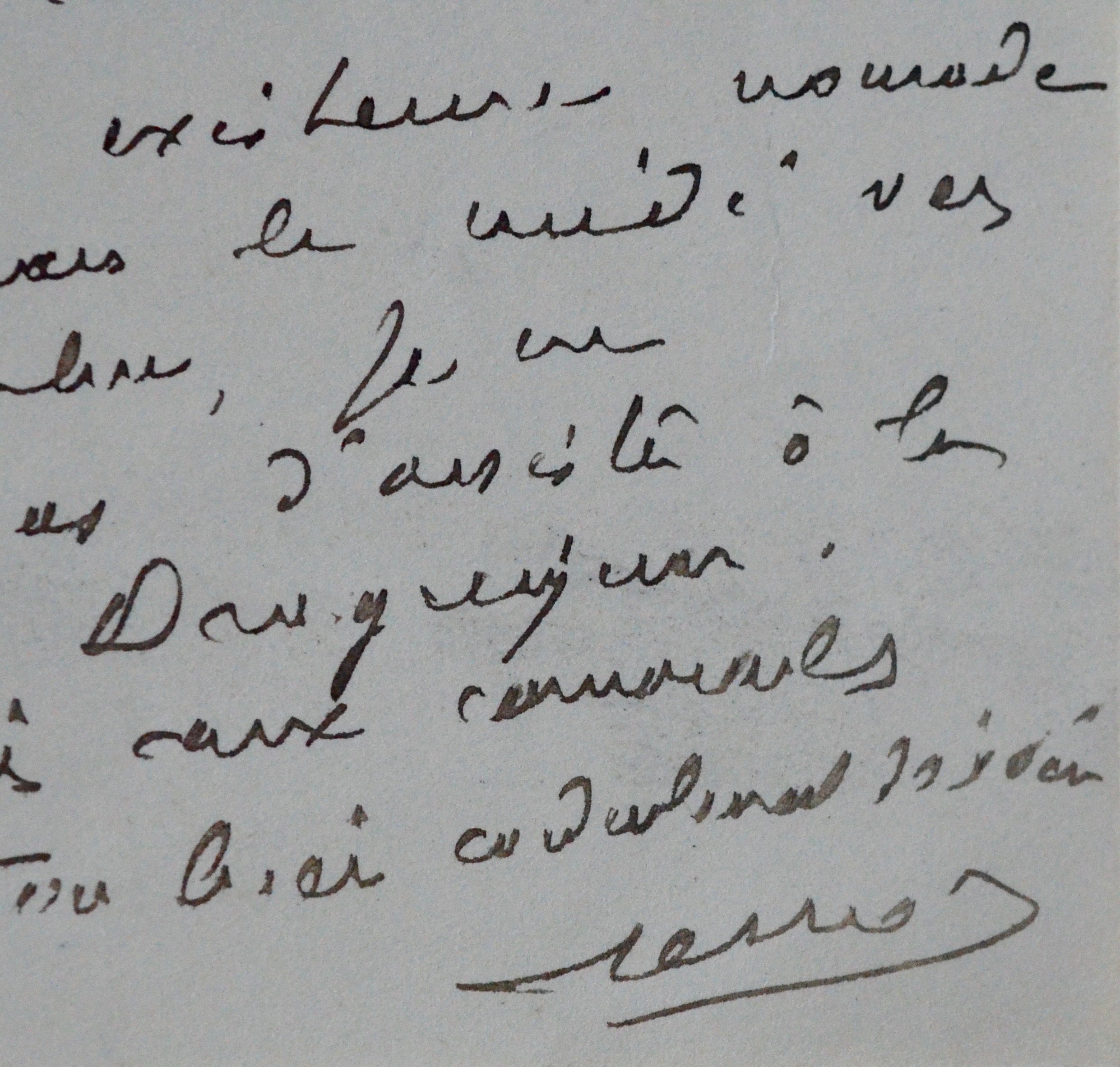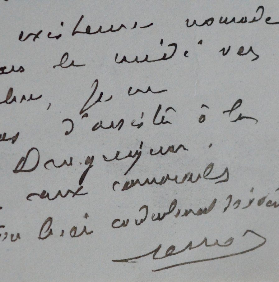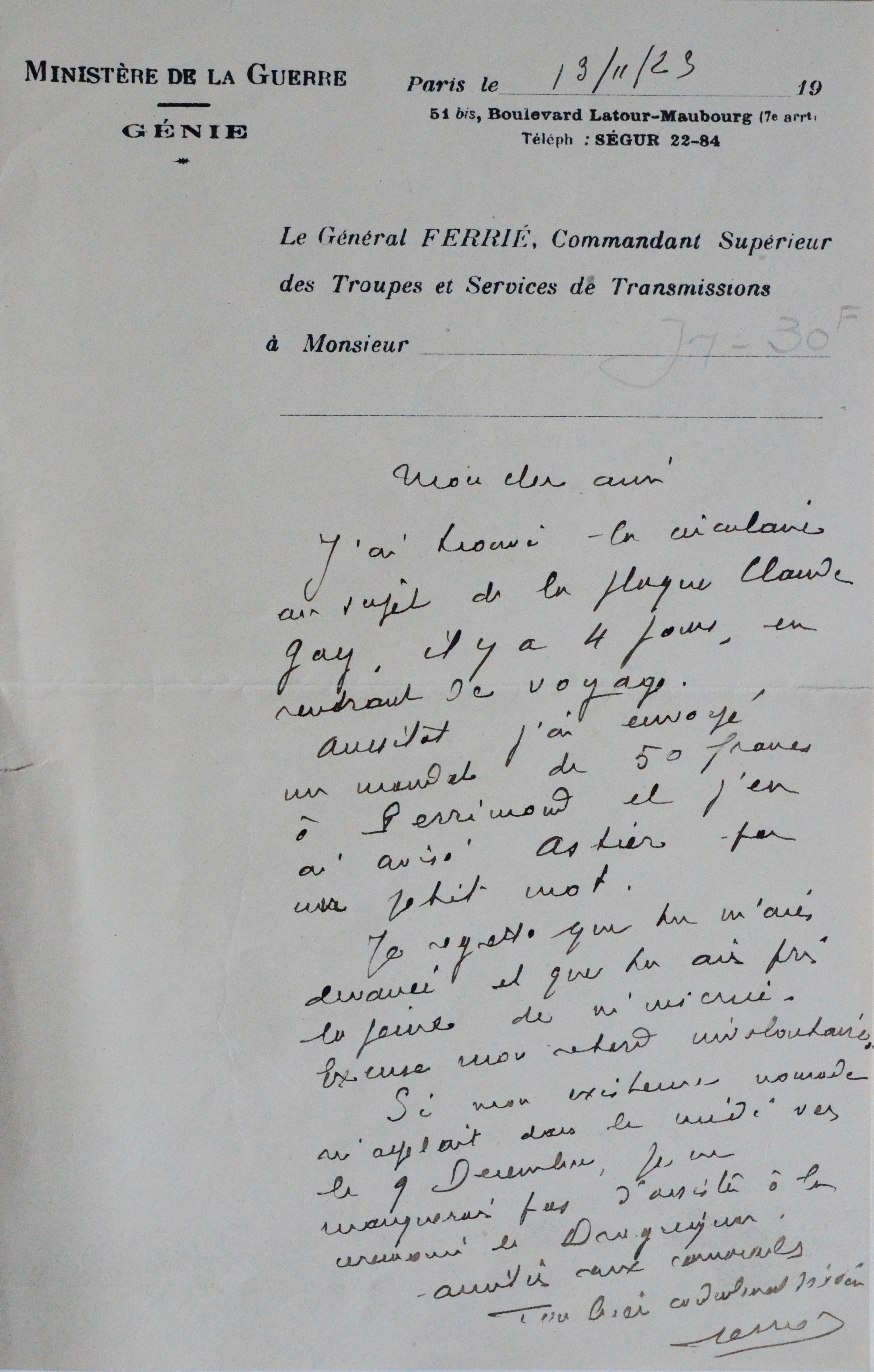 Gustave Ferrié a envoyé à Perrimond 50 francs de participation, pour la plaque commémorative du naturaliste Claude Gay (1800-1873), qui doit être apposée à Draguignan, sa ville natale, à l'occasion du cinquantième anniversaire de sa mort. "[...] Si mon existence nomade m'appelait dans le midi vers le 9 décembre, je ne manquerais pas d'assister à la cérémonie de Draguignan [...]".