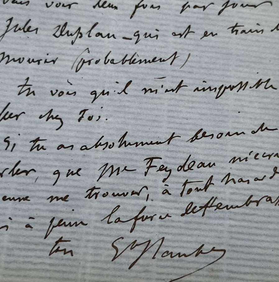 J'ai un eczema en plein visage - avec des douleurs violentes aux épaules. Je soigne mon domestique qui a un rhumatisme articulaire - & je vais voir deux fois par jour Jules Duplan - qui est en train de mourir (probablement). Tu vois qu'il m'est impossible d'aller chez toi. Si tu as besoin de me parler, que M. Feydeau m'écrive ou vienne me trouver, à tout hasard. J'ai à peine la force de t'embrasser".