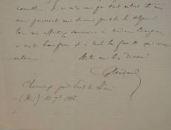 Gustave Nadaud (Roubaix, 1820/1893)Amusante lettre de Gustave Nadeau, en transit chez ses soeurs dans les Alpes, avant son départ pour l'Italie. "J'ai ri aux éclats en lisant la lettre de Prévost que vous m'avez adressée. Il aurait eu beau déguiser son écriture et le ma faire envoyer de Tombouctou que j'aurais reconnu mon Antonin. Il n'y en a qu'un au monde. Voir un opéra comique dans les deux momies, il faut véritablement en voir partout". Il analyse ensuite l'histoire écrite par son correspondant et sa possibilité de la porter sur scène. "[...] Enfin les trois principaux auteurs ne se trouvent jamais ensemble, ce qui rend impossible tout duo, trio, etc. Mais j'ai tant ri que j'en ri encore [...]". Il évoque ensuite les affaires d'Italie et taquine son correspondant pour qu'il vienne l'accompagner dans ce pays. "Je retire tout ce que j'ai dit à une condition : vous conviendrez que quand on a le temps et l'argent, il ne manque que la volonté. Voyez donc : le Saint Gottard, Milan, Venise, Bologne, Rome!... Voilà l'itinéraire [...]".