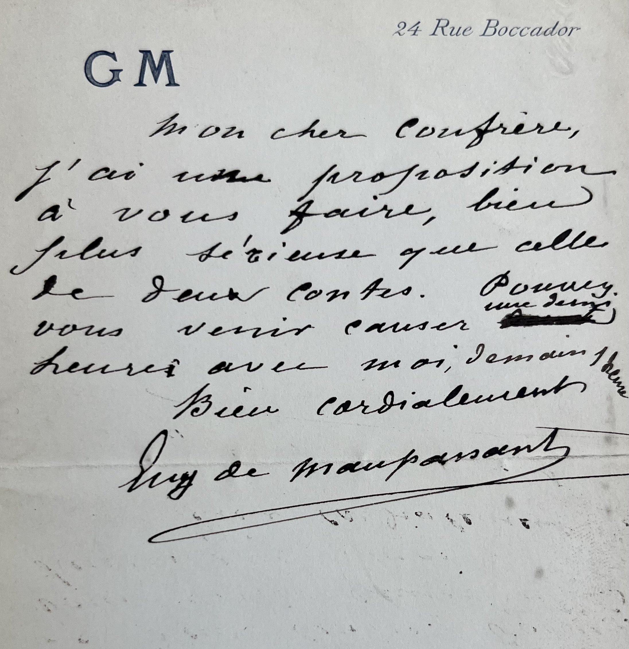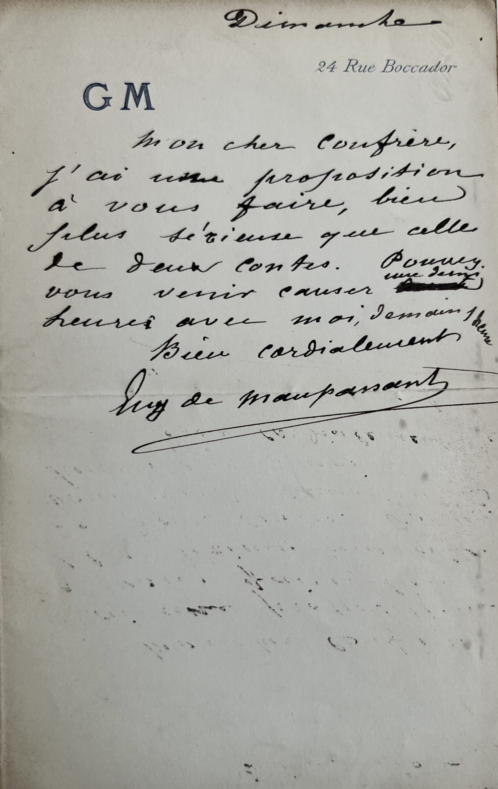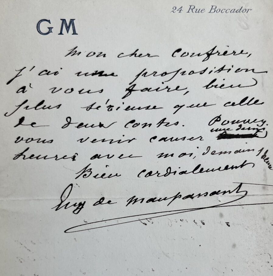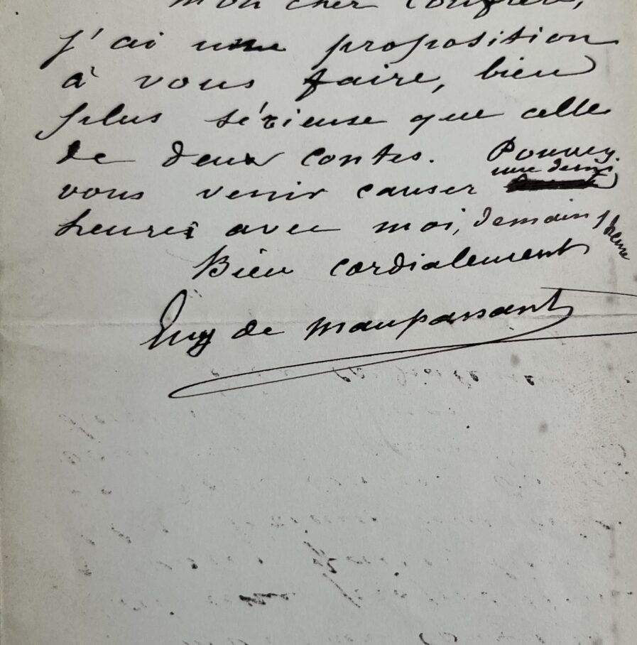 "Mon cher confrère, j’ai une proposition à vous faire, bien plus sérieuse que celle de deux contes. Pouvez-vous venir causer une demi heure avec moi demain 1 heure. Bien cordialement. Guy de Maupassant".