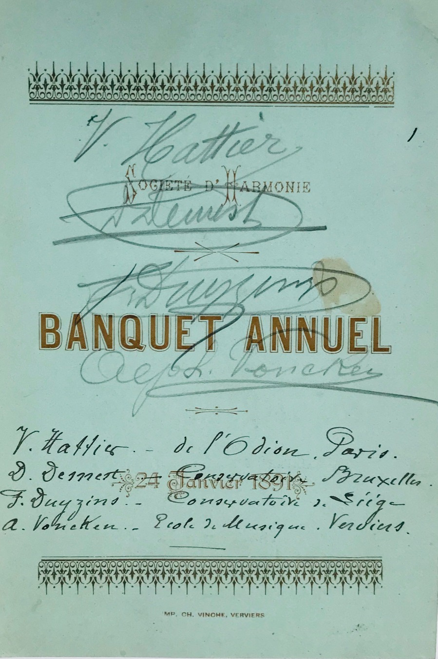 Menu du banquet annuel de la Société Royale d'Harmonie de Verviers, donné le 24 janvier 1891.