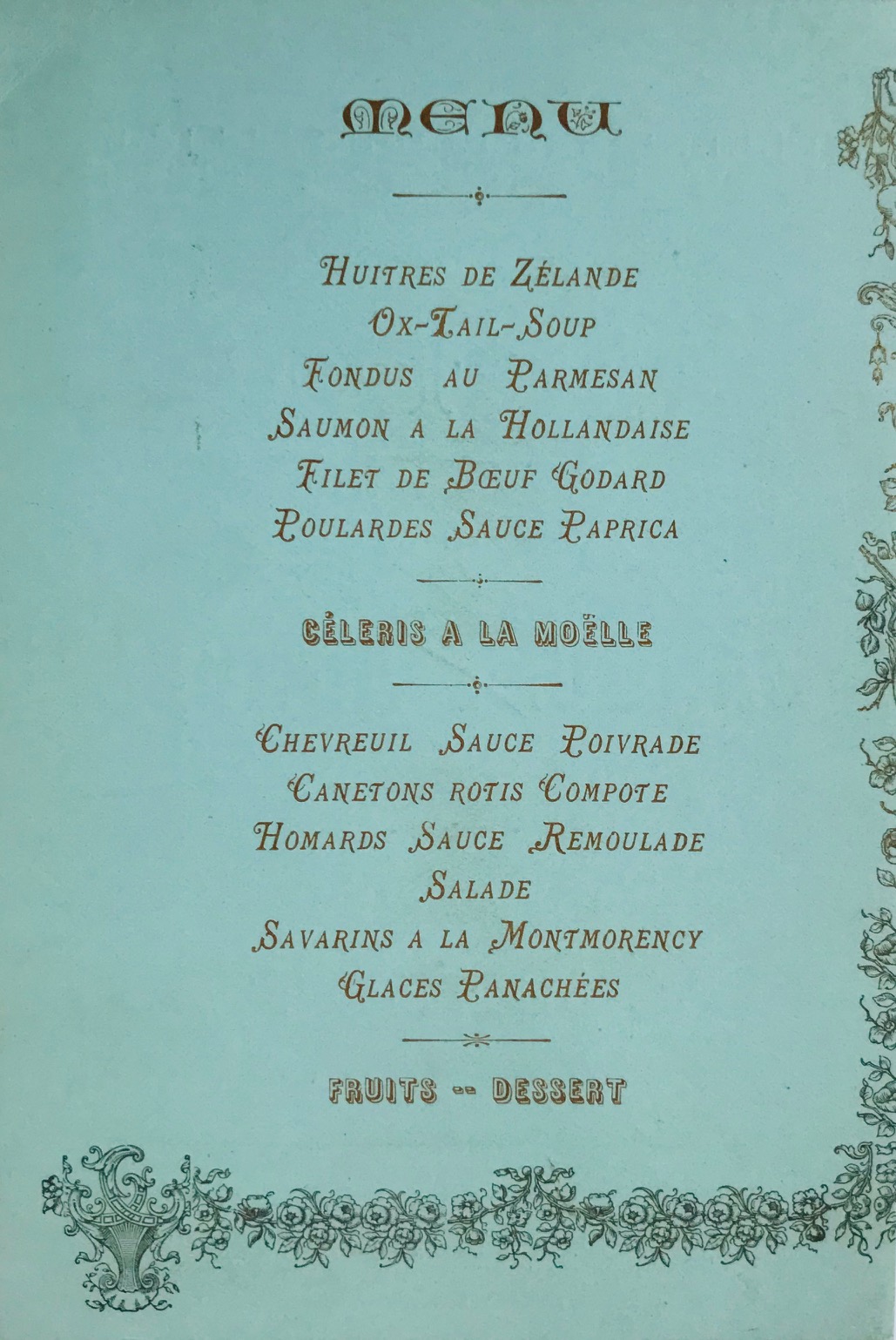 Les noms et fonctions des signataires furent résumés par une autre main, en pied de l'invitation, à l'encre brune. Au verso est imprimé le fastueux menu.